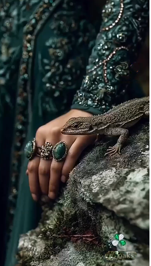 Малахитово-зелёный и теплая золотистая подложка создают игру света и глубины, словно солнечные блики на водной глади.