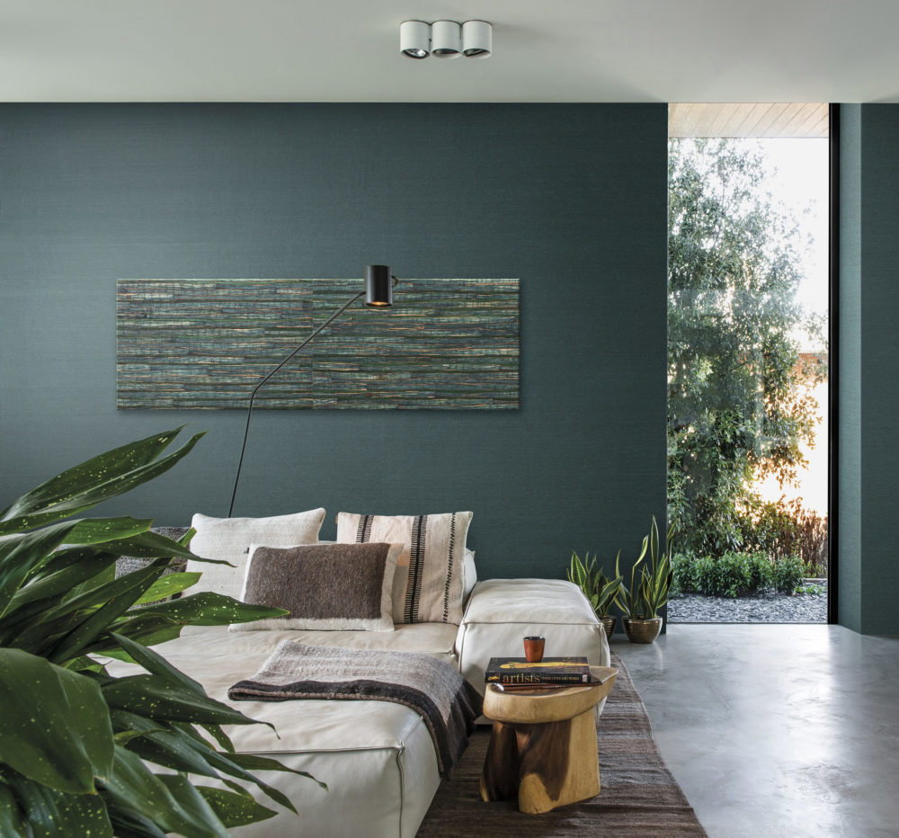 Omexco Portfolio — оттенки малахита с лёгким мерцанием на льняных волокнах.