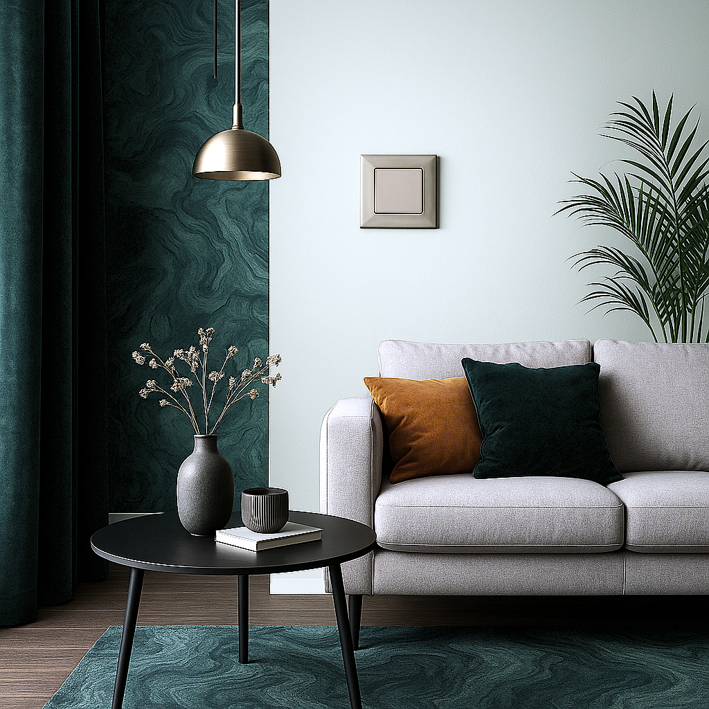 В комбинации с латунью, антрацитом, орехом или золотыми акцентами он раскрывает интерьер как драгоценный камень.