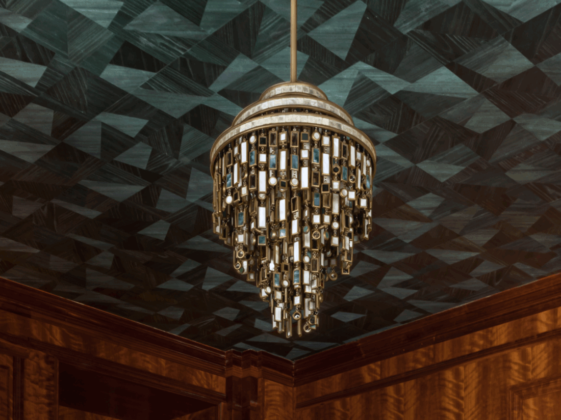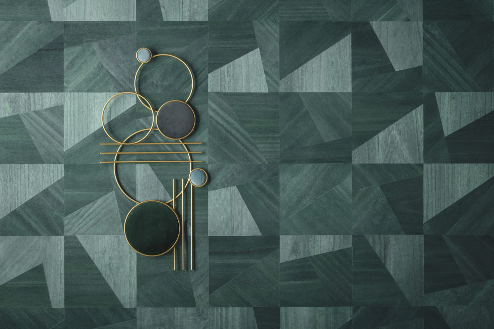 Пластины шпона выложены внахлёст, создавая эффект глубины и лёгкого движения — будто свет играет на полированном дереве платана. Насыщенные малахитово-зелёные и графитовые полутона, выверенная геометрия, которая придаёт интерьеру ритм и спокойствие.