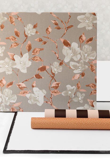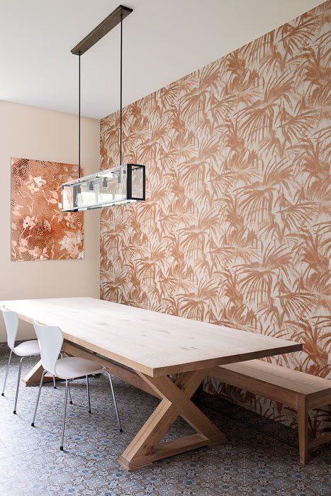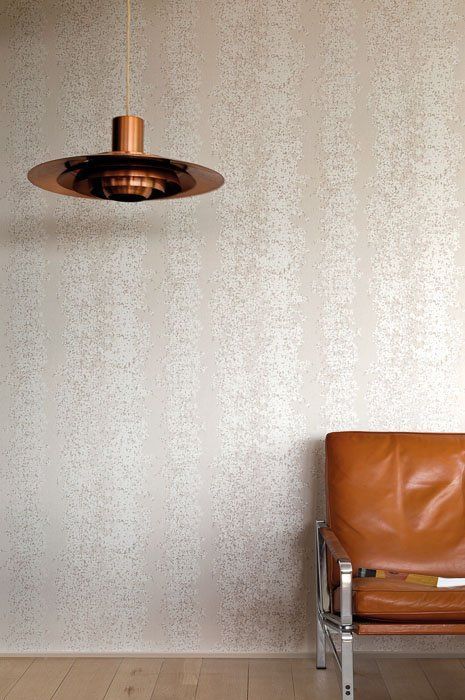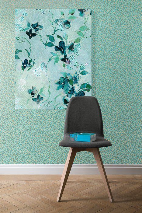 Обои выполнены в красивых цветах, присущих скандинавским интерьерам: бирюзовых, лилово-серых, кофейных и медных тонах.