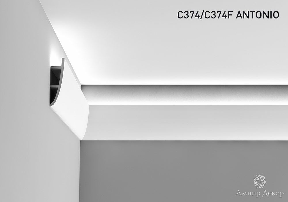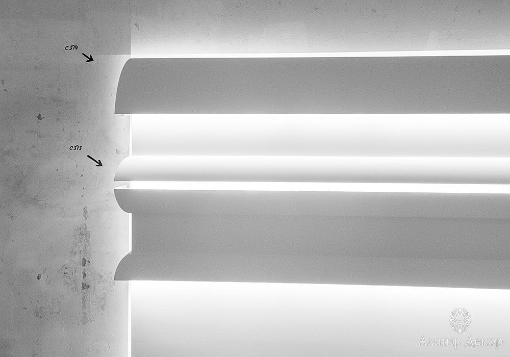 Два карниза из коллекции Antonio различной высоты С373 и С374 позволяют создавать уникальные оптические эффекты благодаря возможности различного направления подсветки. Теперь используя светодиоды, не нужно покрывать внутреннюю часть карниза фольгой, так как длинномеры уже покрыты специальной светоотражающей пленкой. Различные комбинации карнизов позволяют направлять лучи света и создавать дизайнерское пространство. Эти артикулы великолепно сочетаются с новым карнизом С991 из коллекции Luxxus, эффектно отражающим свет, а также имеют гибкие аналоги С373F и С374F, открывая декораторам безграничные возможности в декоре интерьера.