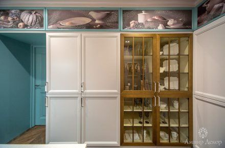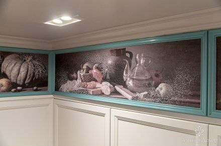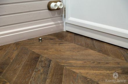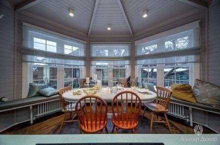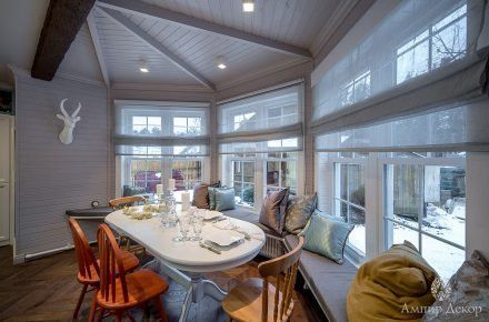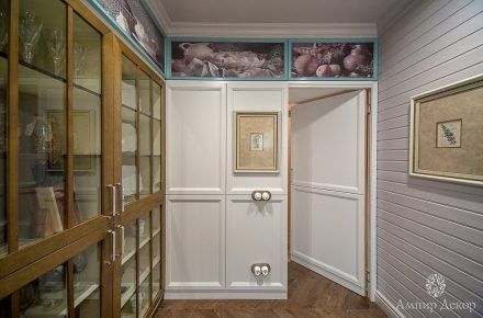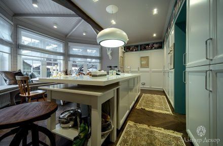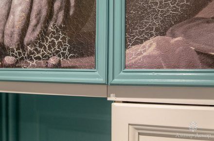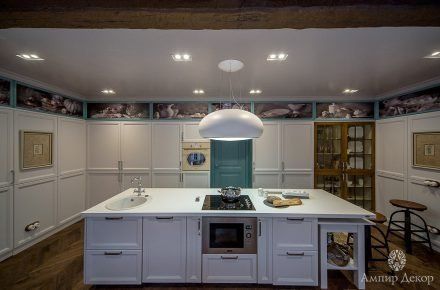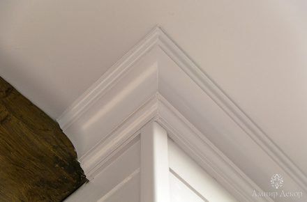 В помещении много натурального дерева: дубовый паркет на полу и вагонка, выкрашенная в нежный серо-розовый цвет. Роль цветовых акцентов выполняют молдинги из дюрополимера PX144 и PX117, которые обрамляют фрески. Они придают столовой современное звучание и вносят элемент игры, благодаря бирюзовому цвету, в который выкрашены. Чтобы эркер смотрелся изящнее, под потолком закрепили рельефный карниз C213 с величественным дизайном. Орнамент с симметрично расположенными линиями отличается своими совершенными пропорциями. Дизайн интерьера гармонично дополнил изящный плинтус ступенчатой формы SX155 из дюрополимера, разработанный бельгийским дизайнером и архитектором Ксавьером Донком.