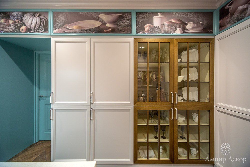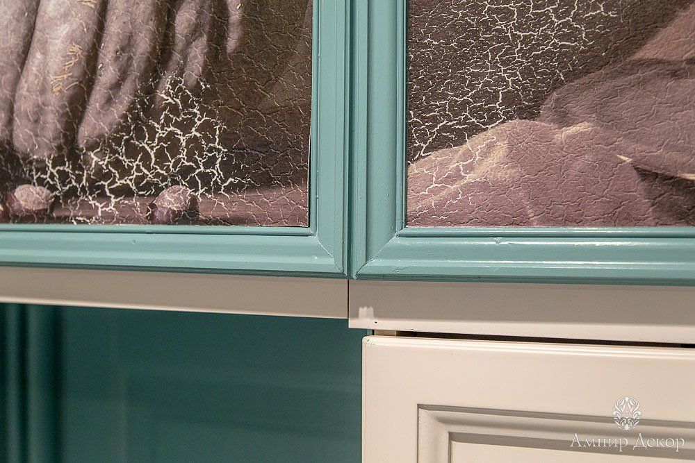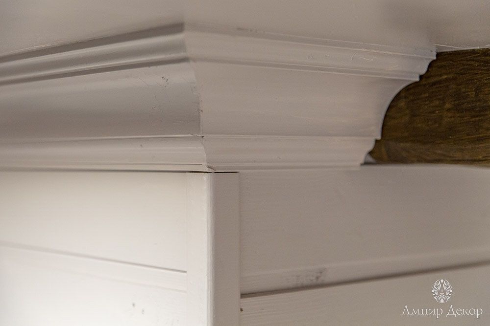 В помещении много натурального дерева: дубовый паркет на полу и вагонка, выкрашенная в нежный серо-розовый цвет. Роль цветовых акцентов выполняют молдинги из дюрополимера PX144 и PX117, которые обрамляют фрески. Они придают столовой современное звучание и вносят элемент игры, благодаря бирюзовому цвету, в который выкрашены. Чтобы эркер смотрелся изящнее, под потолком закрепили рельефный карниз C213 с величественным дизайном. Орнамент с симметрично расположенными линиями отличается своими совершенными пропорциями. Дизайн интерьера гармонично дополнил изящный плинтус ступенчатой формы SX155 из дюрополимера, разработанный бельгийским дизайнером и архитектором Ксавьером Донком.