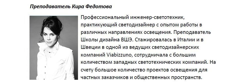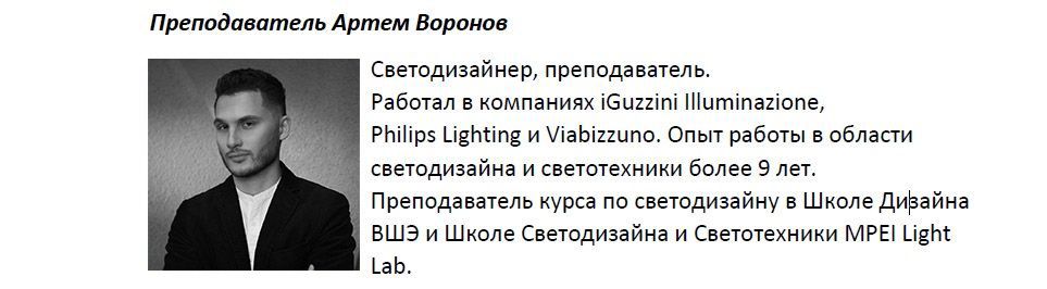 Курс разработан на основе постоянного общения и консультаций с дизайнерами интерьеров и архитекторами. Мы рассмотрим алгоритмы проектирования современных систем освещения, а также познакомимся с международными трендами и инновациями на примере реализованных проектов.