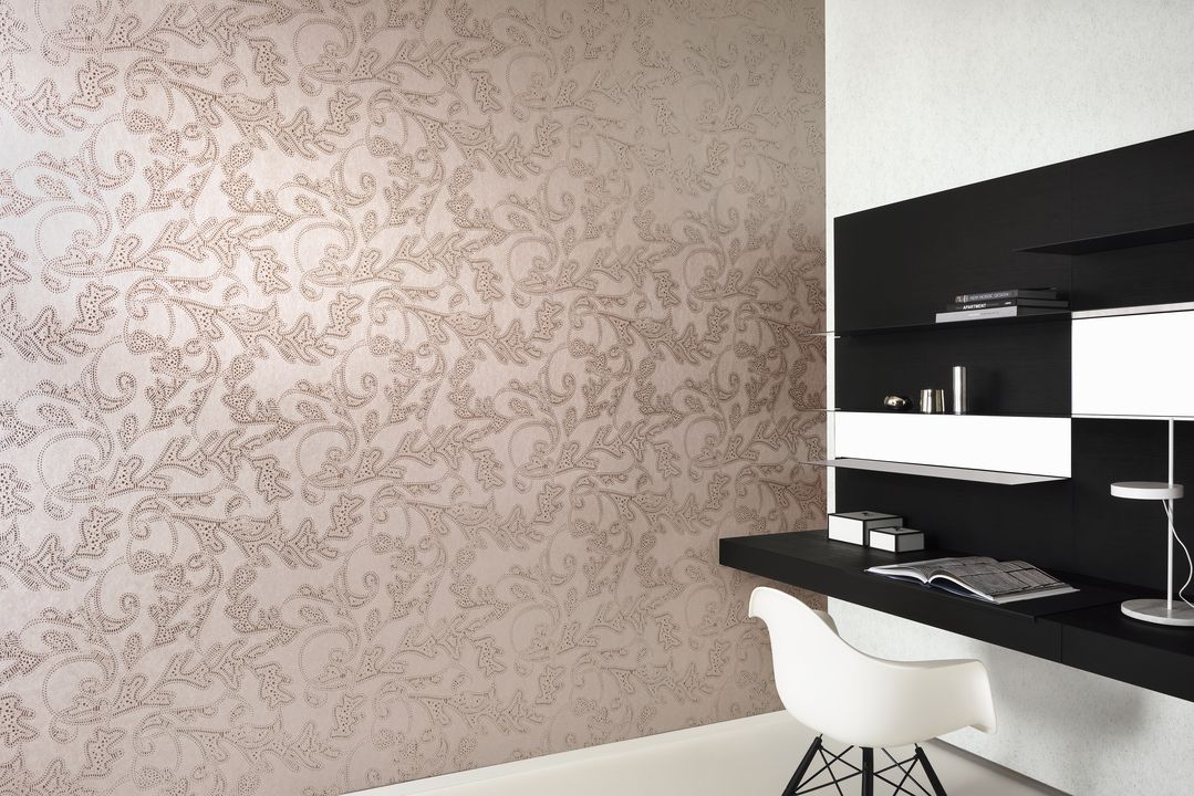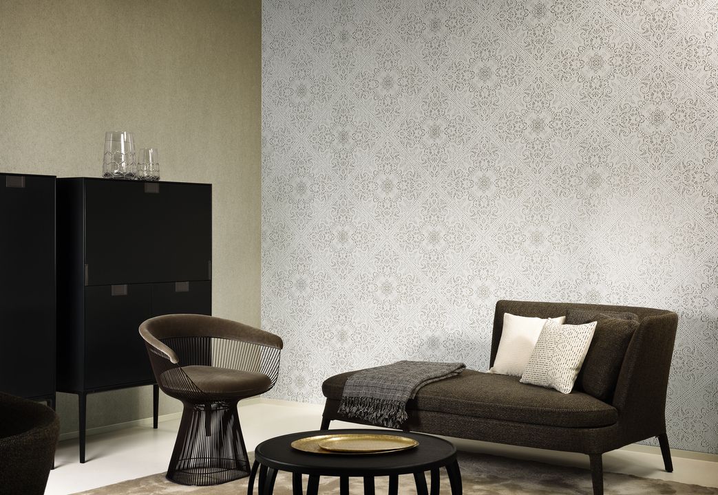 В коллекции Monochrome техника печати лаком проявила все свои возможности — принты передают блеск плитки и металла, но не создают ощущение холода. Возможны и вариации: блестящий фон и матовый узор, или, наоборот, матовый фон с блестящим узором.