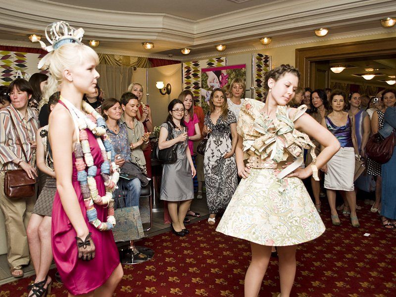 Демонстрацию обоев в виде платьев, а тканей — целыми полотнами, которые можно потрогать и самостоятельно попытаться задрапировать, люди восприняли очень позитивно. В качестве моделей выступили очаровательные менеджеры компании.  Дефиле сопровождалось рассказом ведущего о платьях, кокетливой шляпке и оригинальных бусах. С последними очень удобно выезжать к заказчикам и на их примере показывать сразу несколько образцов обоев!
