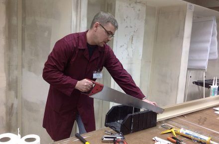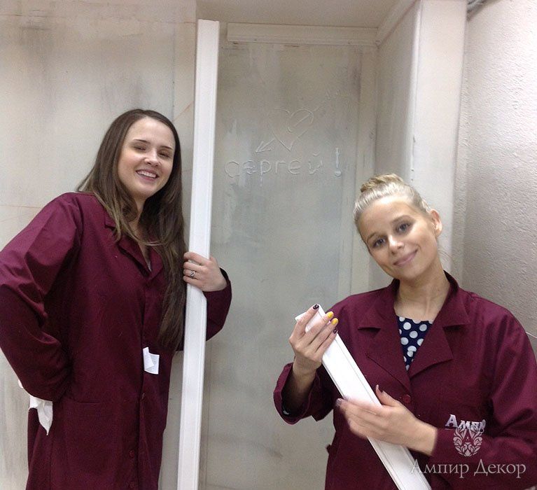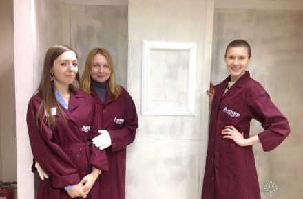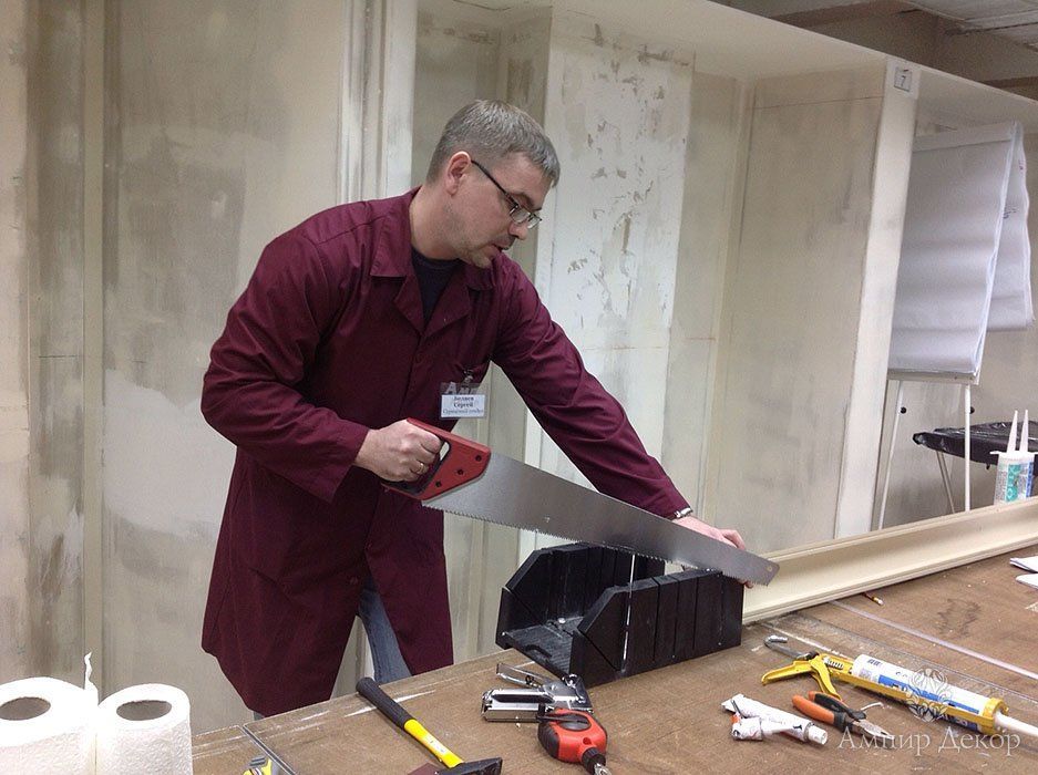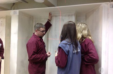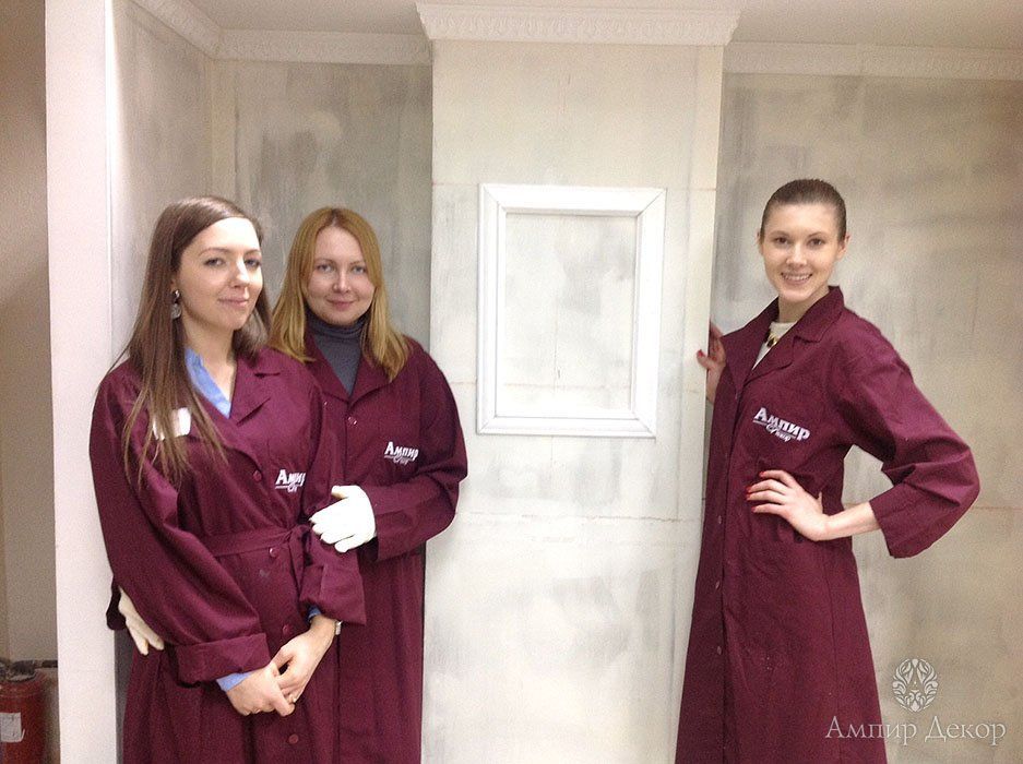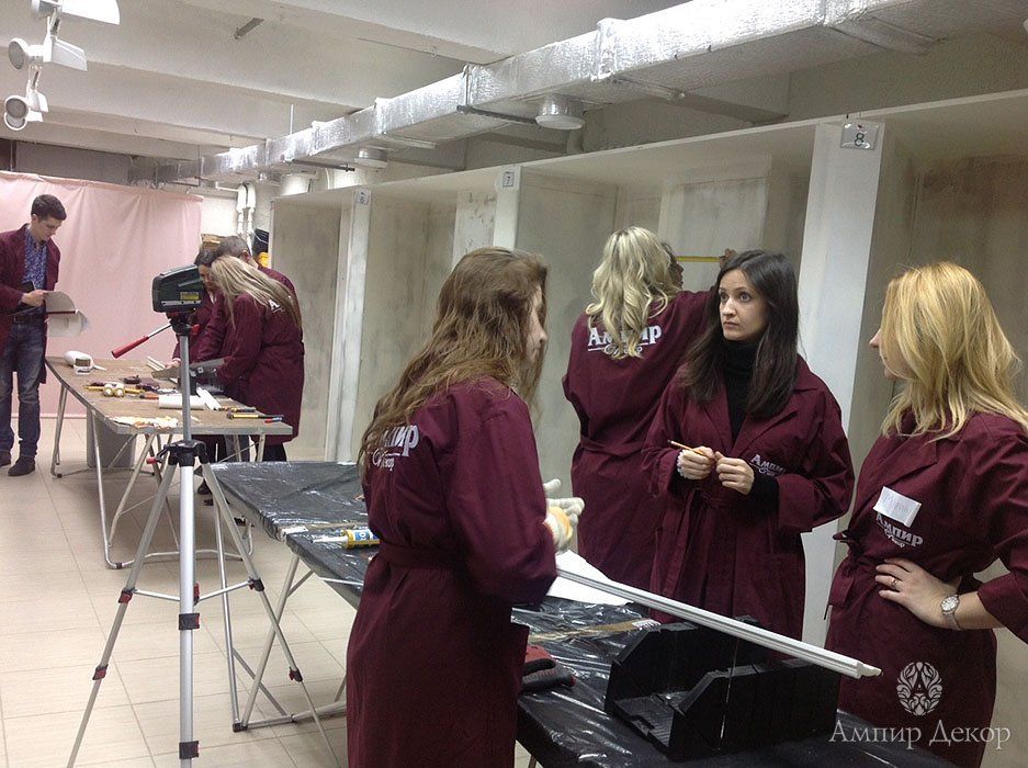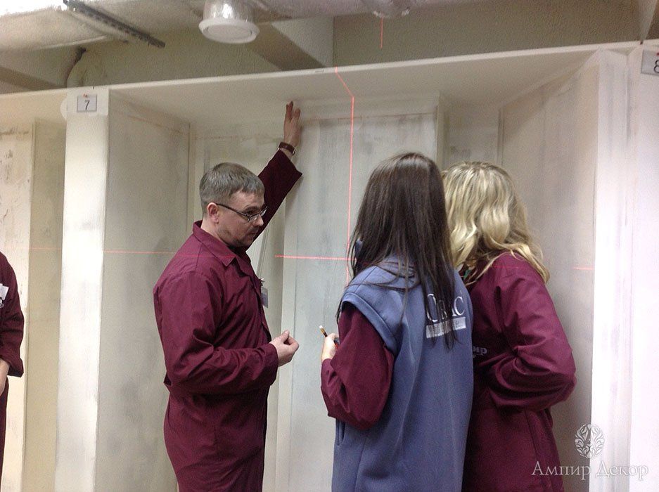 В практической части мастер-класса ученики имели возможность под руководством мастеров «Ампир Декор» отработать навыки по расчету и монтажу обоев и лепнины.