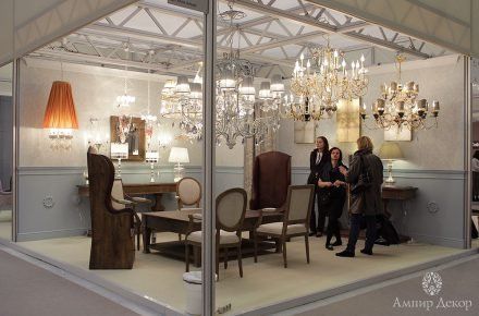 Стенд Gallo вновь оформляли известные дизайнеры Ольга Тищенко и Марина Григорян, представив на этот раз стильную и уютную жилую комнату, венцом которой стала новая классическая коллекция люстр итальянской фабрики в современном прочтении: с ажурными коваными основами, абажурами из жатого шелка, классическими цилиндрическими формами торшеров и необычными светильниками в форме хлопушек, подвесками из хрусталя и муранского стекла в форме прозрачных ограненных капель, шаров, свечей и очаровательных рыб.