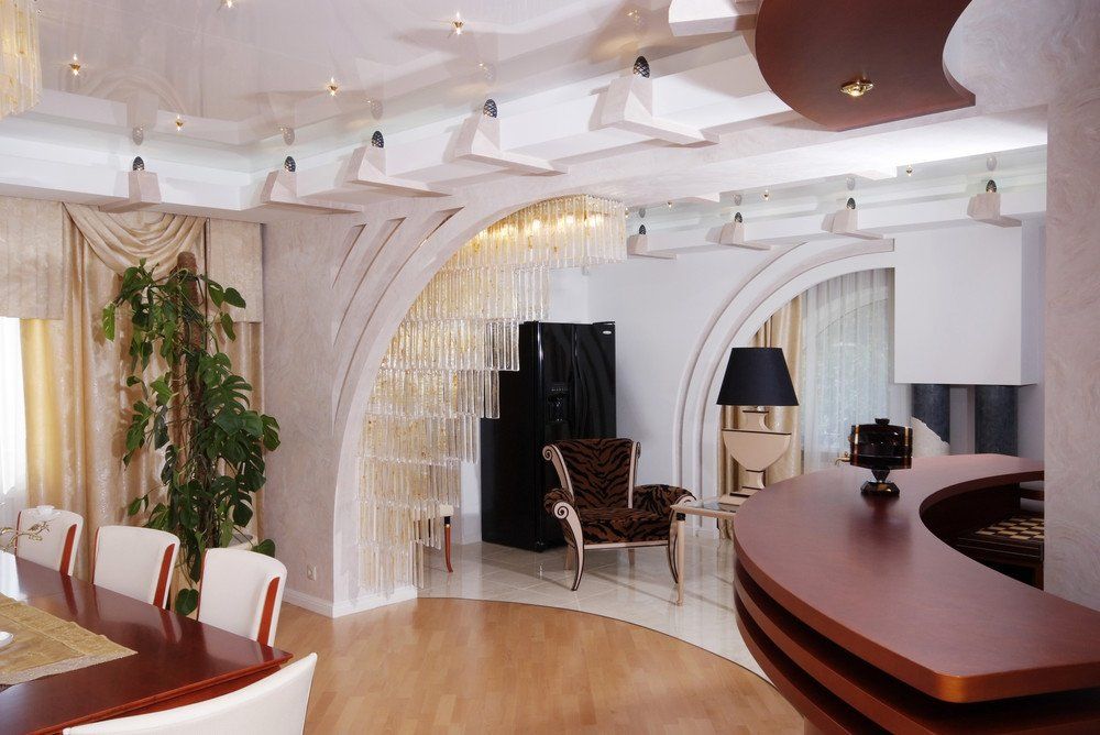 Нюансы при работе с лепными элементами со скрытым освещением действительно существуют. Есть три момента, которые необходимо учитывать при выполнении дизайн проекта и при производстве работ. Первый — это возможность доступа к электротехническому оборудованию (лампы, трансформаторы, светодиодные ленты). Второй нюанс — если над карнизом со скрытым освещением находится глянцевый натяжной потолок, то необходимо закрыть электротехническое оборудование, находящееся внутри карниза матовым оргстеклом, чтобы оно не отражалось в глянцевом натяжном потолке. Третий — при использовании матового оргстекла потеря освещенности составит 15-20 %. Это необходимо учитывать при расчете освещенности всего помещения.