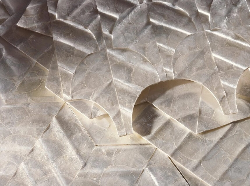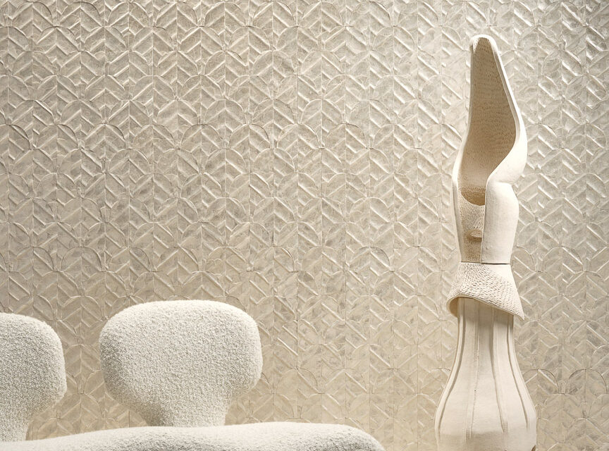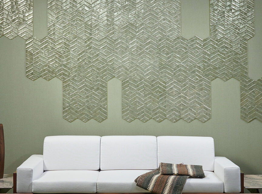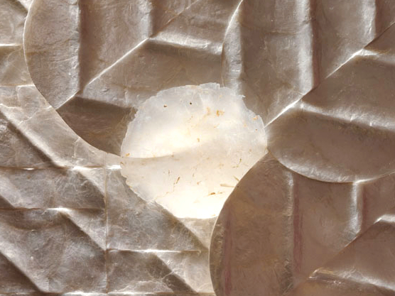 Изысканная графика с акцентом на форму. Карниз из ракушек капис, созданный вручную, станет ярким акцентом любой стены. Поверните плитки под разными углами — и получите динамичный узор, меняющийся на глазах.