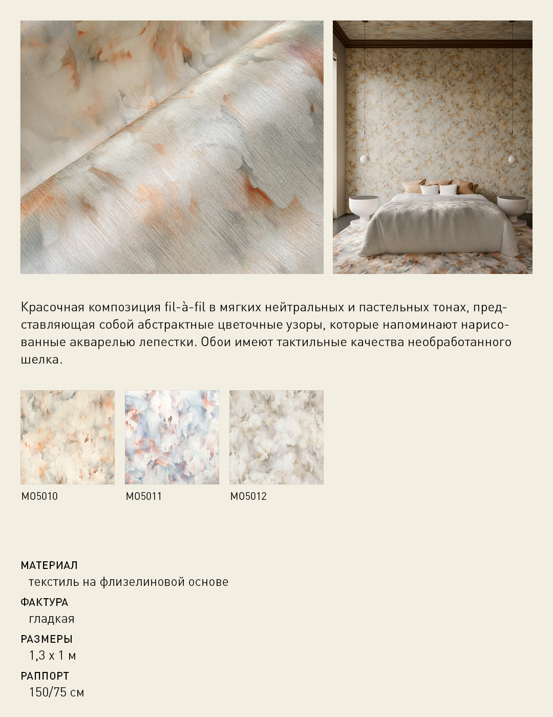 Красочная композиция fil-à-fil* в мягких нейтральных и пастельных тонах, представляющая собой абстрактные цветочные узоры, которые напоминают нарисованные акварелью лепестки. Обои имеют тактильные качества необработанного