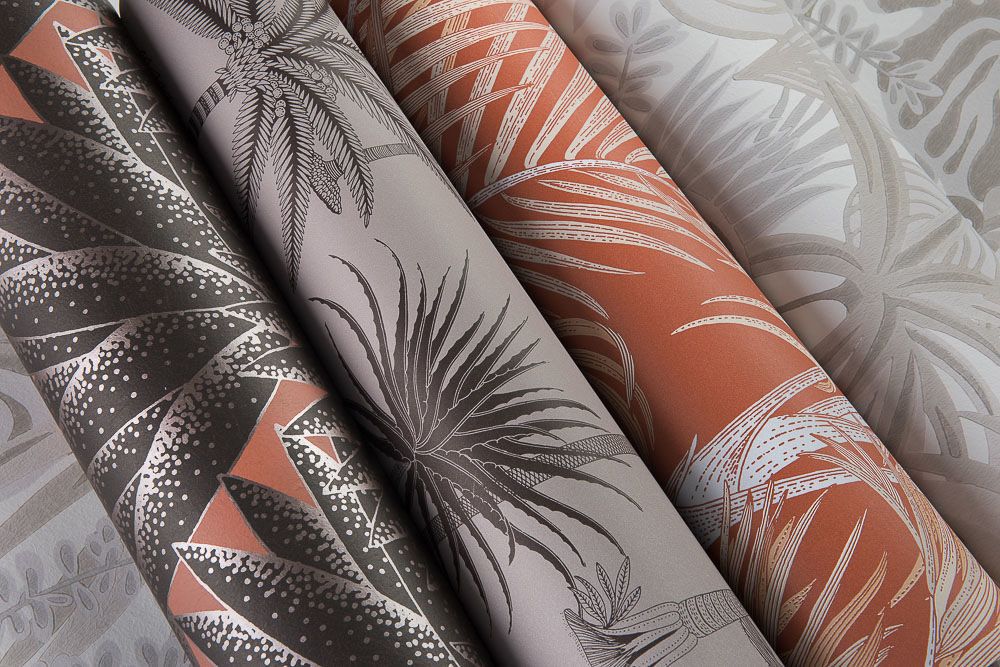Кокосовые и банановые пальмы, заросли алоэ и сюрреалистичных деревьев — каталог открывает новое представление о тропиках в домашнем уюте! Принты напоминают акриловую живопись, декорированы блестящими металлическими чернилами, дополнены плейнами и мелким геометрическим орнаментом.