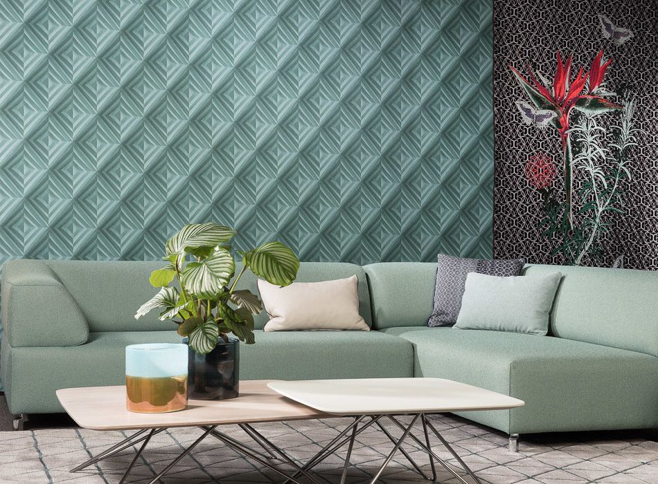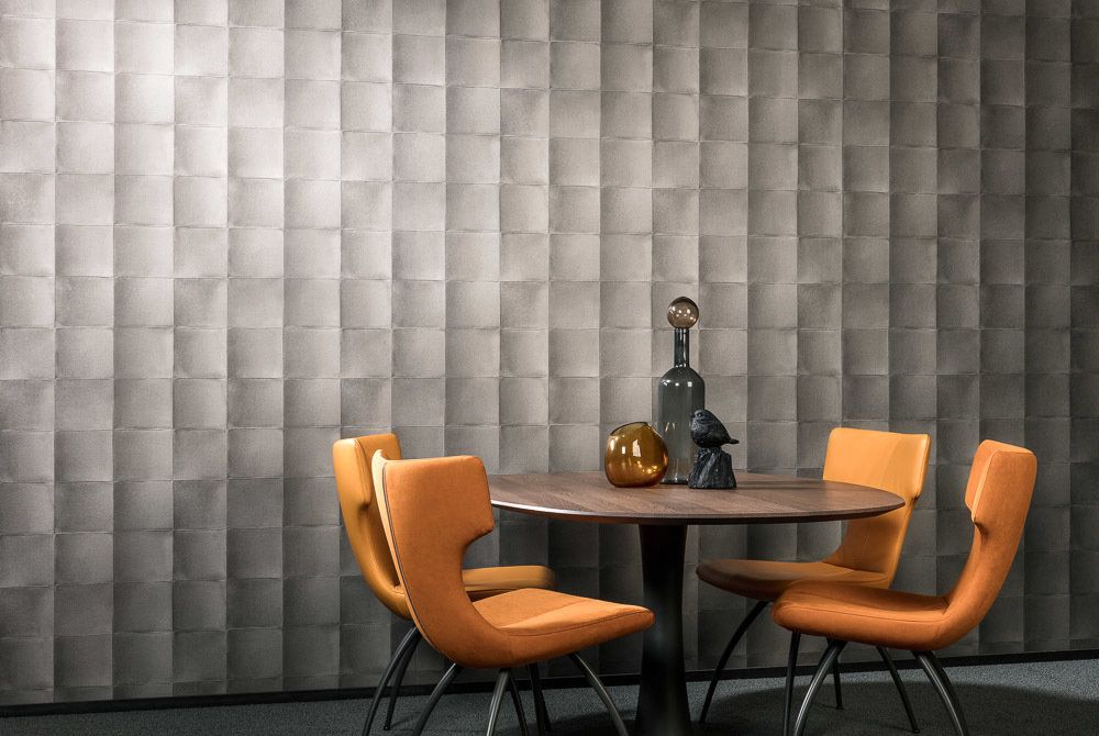 Имитация мягких текстильных плиток выглядит реалистично даже на расстоянии. Благодаря современным технологиям печати, плавным переходам краски и светотеням на флизелиновых обоях получается модный эффект 3D.