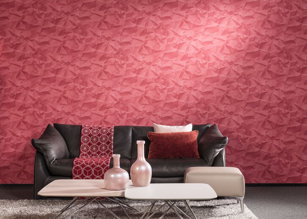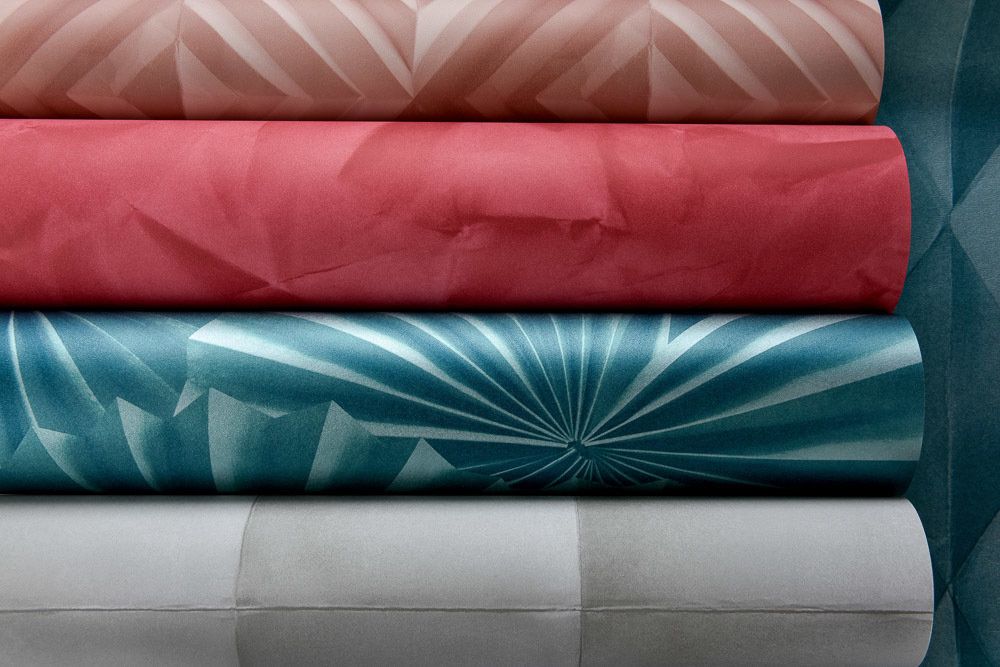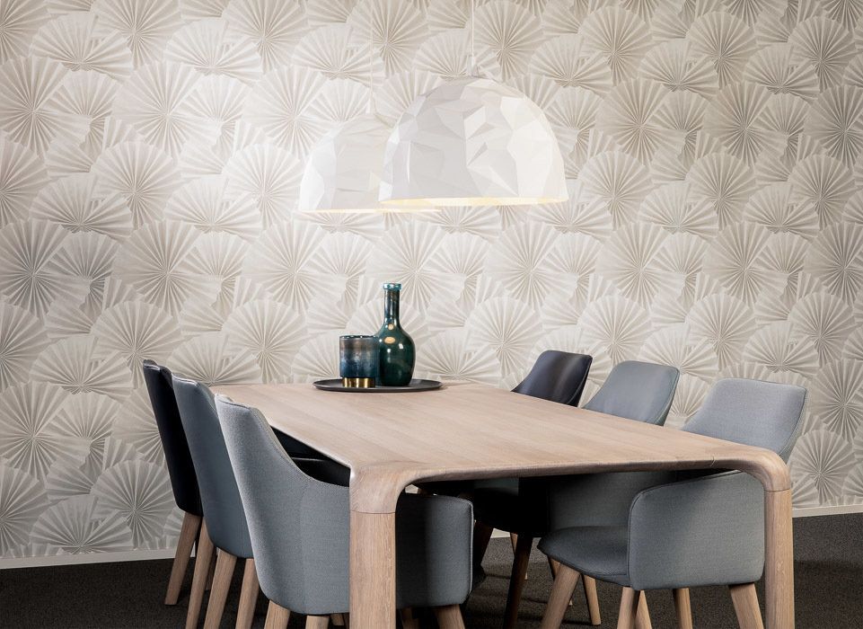 Сложный геометрический орнамент создает на стене полное ощущение фигур оригами. Паттерн иллюстрирует непростой процесс складывания бумаги с имитацией рельефа и теневыми иллюзиями.