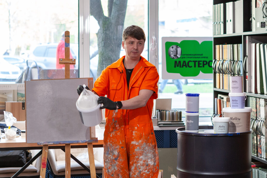 - Сам микроцемент — двухкомпонентный материал: сухая смесь и связующее Mallers NanoFix в заданной пропорции. В связующее вводится колер, затем масса замешивается до пастообразного состояния.