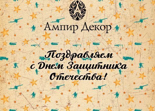 Компания Ампир Декор поздравляет всех мужчин с Днем защитника Отечества! Это праздник настоящих мужчин! Желаем вам крепкого здоровья и счастья, пусть ваша жизнь будет наполнена яркими событиями, успехами и достижениями!