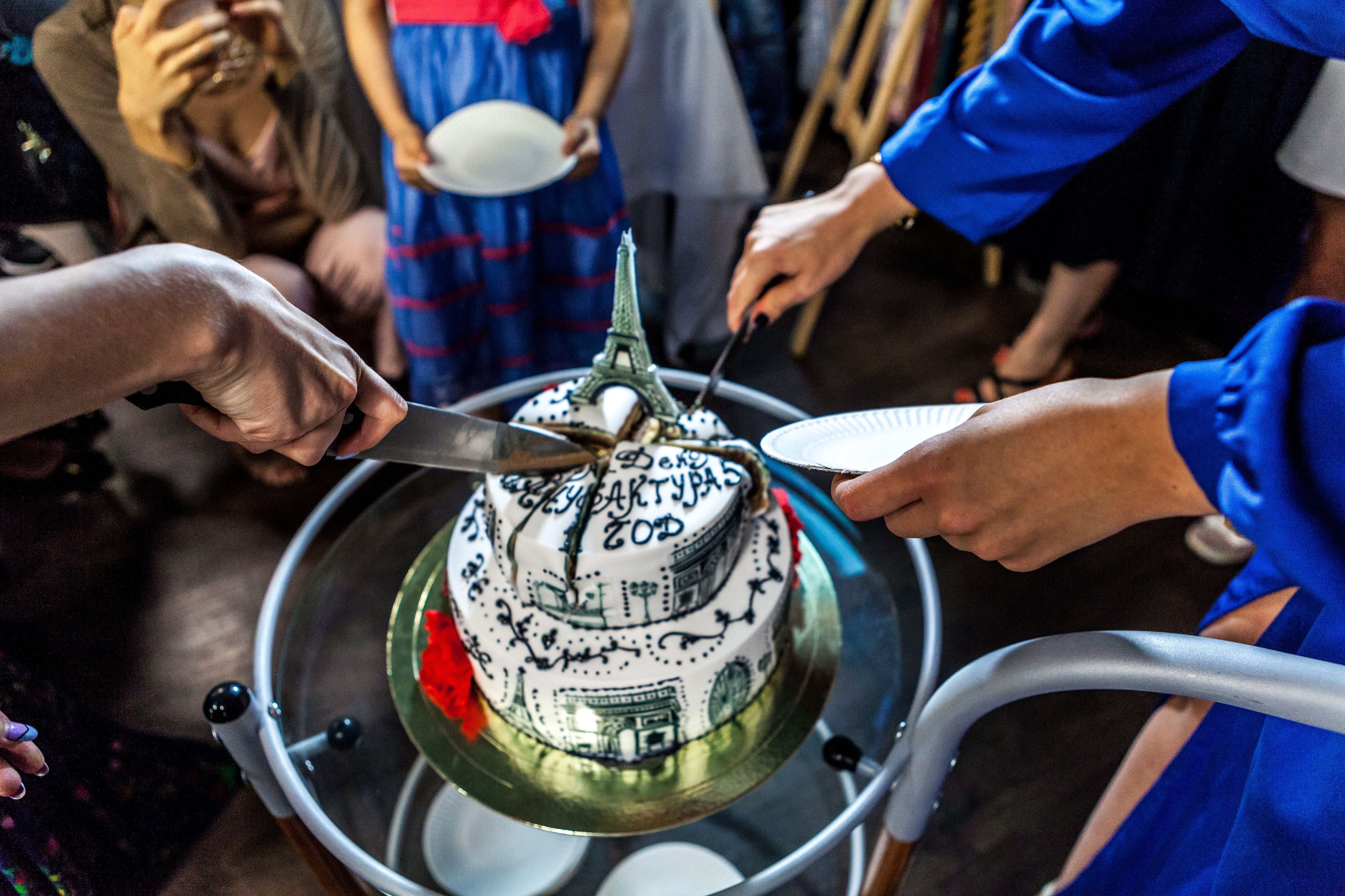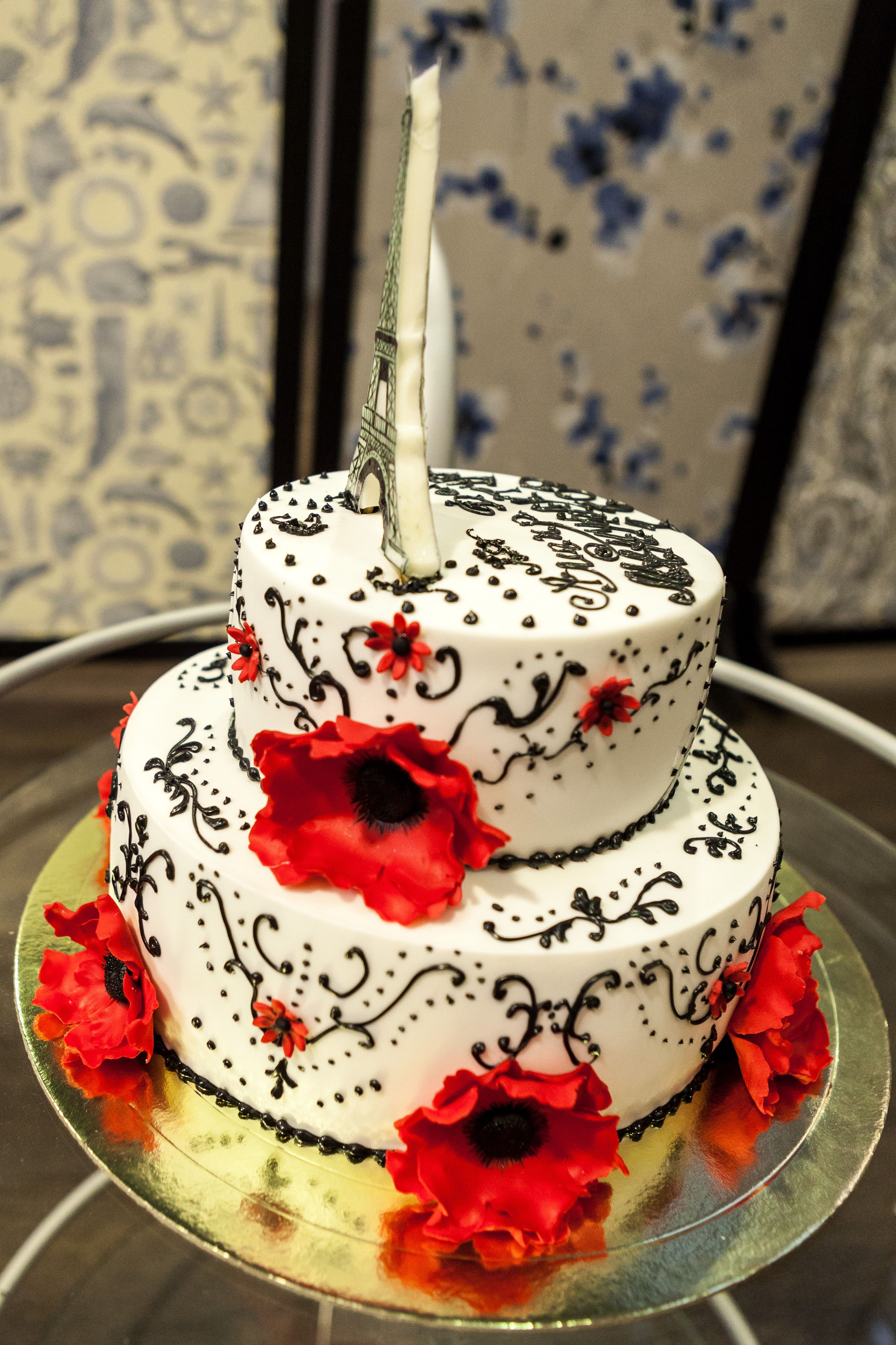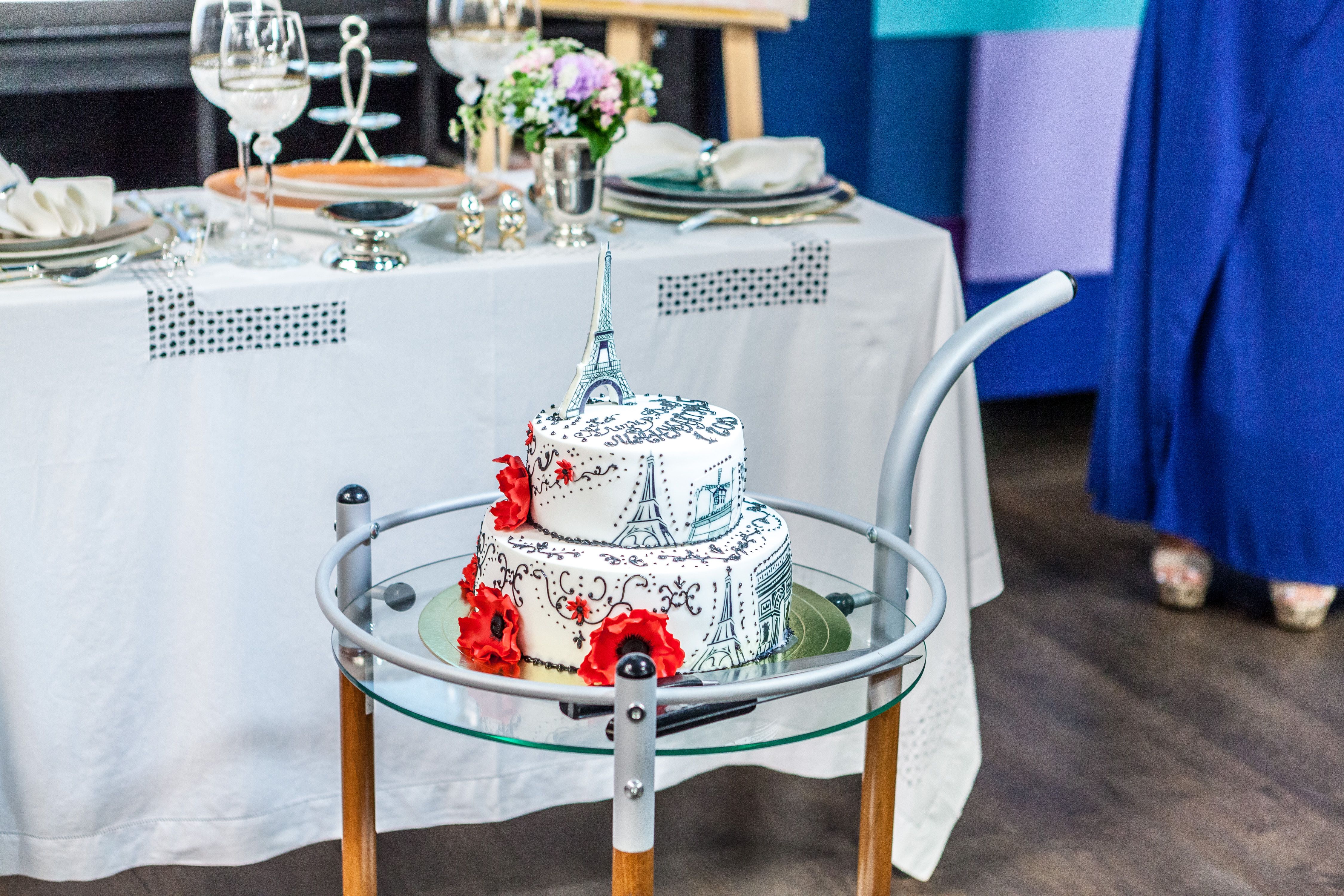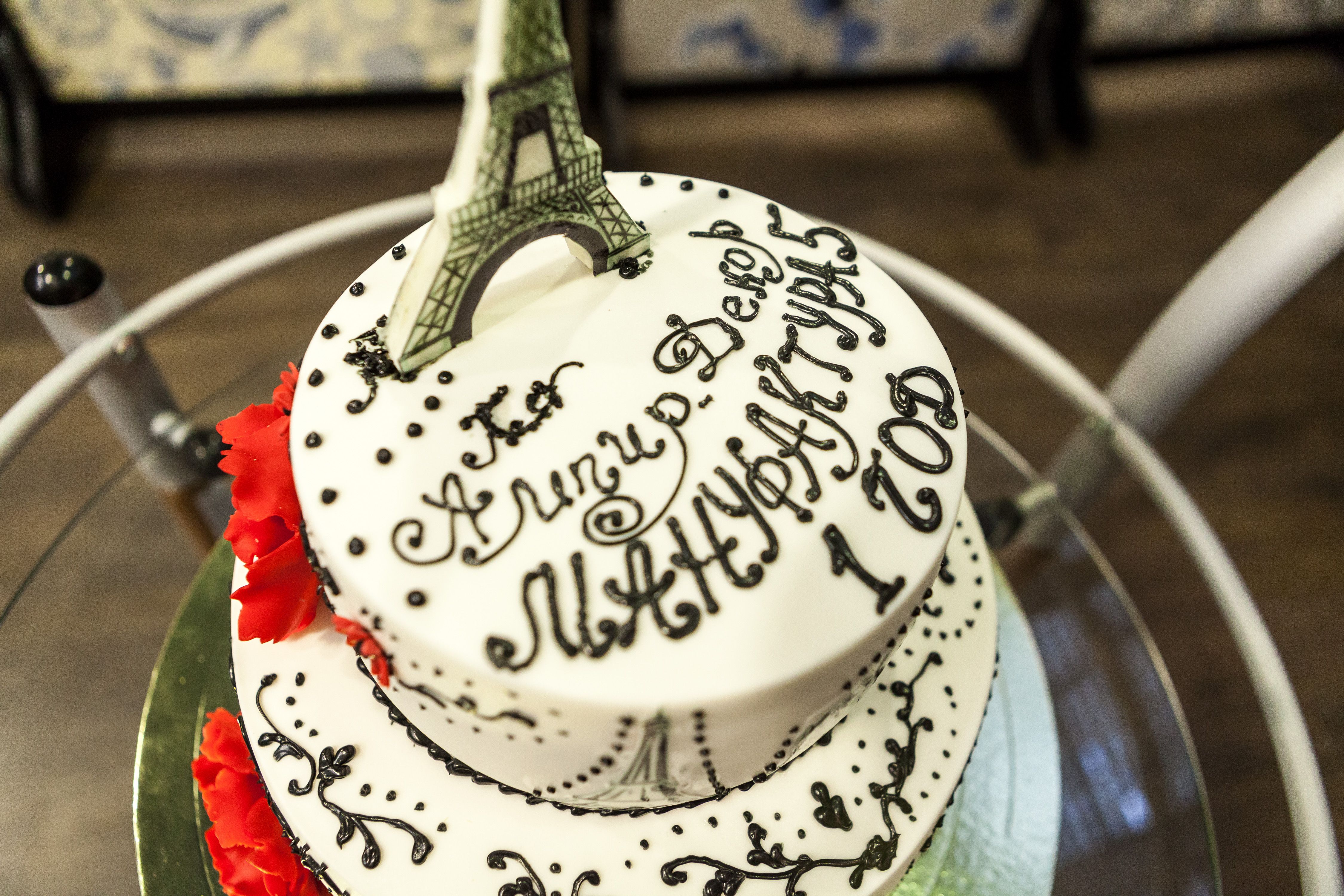 На протяжении всего вечера проникнуться истинной атмосферой Франции можно было в фотозоне: гости с радостью делали памятные снимки с Эйфелевой башней и цветами. А финальным аккордом праздника стал торт с красными маками и тем же символом Парижа под стать фотодекору.