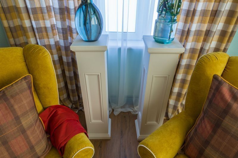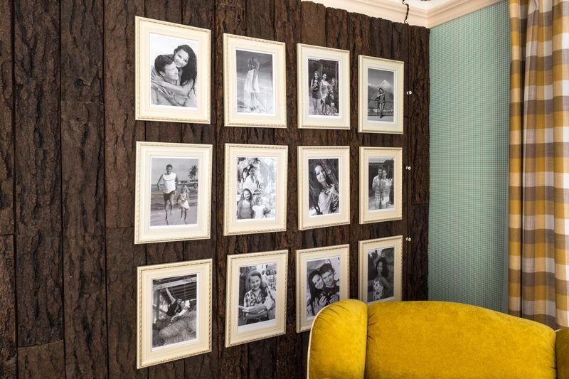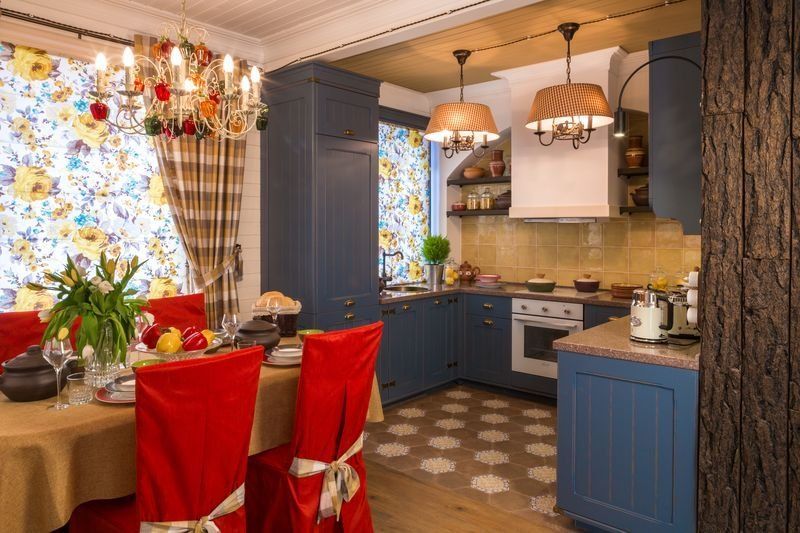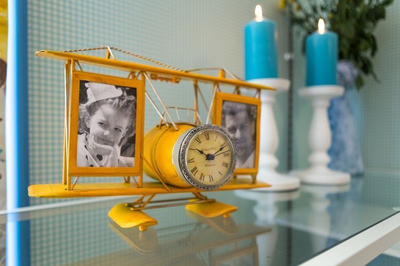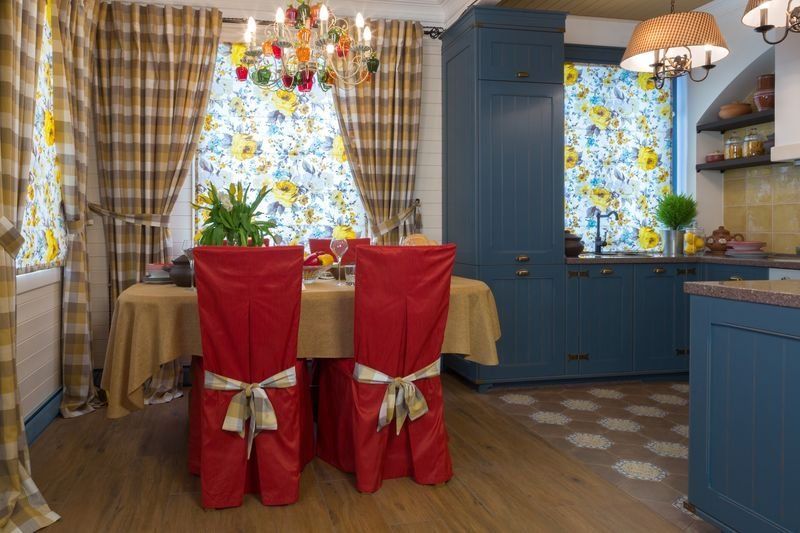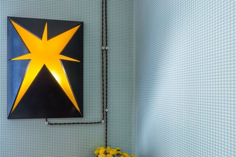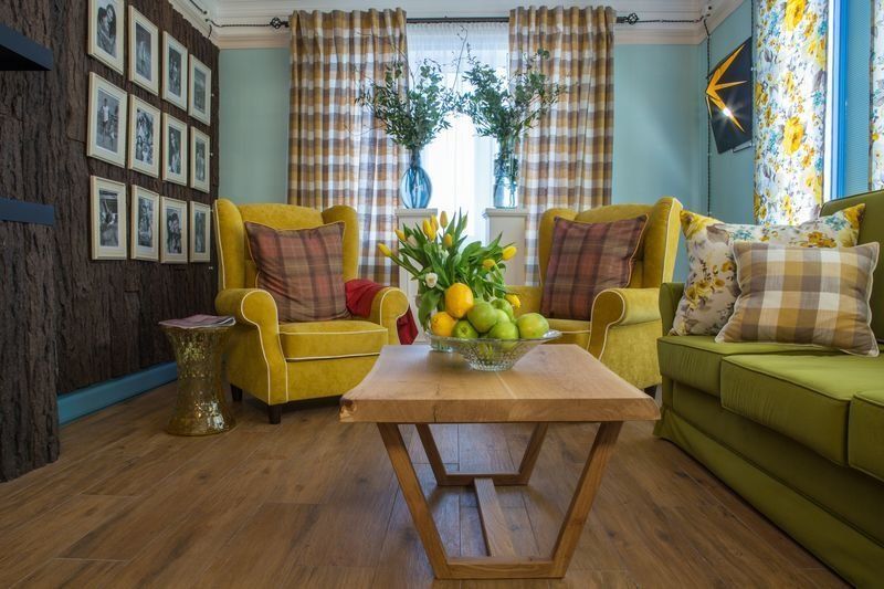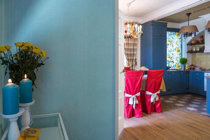 Главной «изюминкой» интерьера дизайнер назначила клетку, ассоциирующуюся с дачными традициями. Выбор был сделан в пользу французских обоев Camengo из коллекции Little friends. Эти гладкие виниловые обои в бело-голубую клеточку предназначены для декорирования детских комнат, однако прекрасно вписались в гостиную.