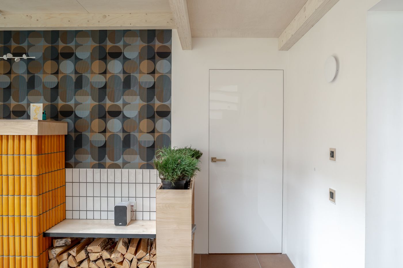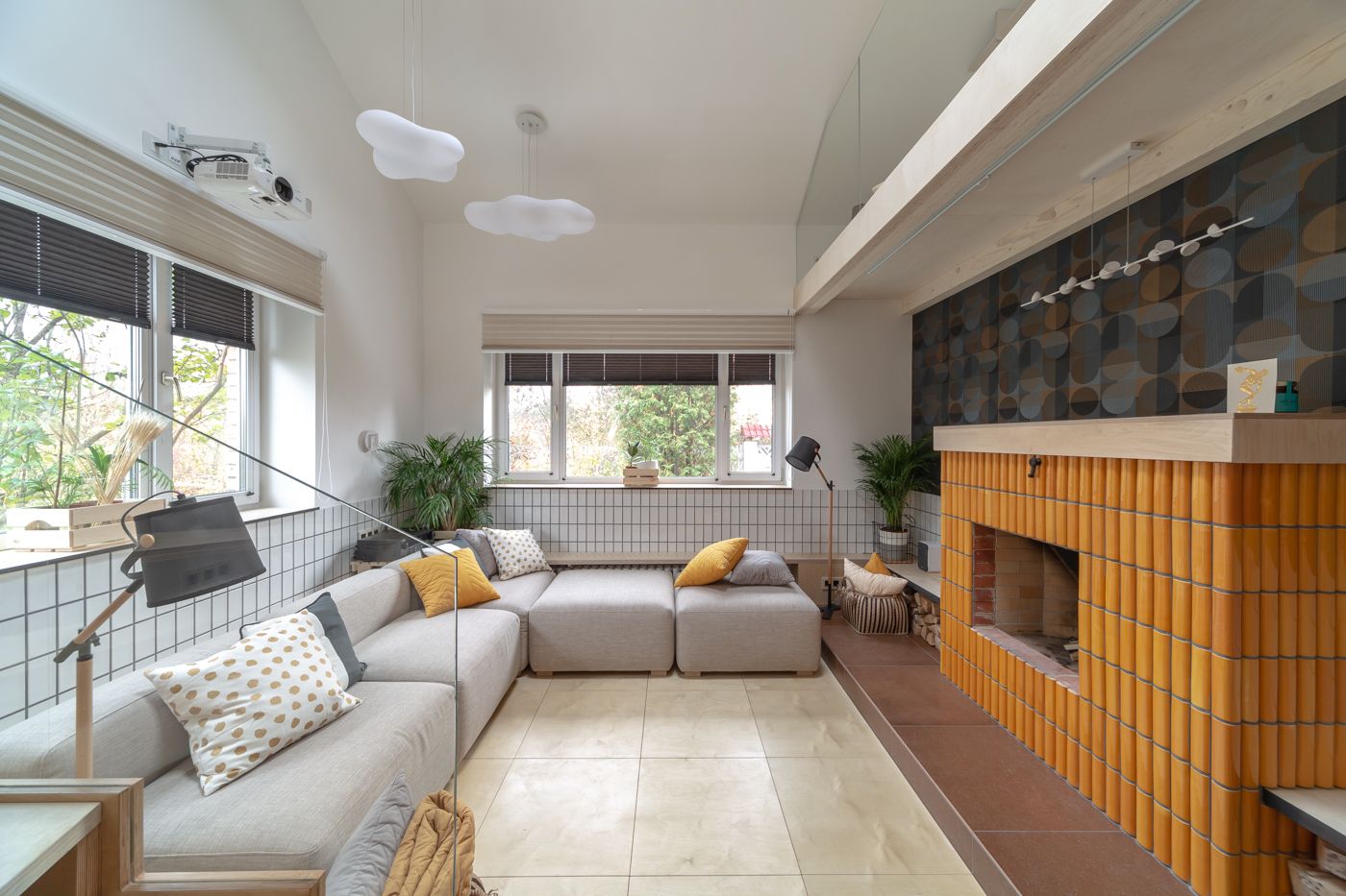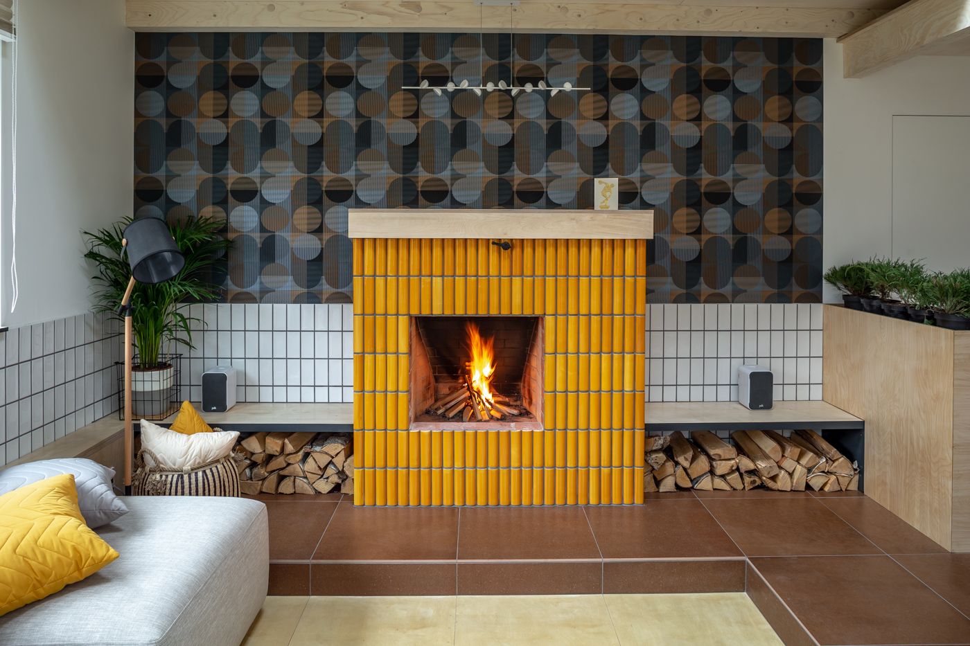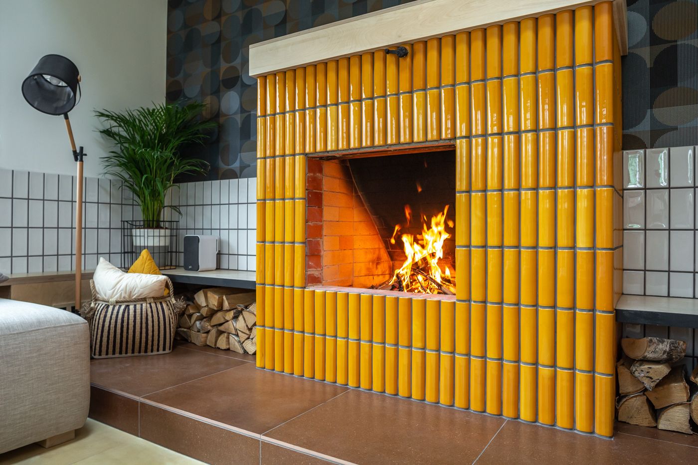 Такого эффекта удалось добиться с помощью глиняных изразцов ручной работы шафранового оттенка, которыми украсили портал вокруг топки. Камин венчает оригинальная полка из гладкой березовой фанеры.