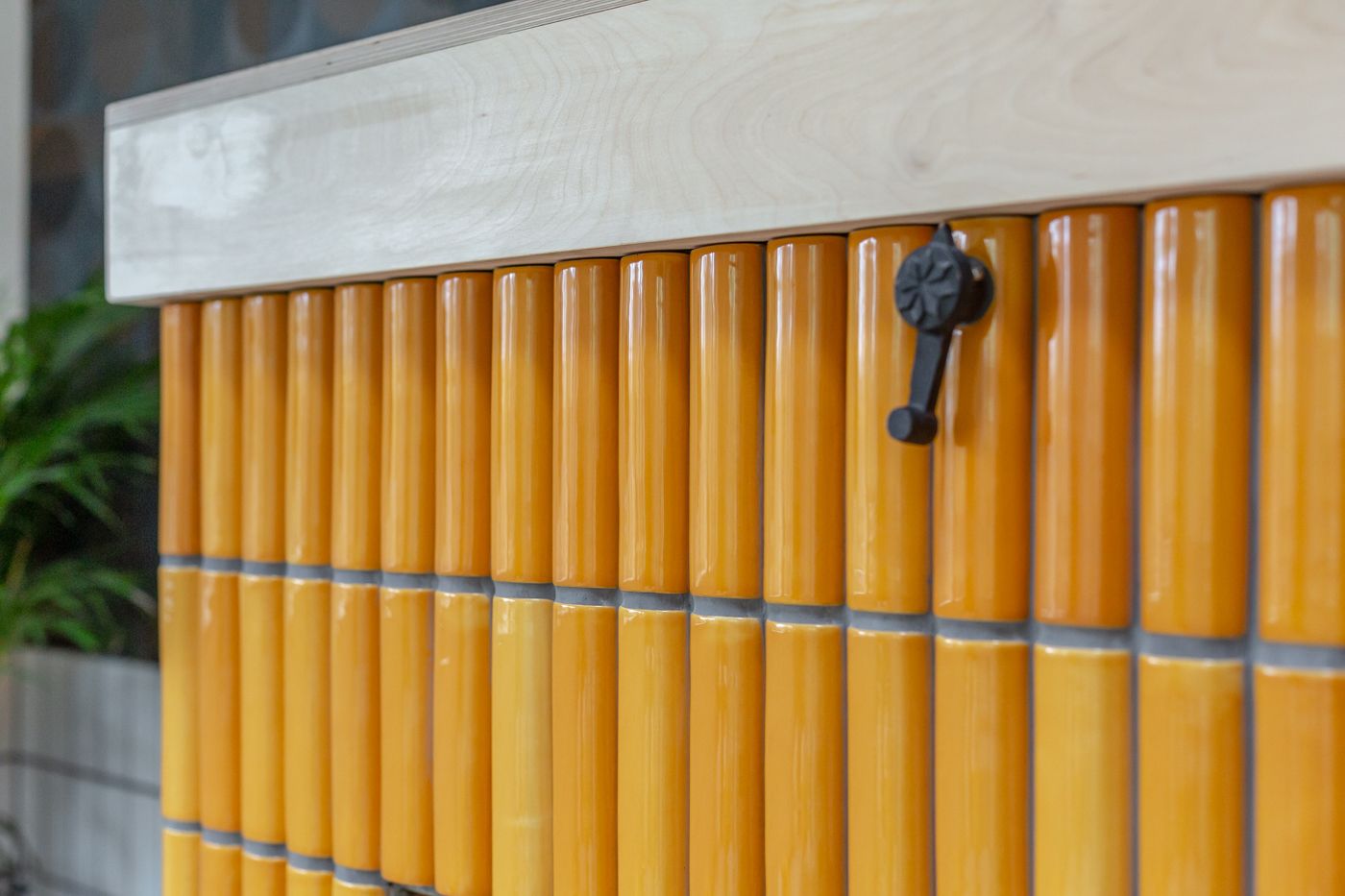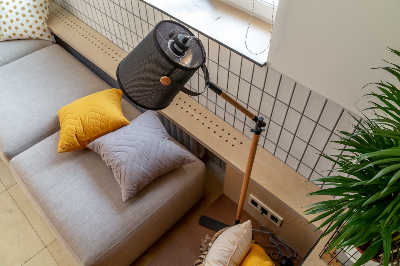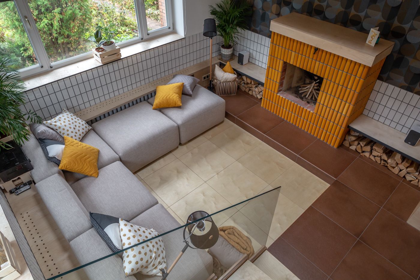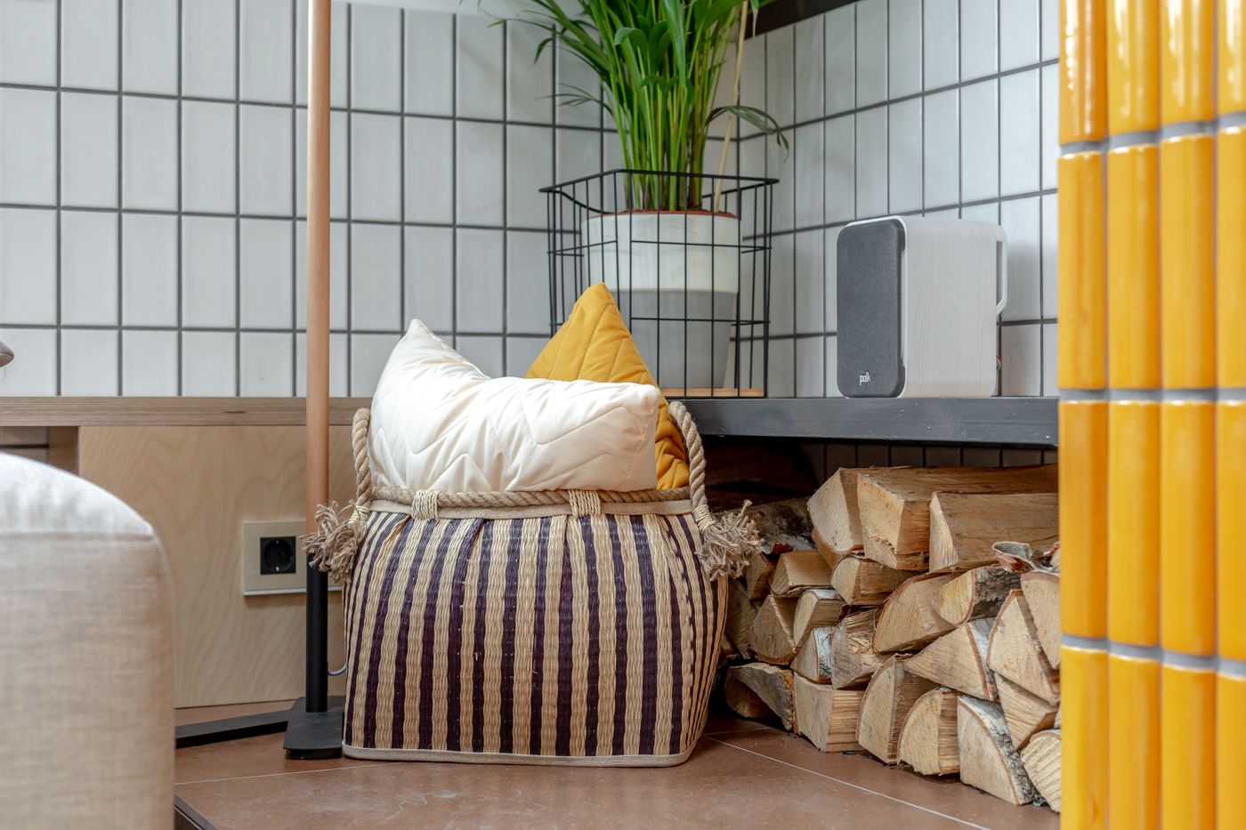 Такого эффекта удалось добиться с помощью глиняных изразцов ручной работы шафранового оттенка, которыми украсили портал вокруг топки. Камин венчает оригинальная полка из гладкой березовой фанеры.