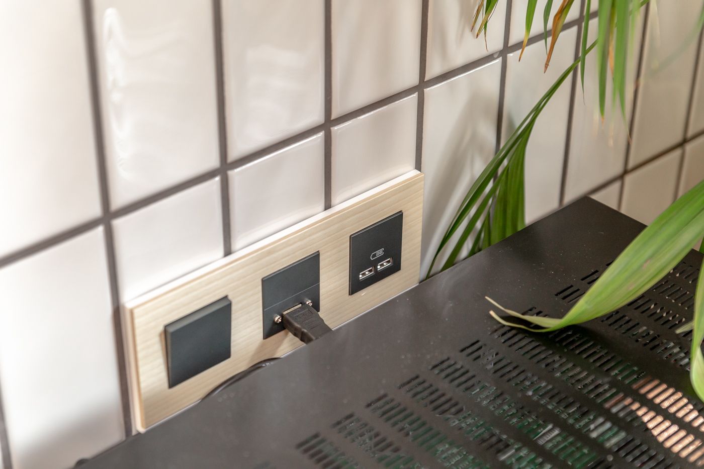 Из маленьких керамических плиток на стенах выложен графичный пояс. Белая плитка в гостиной — необычное решение, однако лаконичность дизайна и практичность керамики объединяет пространство, а глянцевая поверхность эффектно контрастирует с матовыми фактурами в интерьере.