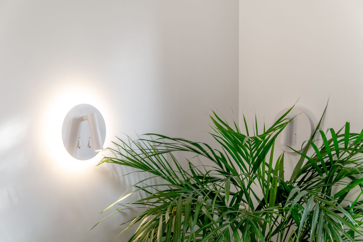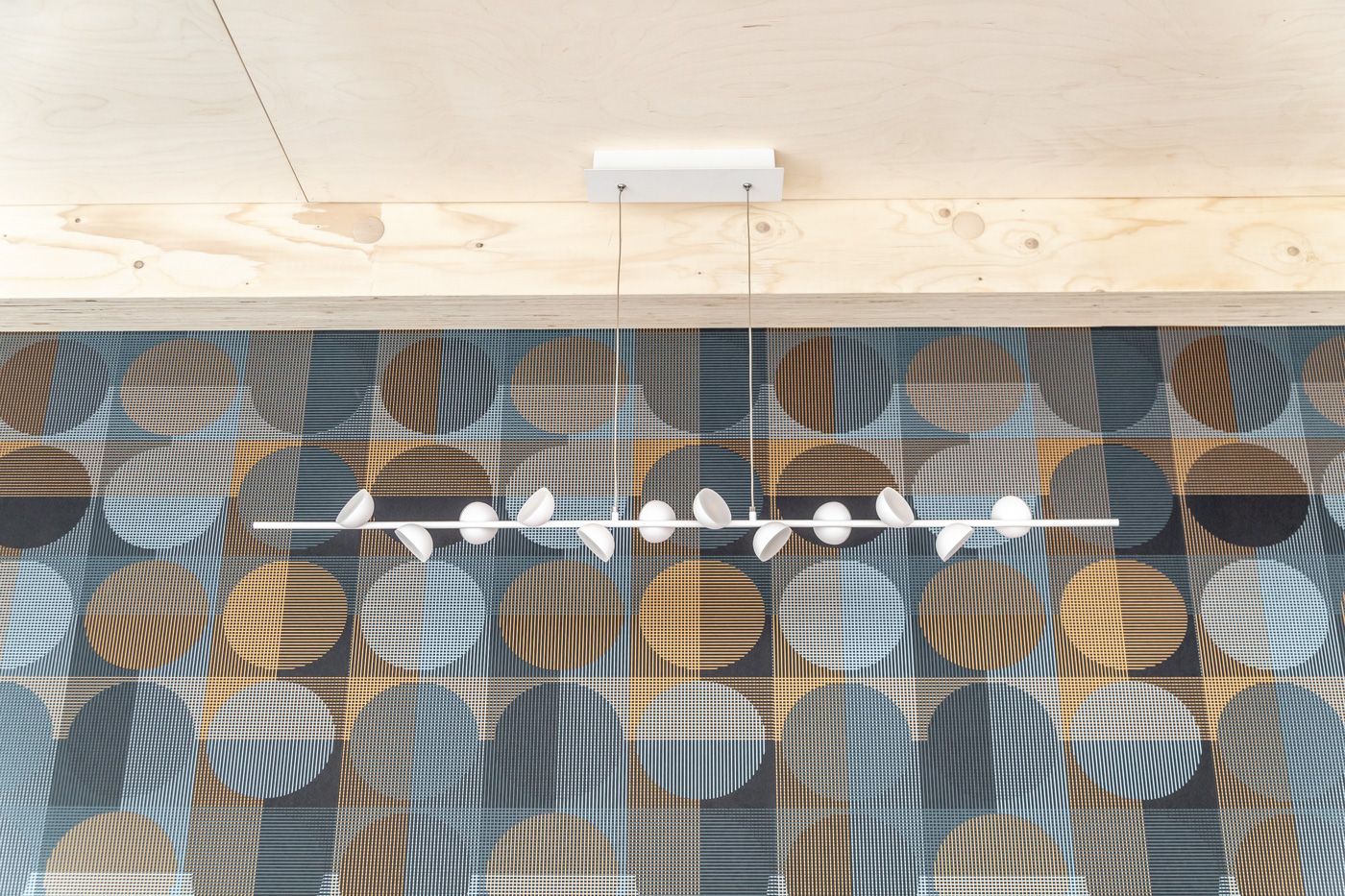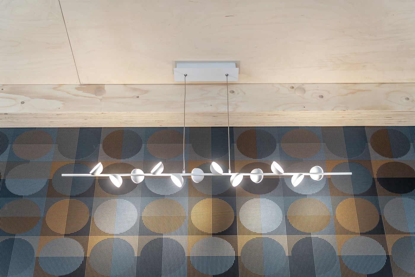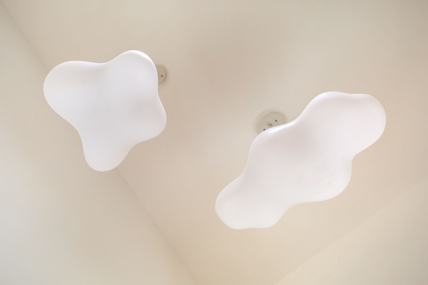 Линии обоев меняют цвет благодаря минималистичному подвесному светильнику, стилизованному под ветку с ягодами. Потолок украсили светильники-облака, а стены – лаконичные бра.