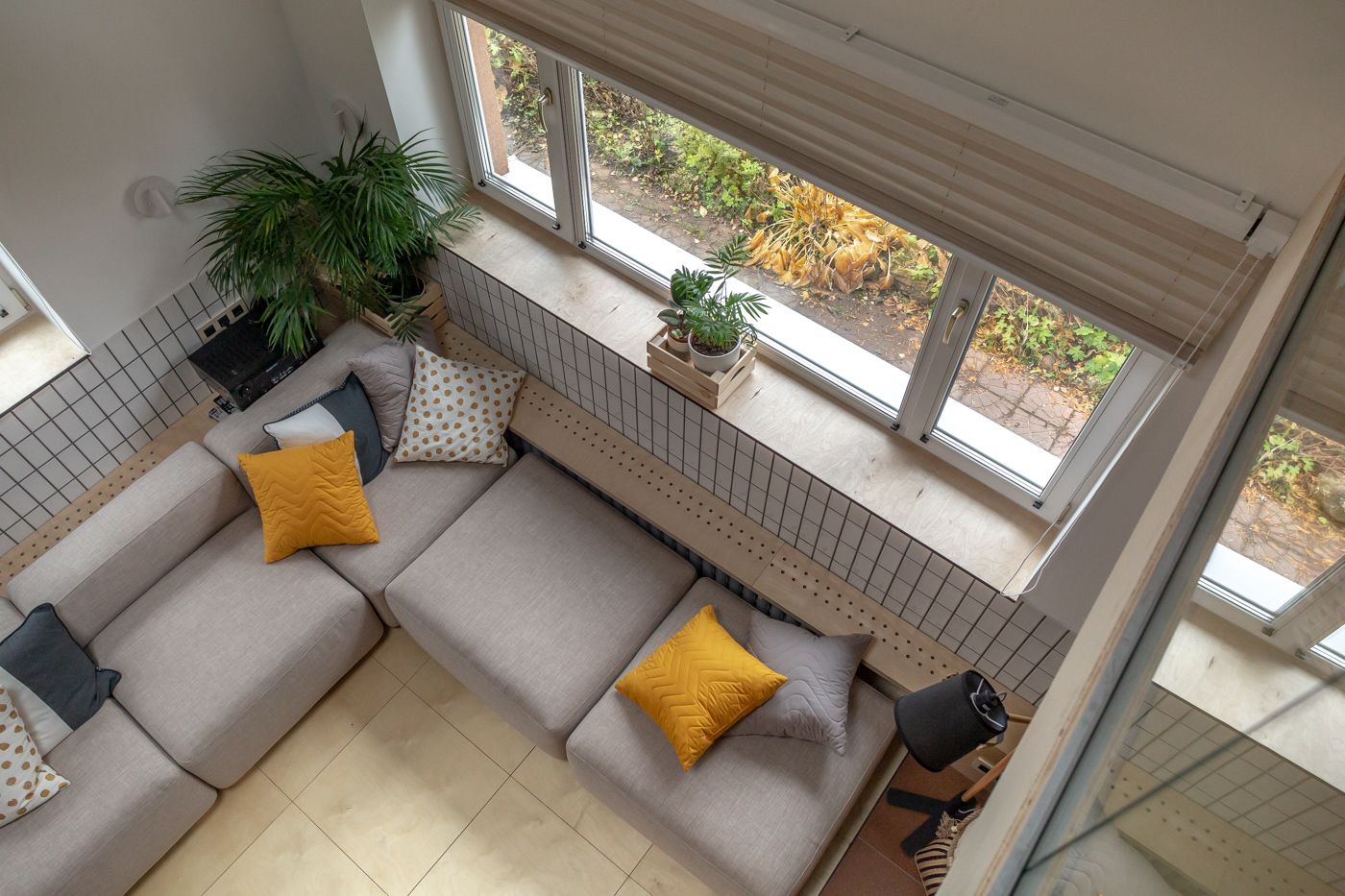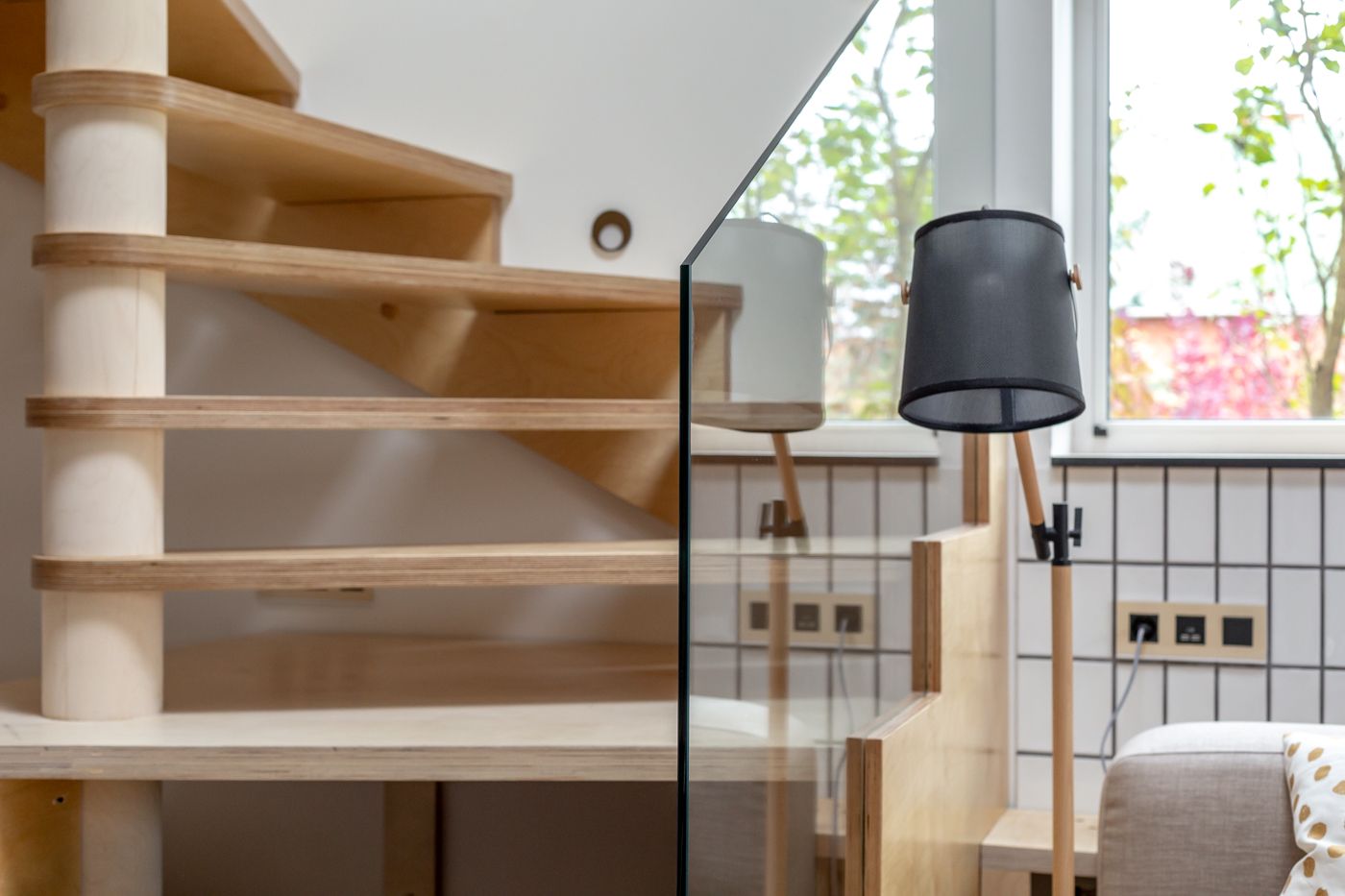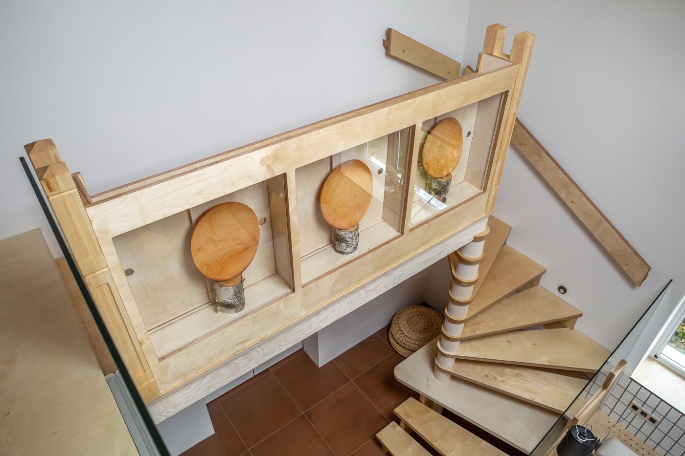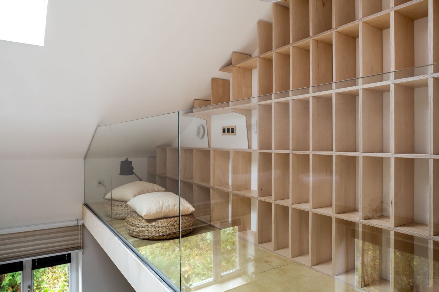 На втором уровне разместилась библиотека. На балкончике установлен стеллаж из березовой фанеры с многочисленными полками для книг и пуфы из банановых листьев.