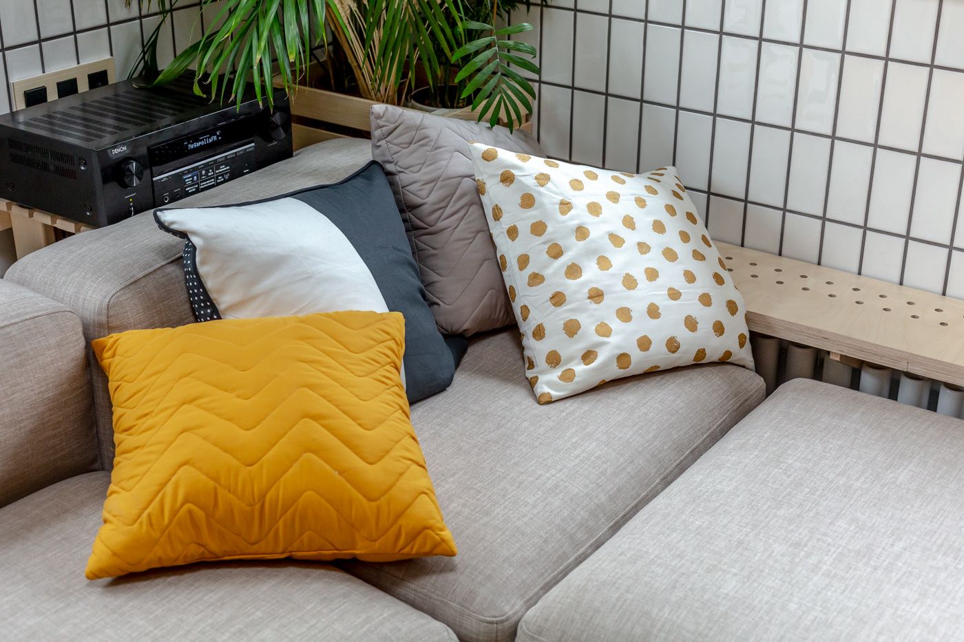 Модульный диван изготовлен по эскизам авторов проекта. Мобильная конструкция из нескольких сегментов обита устойчивой к пятнам и влаге рогожкой.