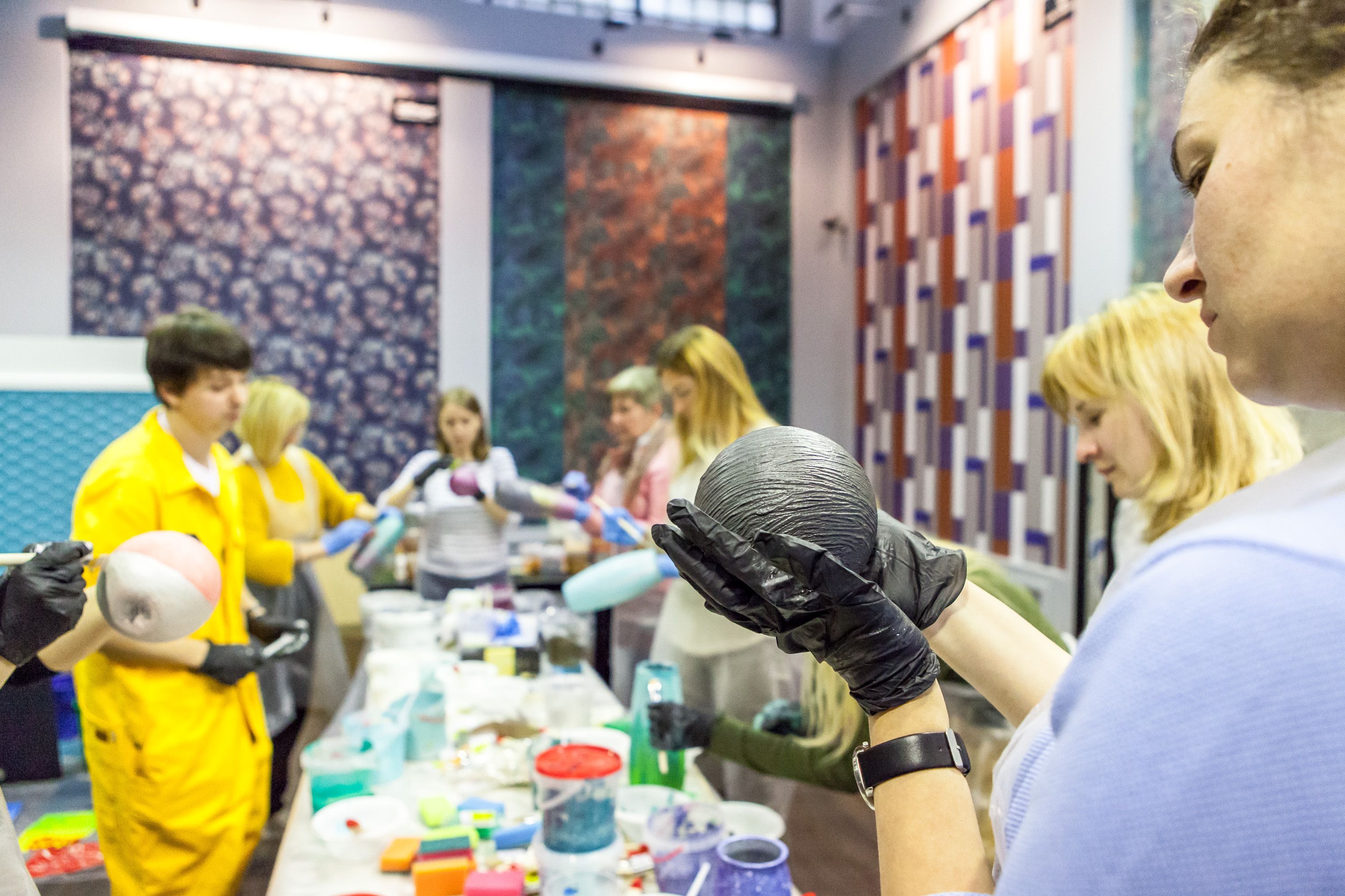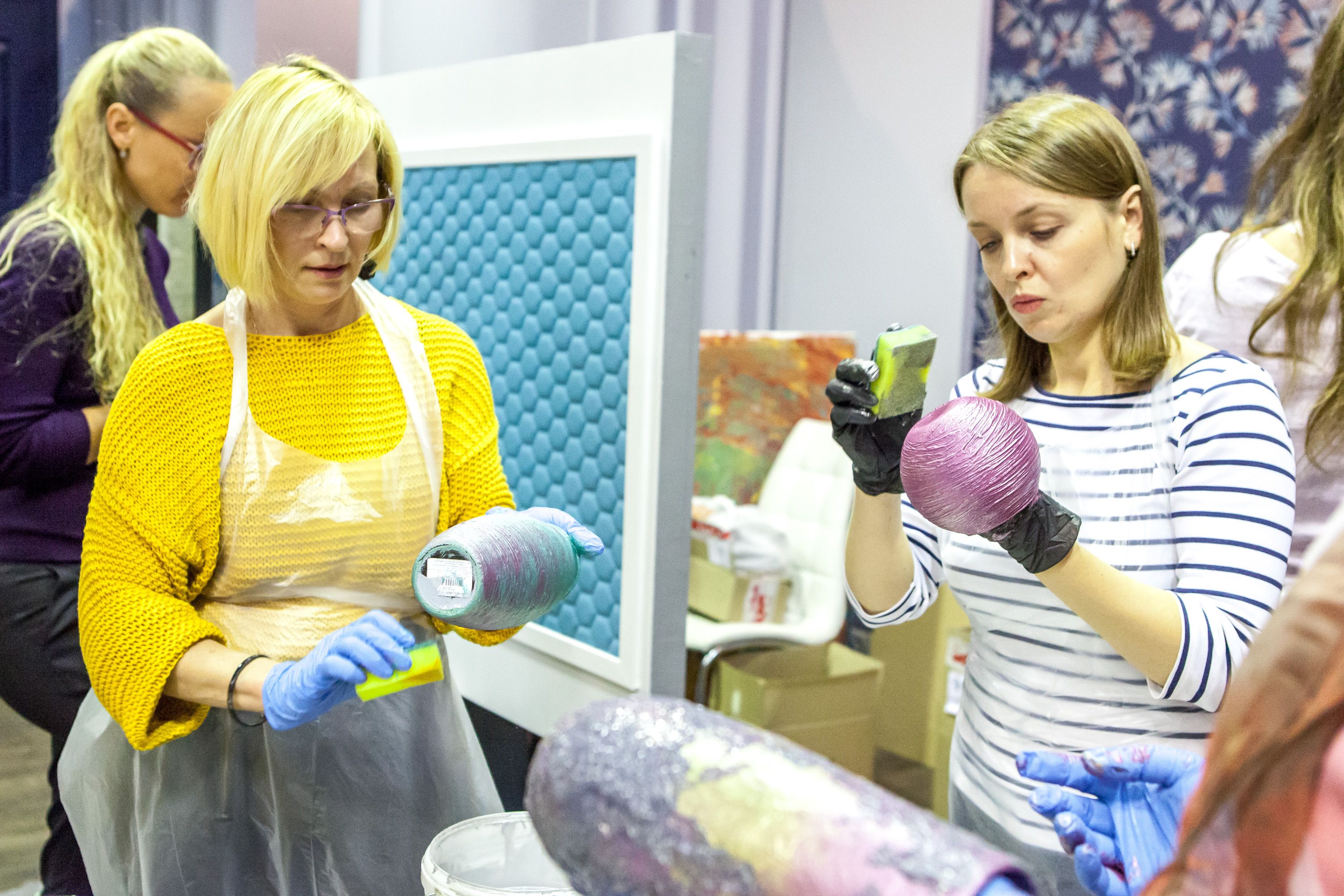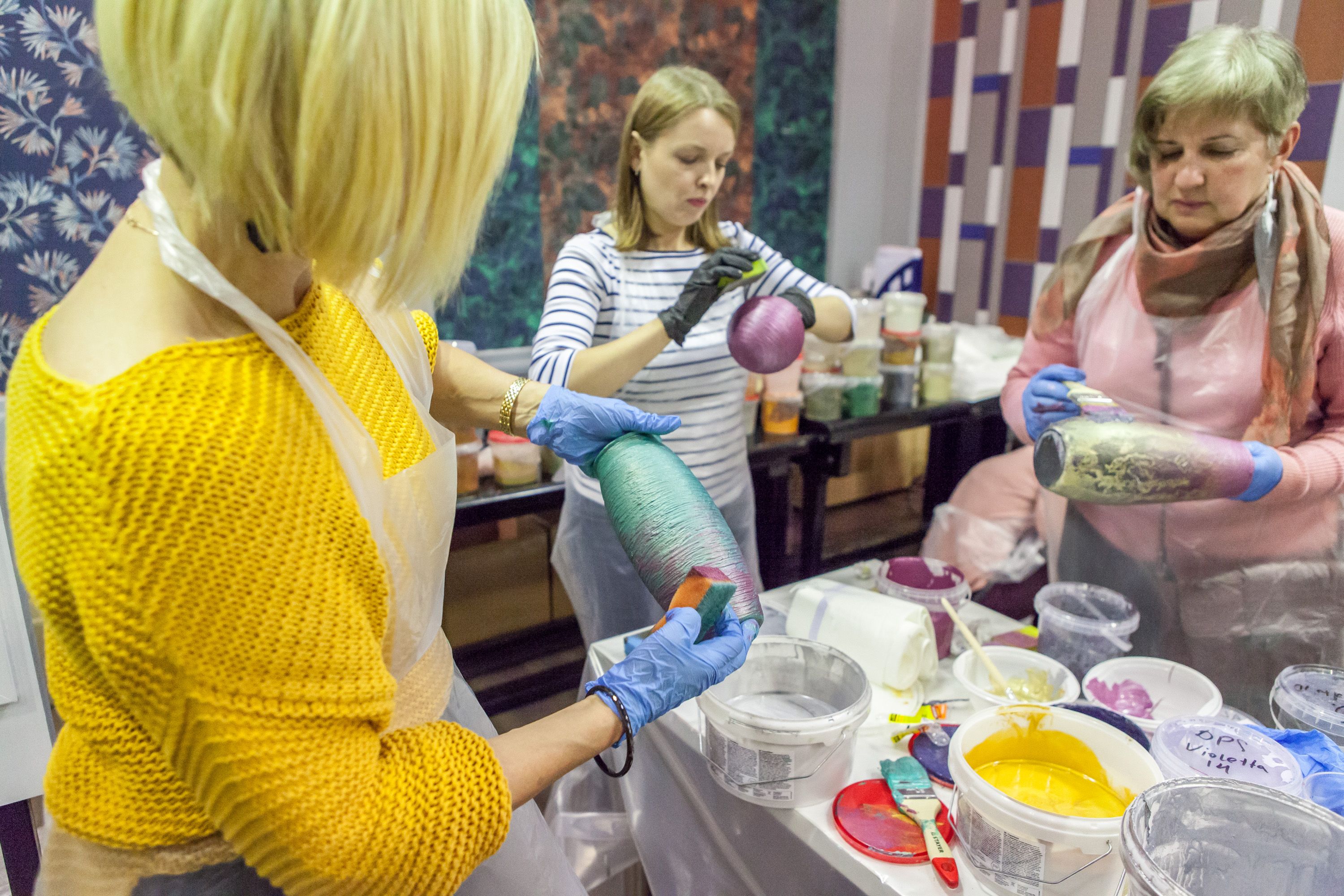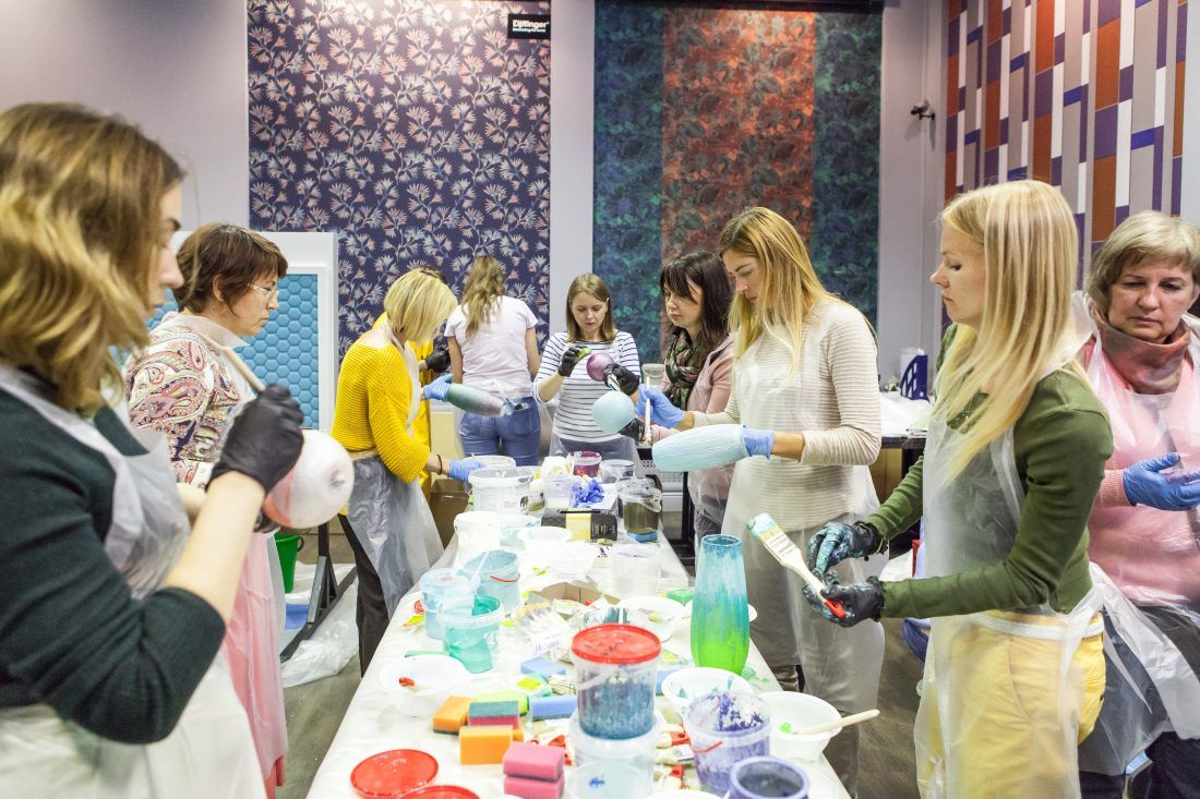 Как грунтовать поверхность, сколько слоев материала следует наносить, как достигаются  визуальные эффекты — гости смогли своими глазами увидеть все этапы работы. После выступления Кирилла участники самостоятельно поработали с материалом, декорируя вазы.