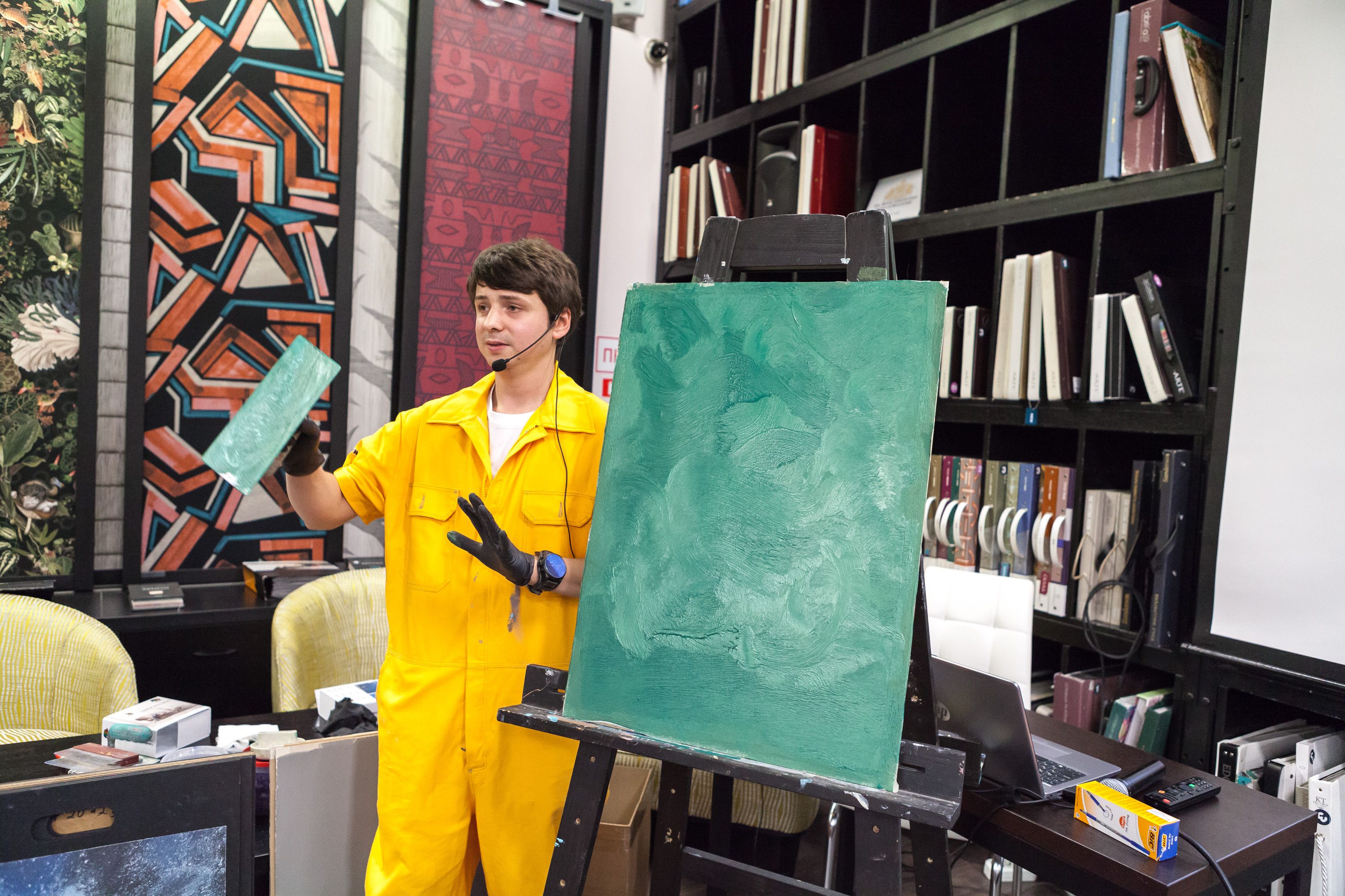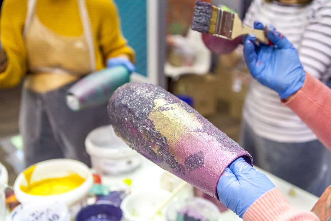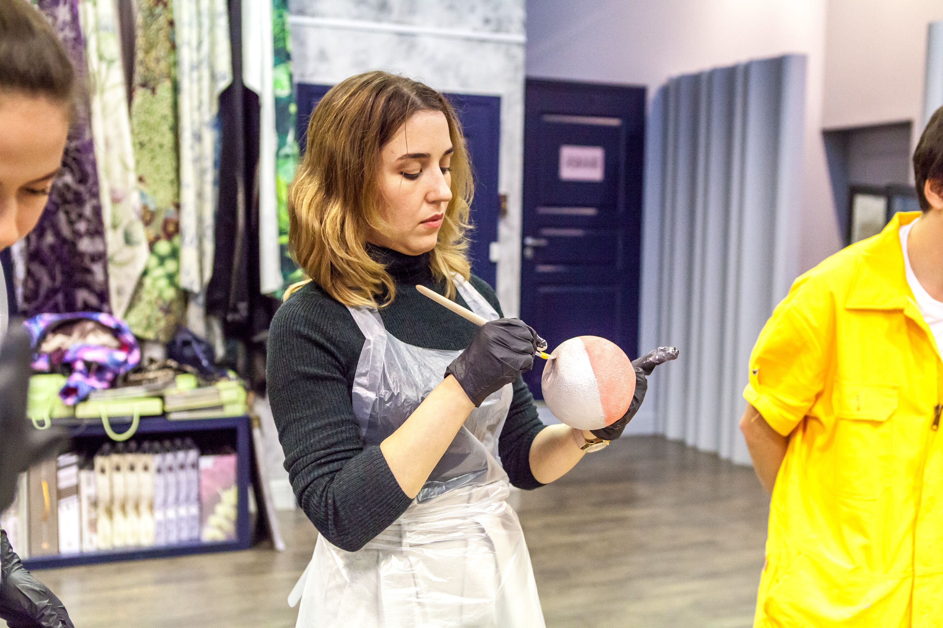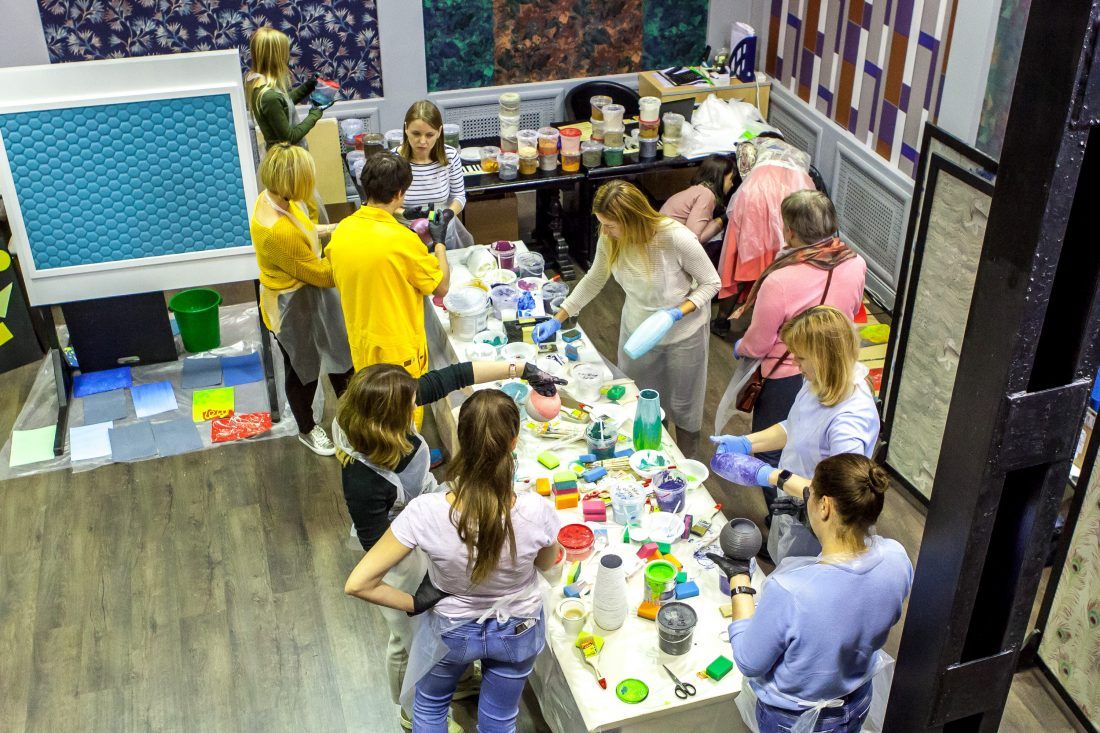 Как грунтовать поверхность, сколько слоев материала следует наносить, как достигаются  визуальные эффекты — гости смогли своими глазами увидеть все этапы работы. После выступления Кирилла участники самостоятельно поработали с материалом, декорируя вазы.