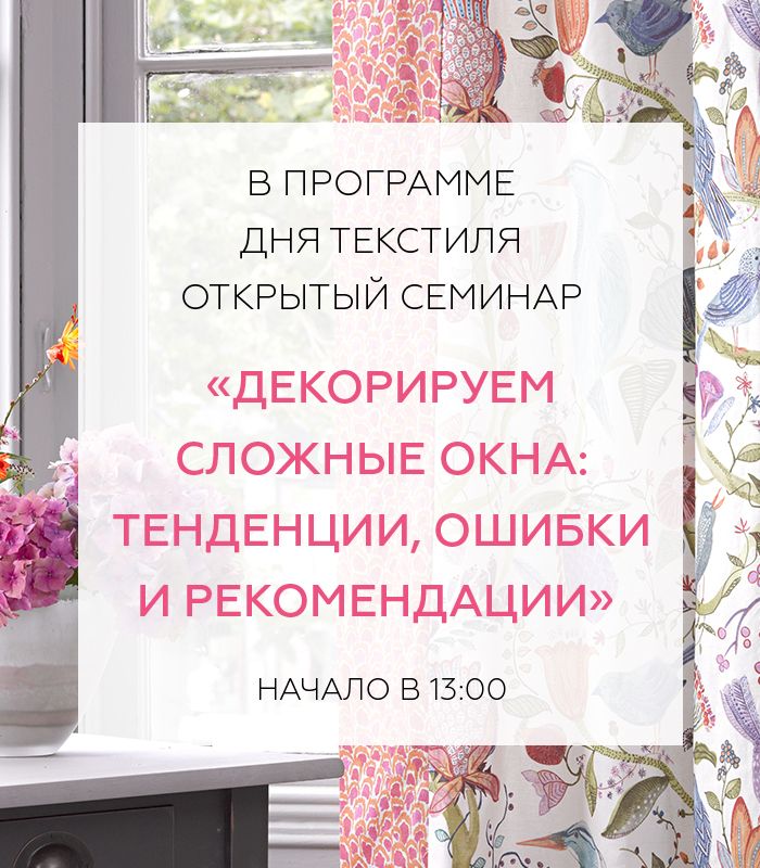 В программе Дня текстиля состоится открытый семинар «Декорируем сложные окна: тенденции, ошибки и рекомендации». Начало в 13:00.