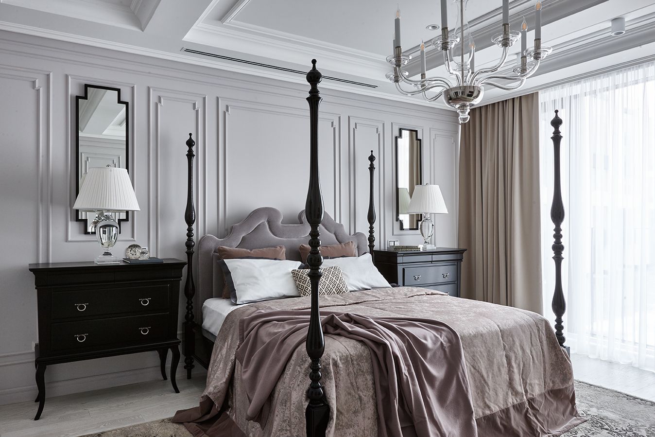Дизайнеры проекта решили выдержать проект в светлых тонах. Для стен спальни был выбран серый цвет, который дополнили мягкие бежевые оттенки мебели и текстиля. Визуальным равновесием выступил контрастный венге кровати, тумбочек и зеркальных рам.
