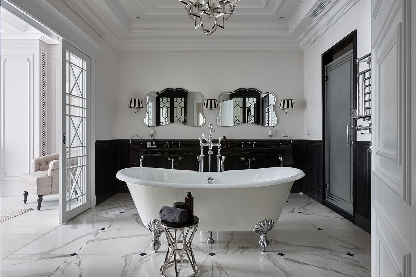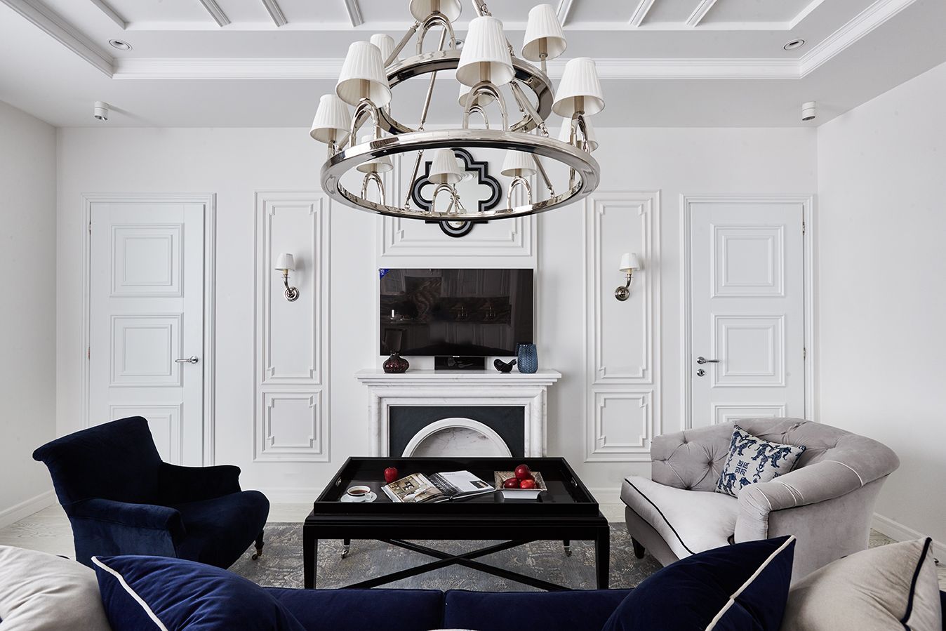 Весь интерьер квартиры выдержан в едином стиле. Стены и двери гостиной также украшают рамы из тонких молдингов, которые дизайнеры дополнили симметричными светильниками и оригинальным зеркалом.