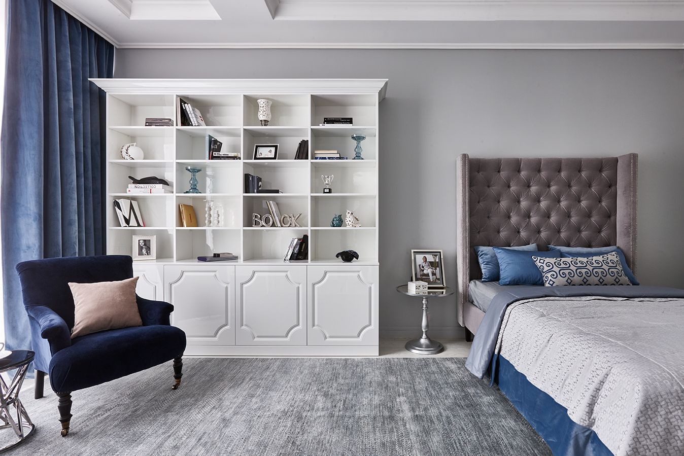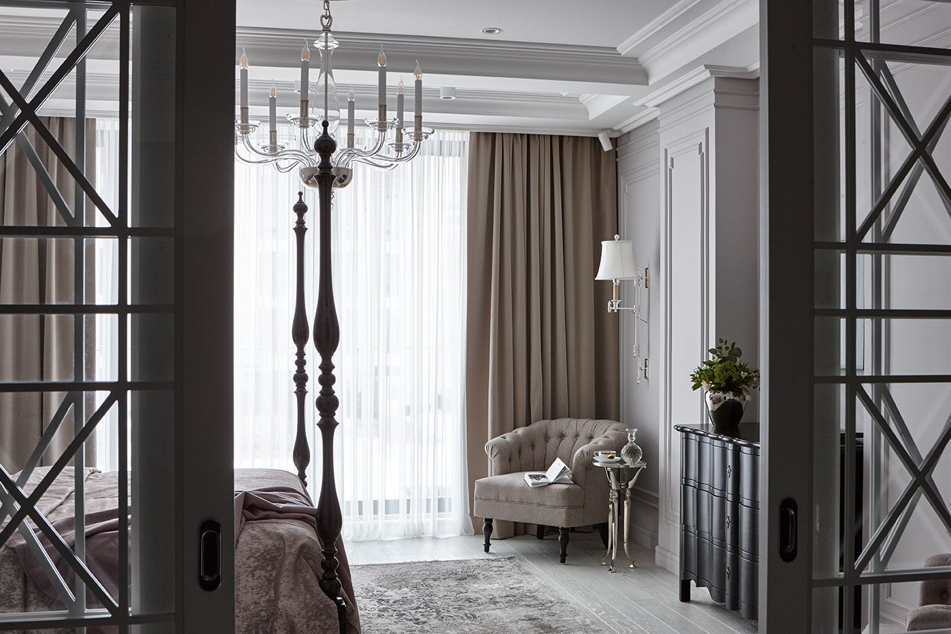 Дизайнерским решением для оформления стен стала лепнина. Тонкие молдинги ORAC DECOR превратились на стене в высокие рамы, выкрашенные в тот же светло-серый цвет. Декоративные элементы расположены симметрично и добавляют интерьеру привлекательности, классической изысканности и баланса.