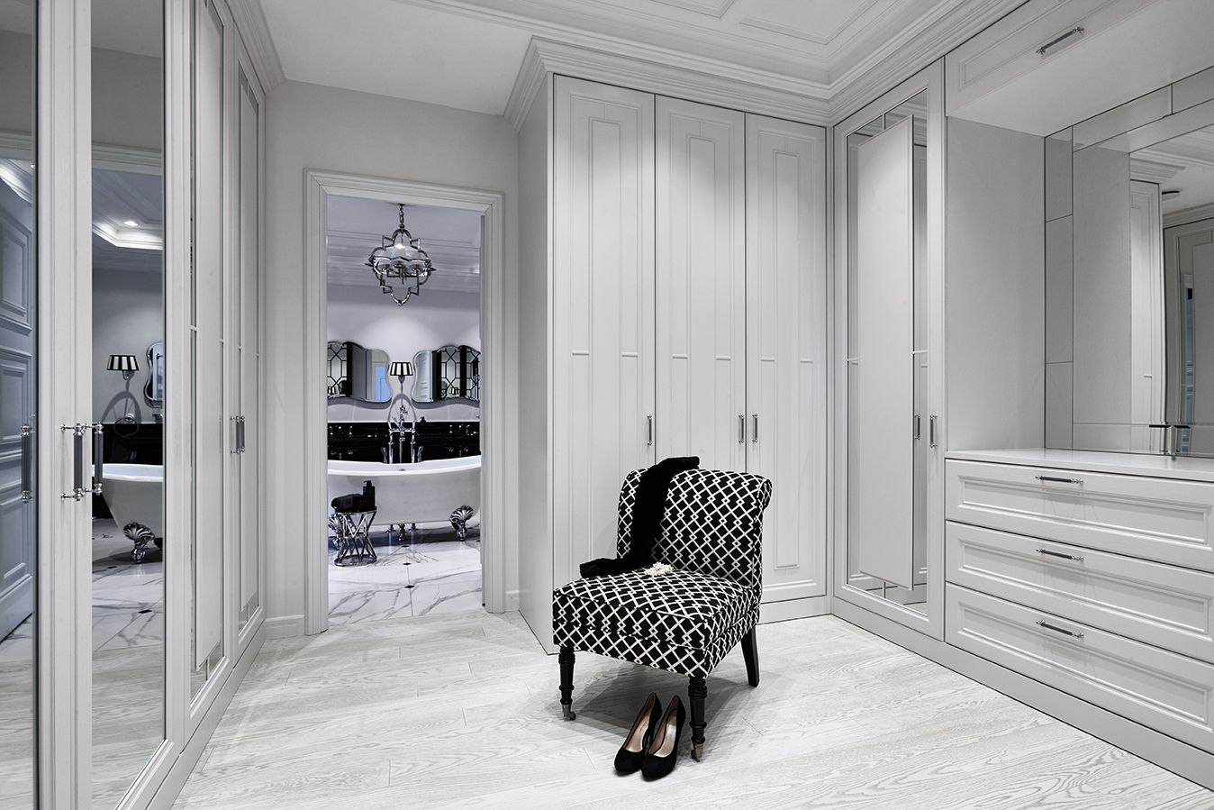 Особенностью гардеробной комнаты проекта стало ее расположение. В почти сакральное для каждой хозяйки место можно попасть через ванную. Строгие прямые формы мебели и сложный потолок с подсветкой вновь дополняют широкие карнизы ORAC DECOR.