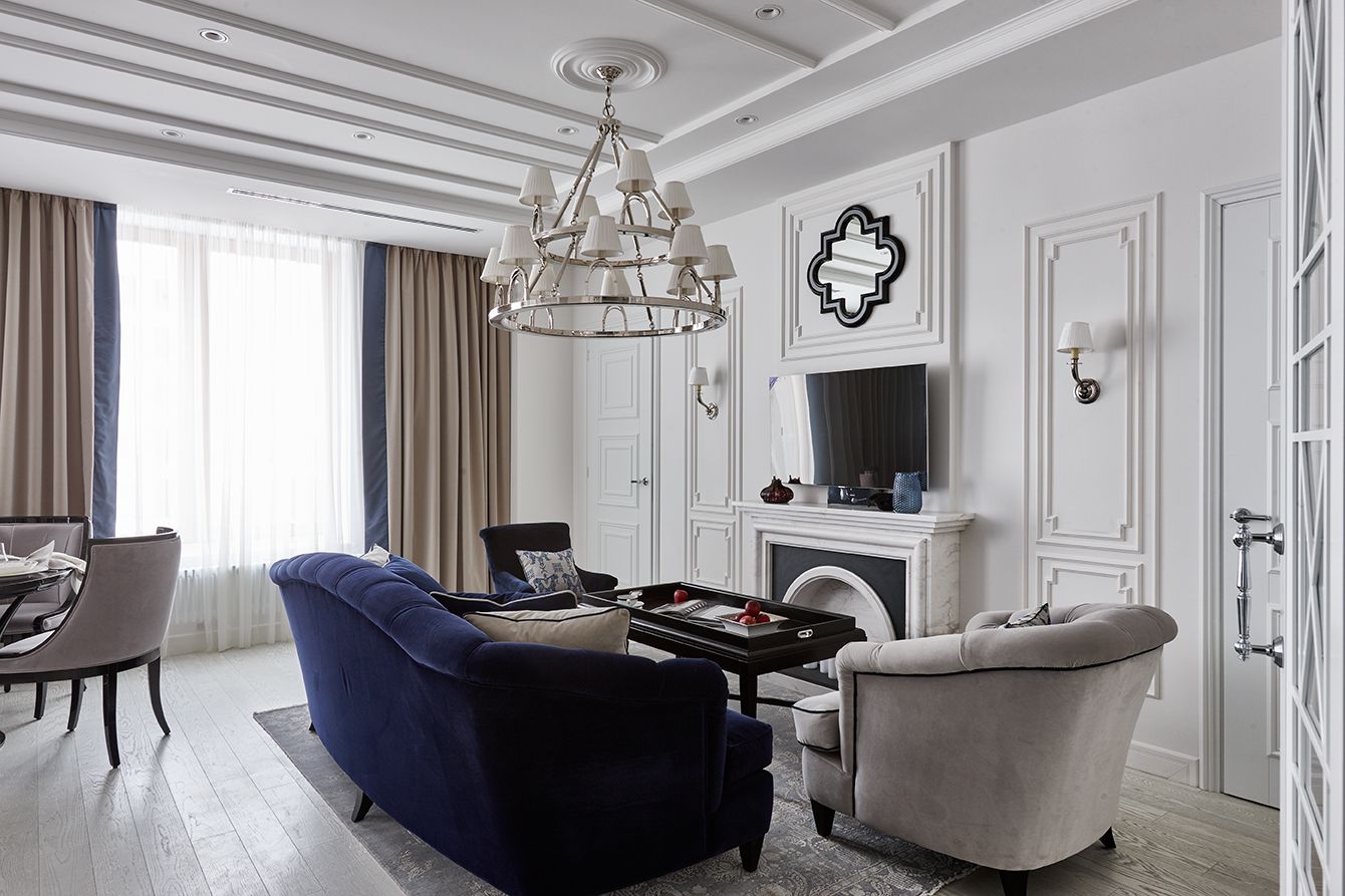 Для интерьерного решения гостиной дизайнеры остановились на традиционном белом цвете, который визуально расширяет пространство. Акцентом комнаты стали синий бархатный диван, плотные портьеры и декоративный элемент на камине лаконичной формы. Сложный многоуровневый потолок со встроенными светильниками сыграл важную роль, создавая теневой рисунок на поверхностях.