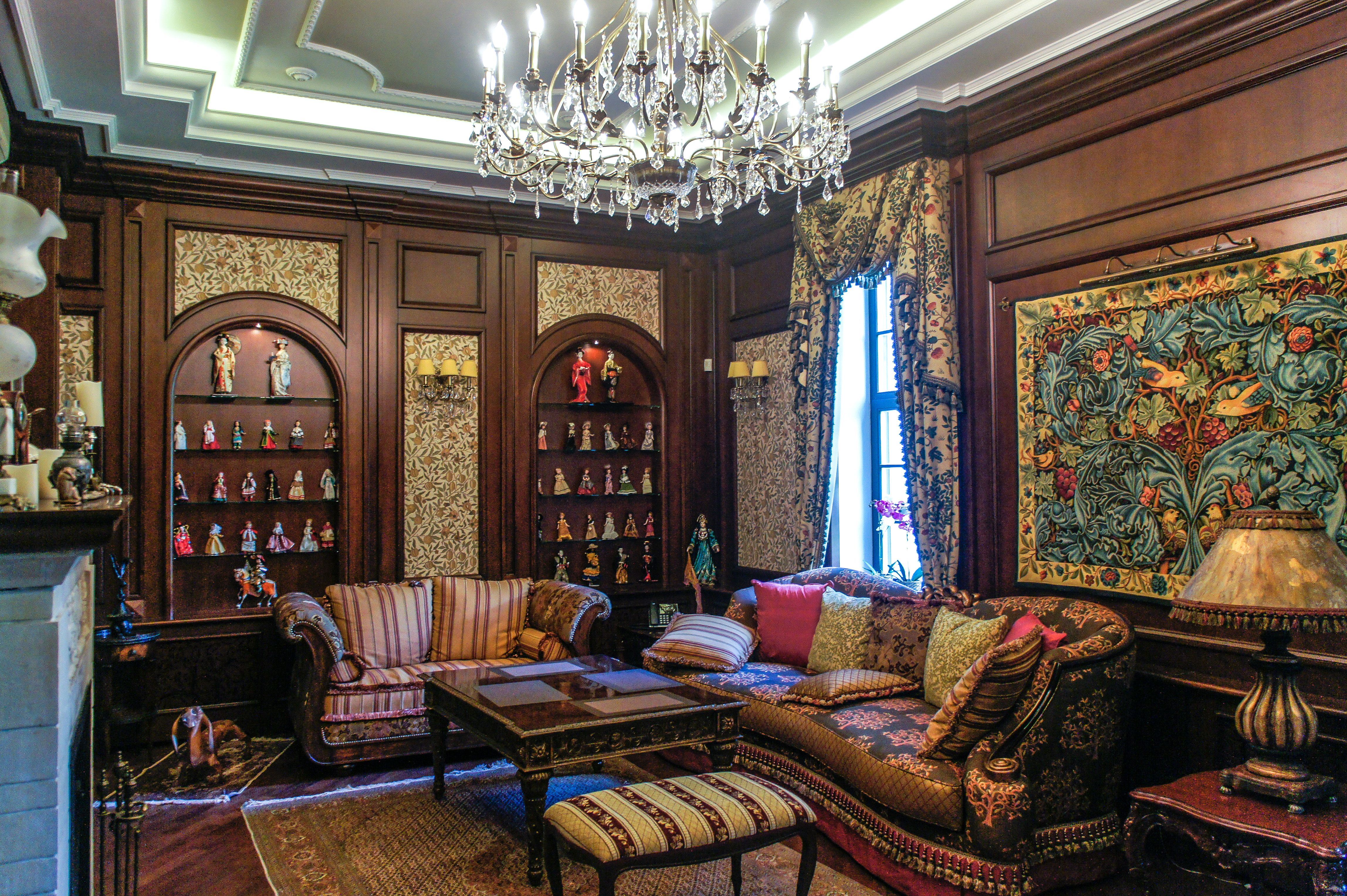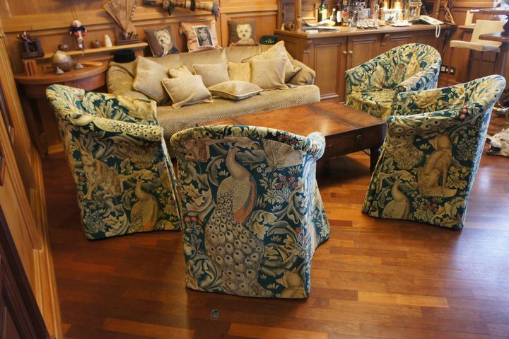Специально для гостиной была заказана оригинальная шпалера из Англии. (Безворсовый тканый настенный ковёр с сюжетными и орнаментальными композициями — прим.) Заказ пришлось ждать несколько месяцев, зато текстильное оформление приобрело законченность. Здесь мы видим легендарный узор Strawberry Thief («Клубничный вор»), который художник создал, наблюдая за дроздом, лакомившимся клубникой в его саду.