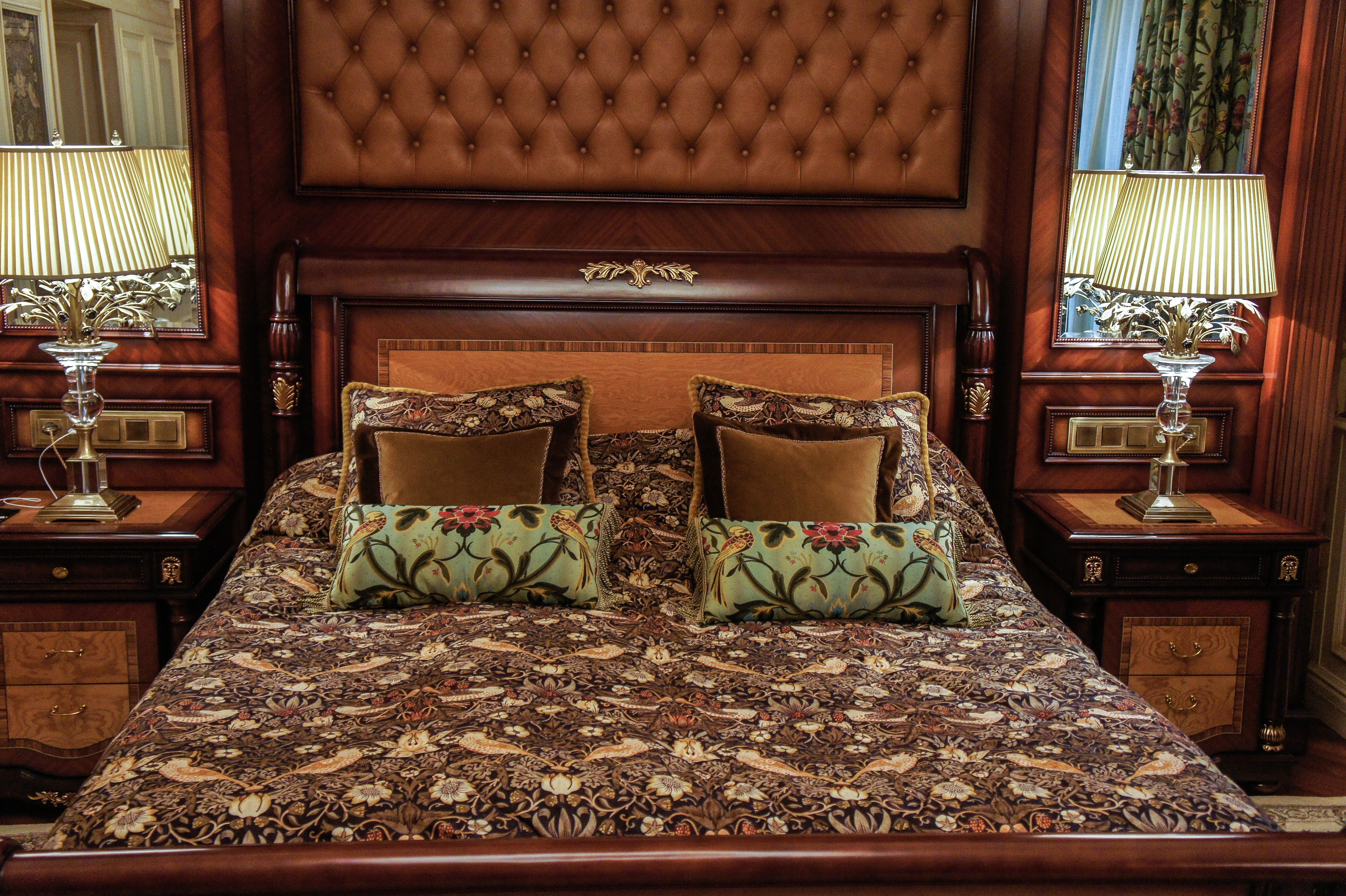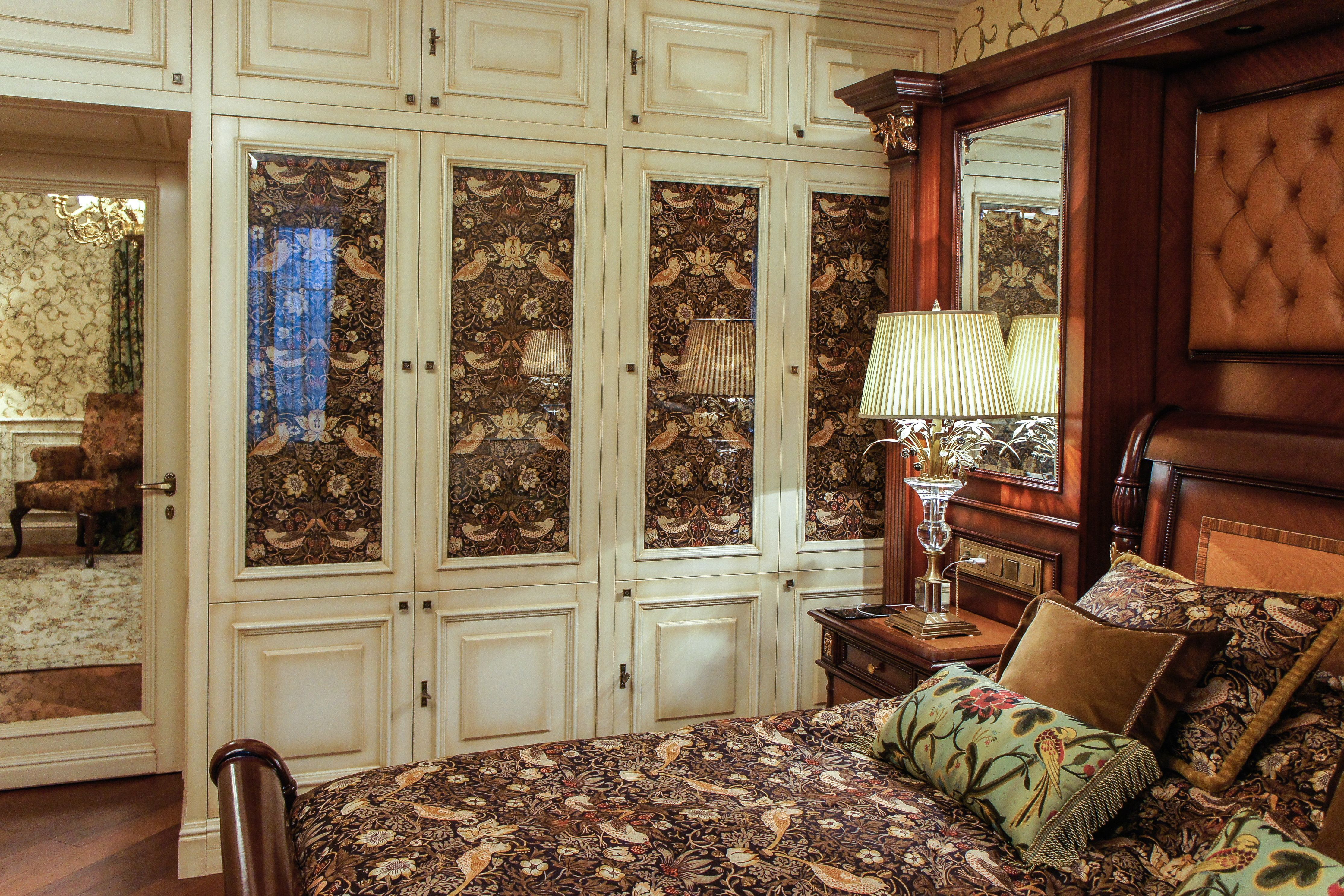 По задумке дизайнера тканью задекорировали даже дверцы шкафа, это придало интерьеру дополнительную камерность. Покрывало и подушки, сшитые на заказ, поддержали цветовую гамму интерьера.