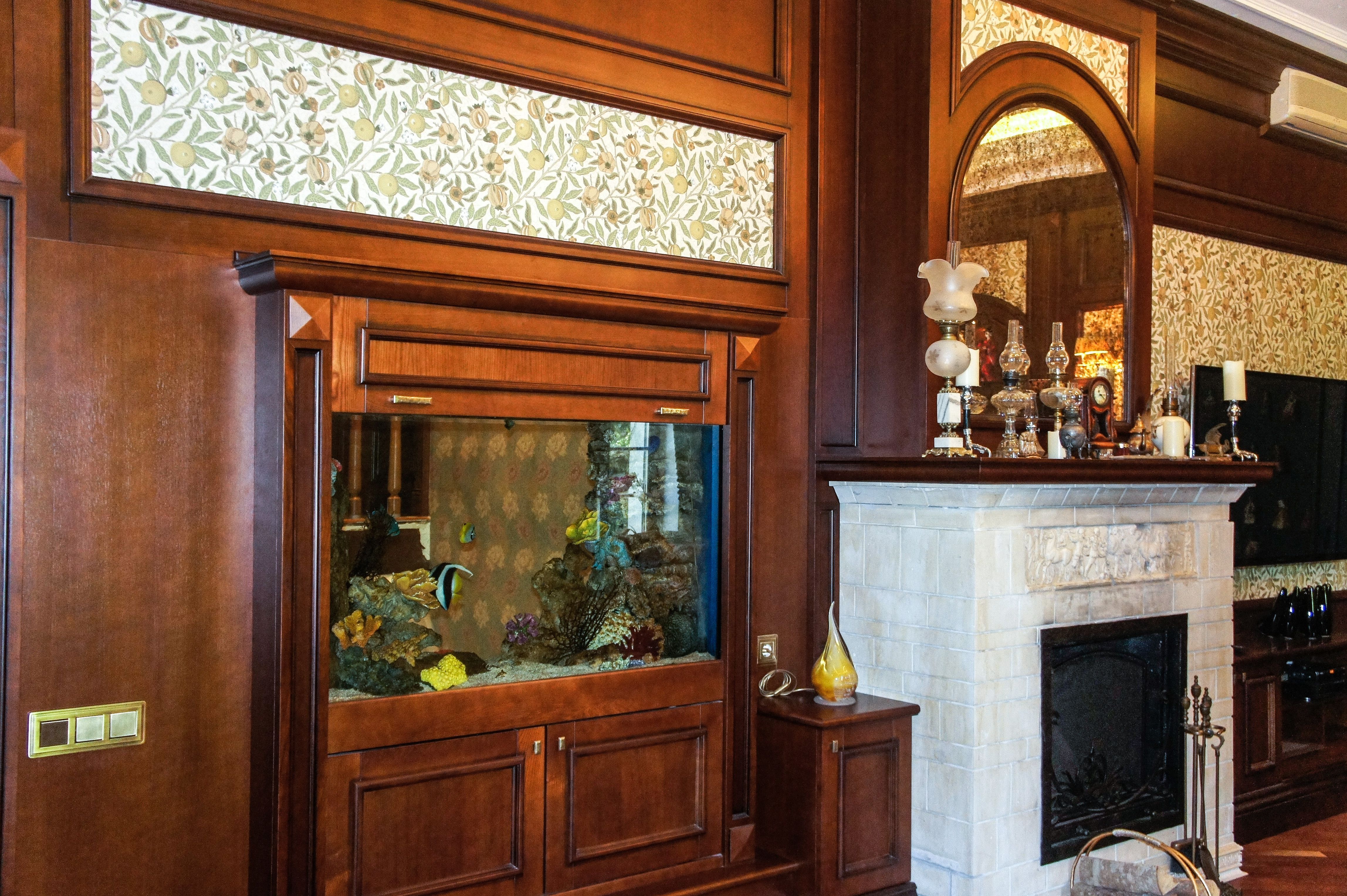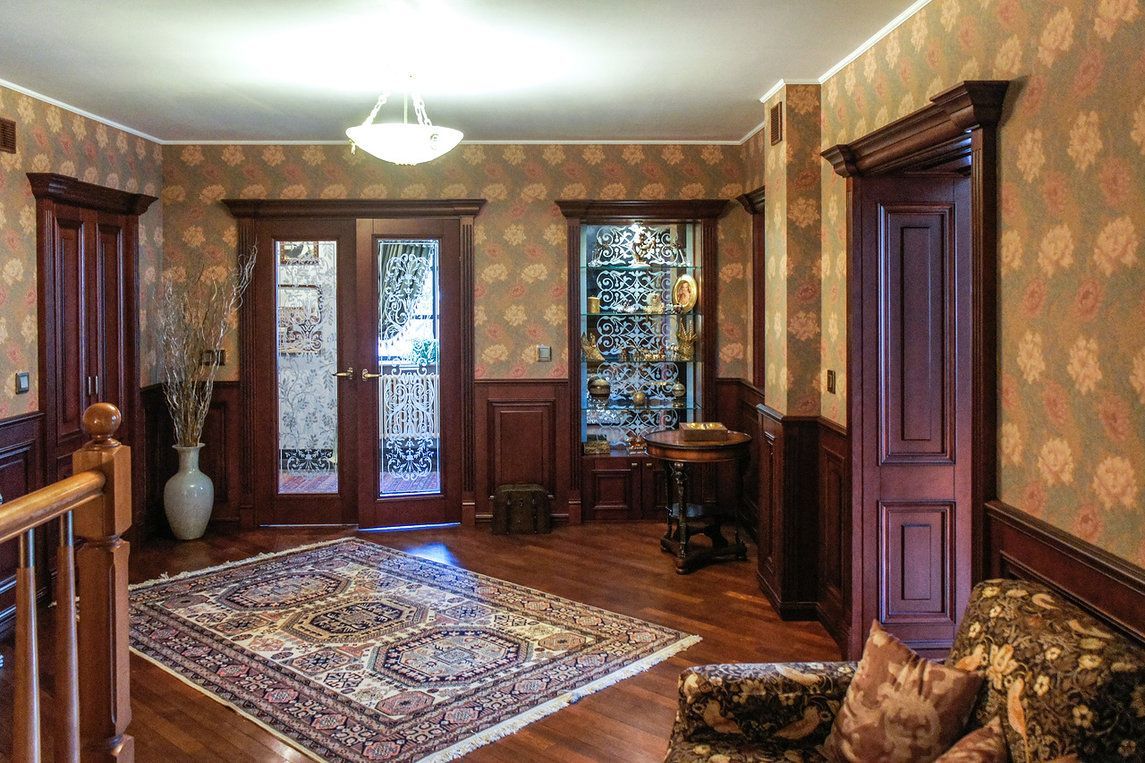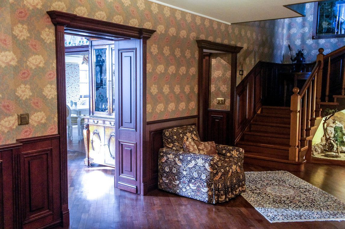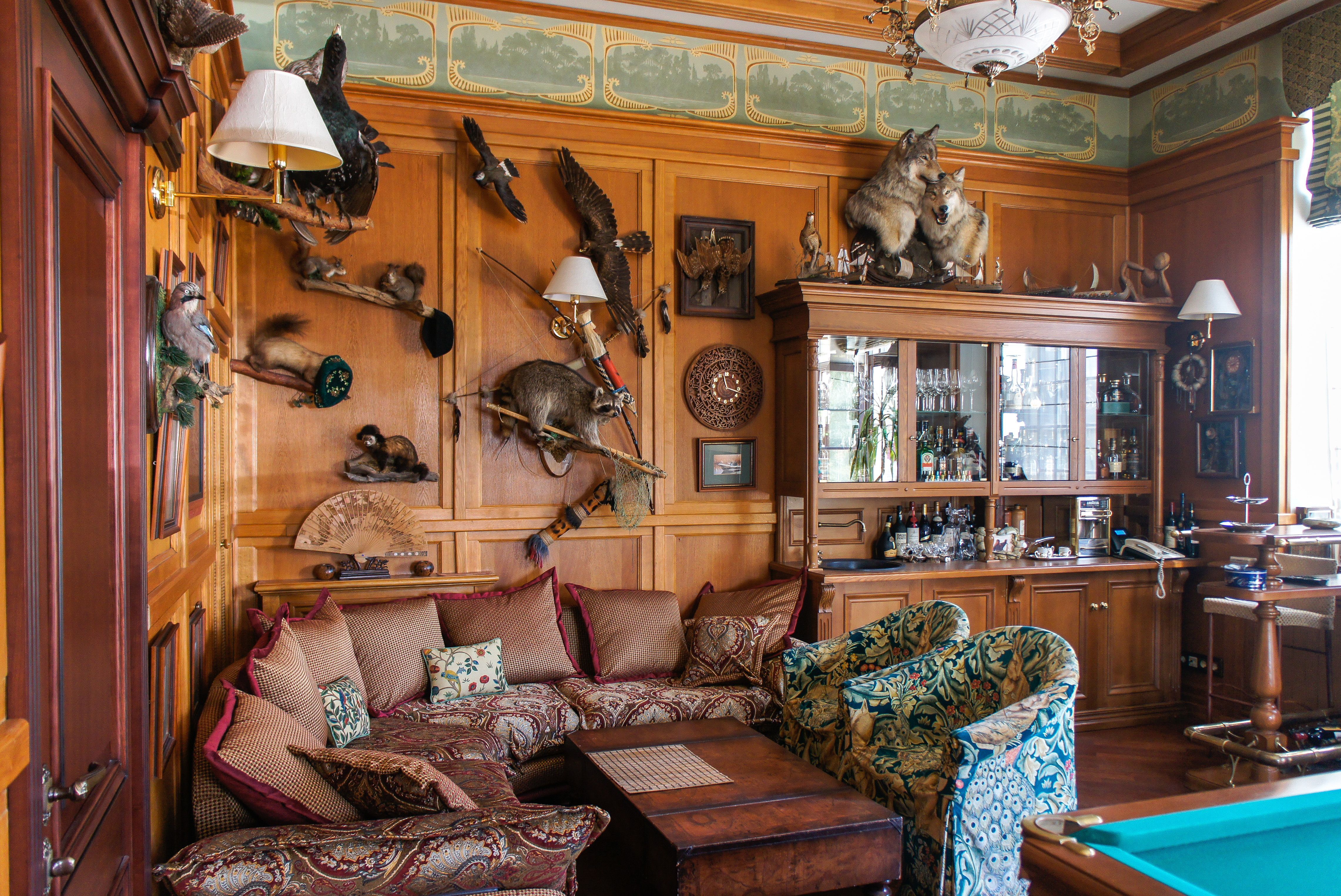 Для декорирования комнаты семейного хобби, связанного с охотой, была выбрана ткань с изображением сказочного леса из коллекции Morris Archive II. Сложный узор на креслах оттенил благородную фактуру натурального дерева мебели и пола.