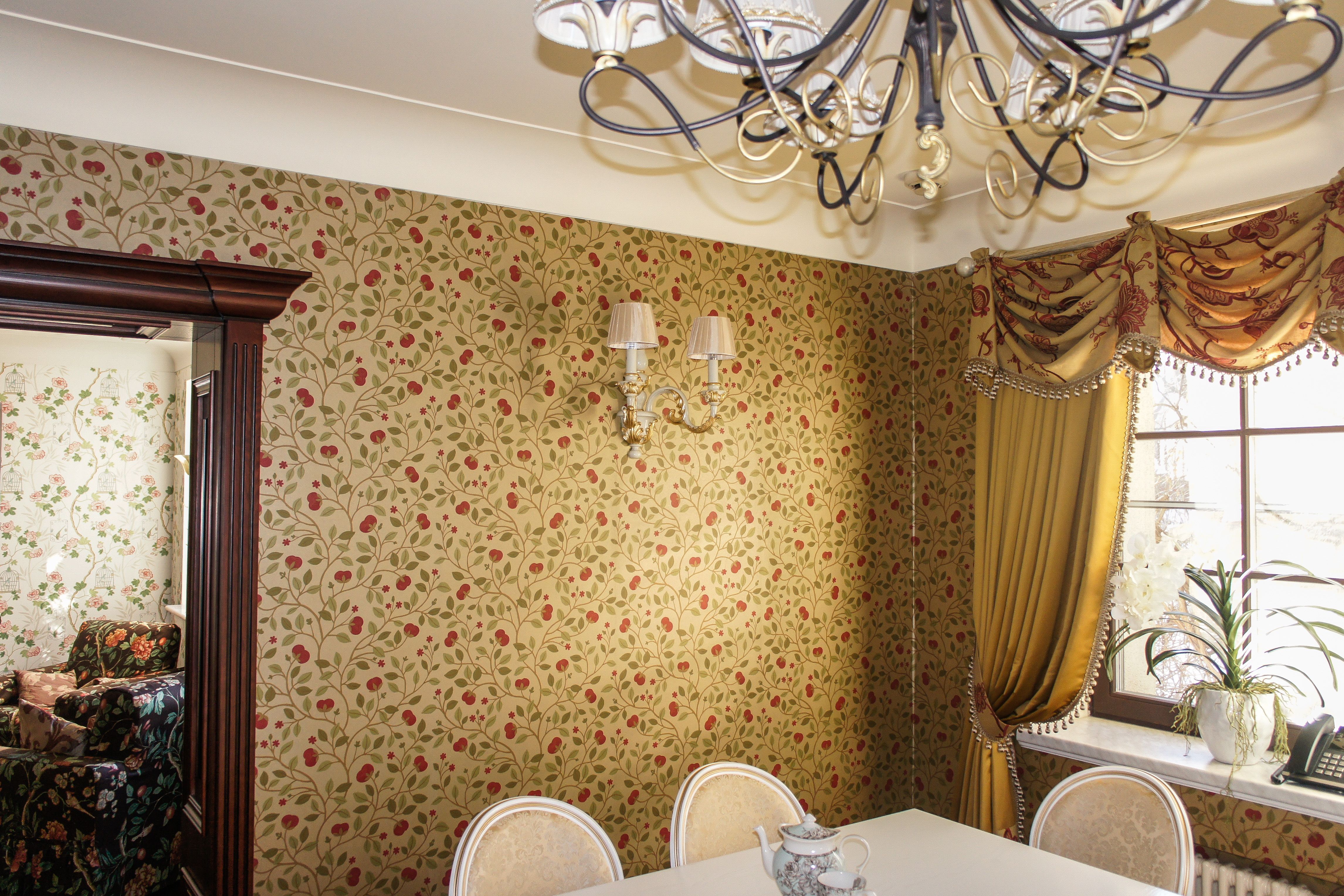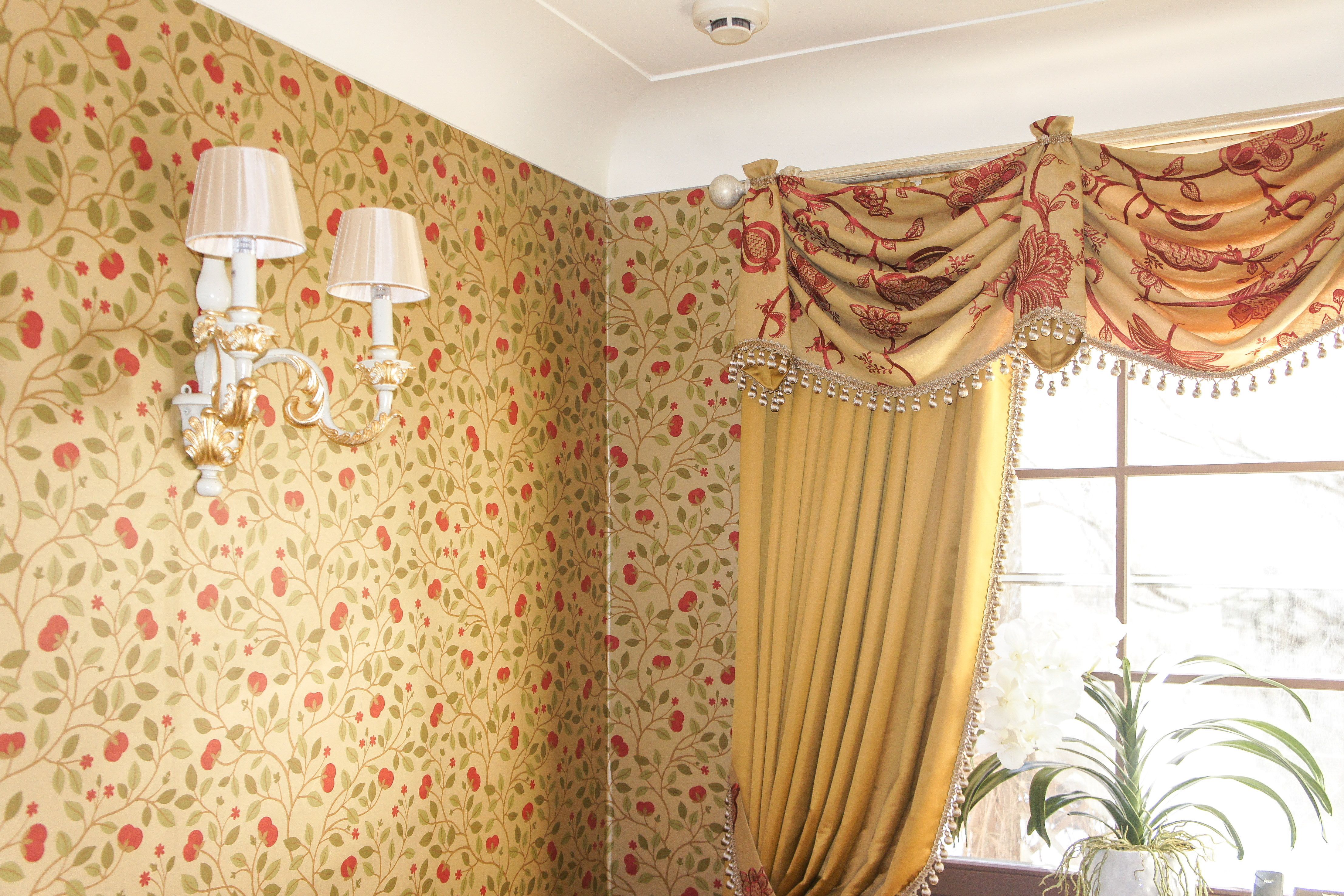 — В гостиной я использовала знаменитые обои Морриса с изображением плодов граната. Как и в целом для творчества Морриса, для этого дизайна характерны насыщенные яркие цвета. Прототипом для оформления окон в доме послужил поздний георгианский стиль 1714-1770-х годов. С хозяйкой дома мы вместе вдохновлялись историческими интерьерами, просматривали книги по искусству. Эскизы будущих портьер создавали с архивных рисунков. В итоге силуэт окон определили изысканные ламбрекены, украшенные тесьмой с бахромой.
