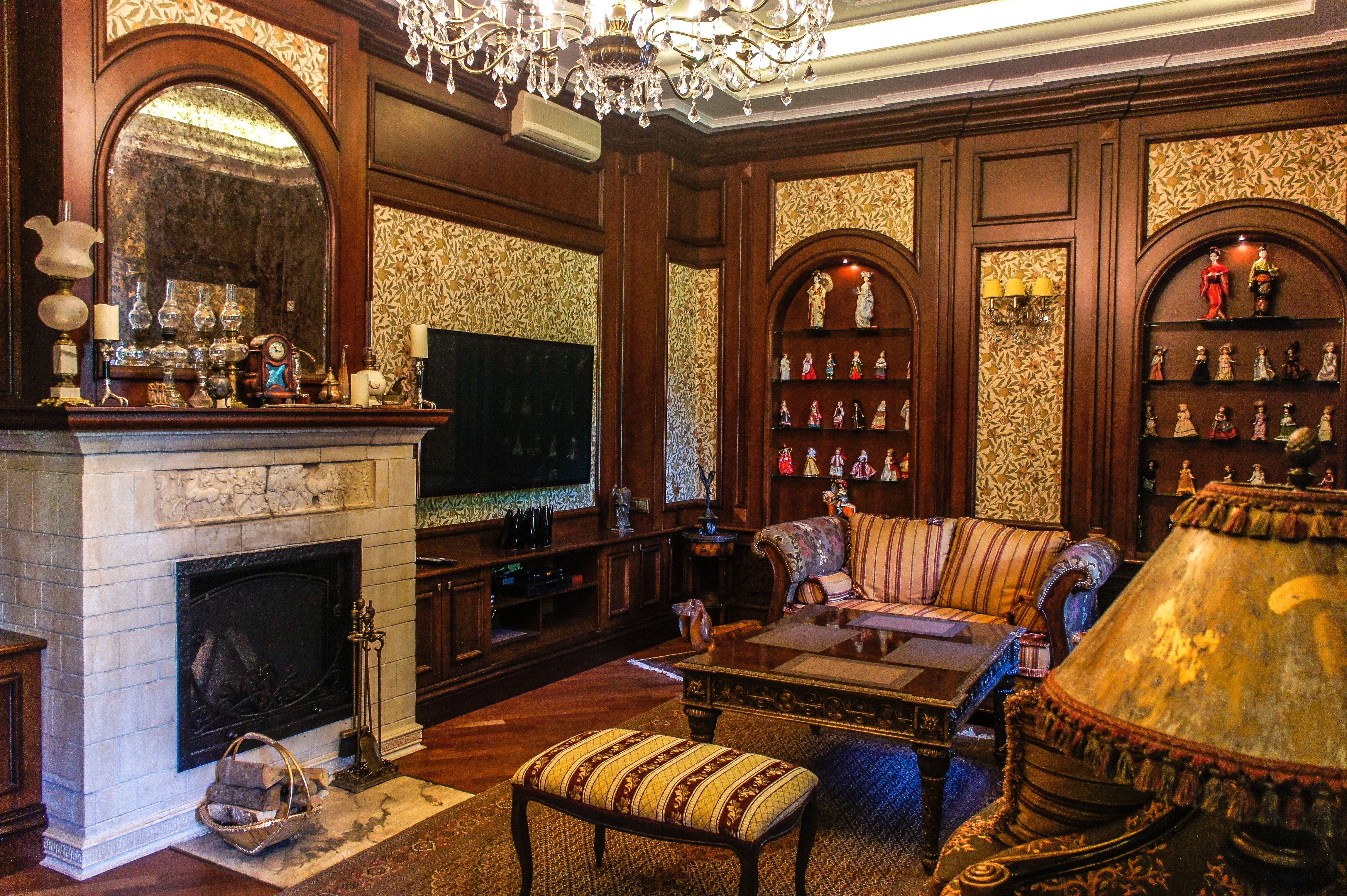 Для стиля английского загородного поместья характерно обилие текстиля: сложные портьеры с подхватами и ламбрекенами, коллекции диванных подушек и набивная обивка мягкой мебели призваны создать атмосферу домашнего уюта.