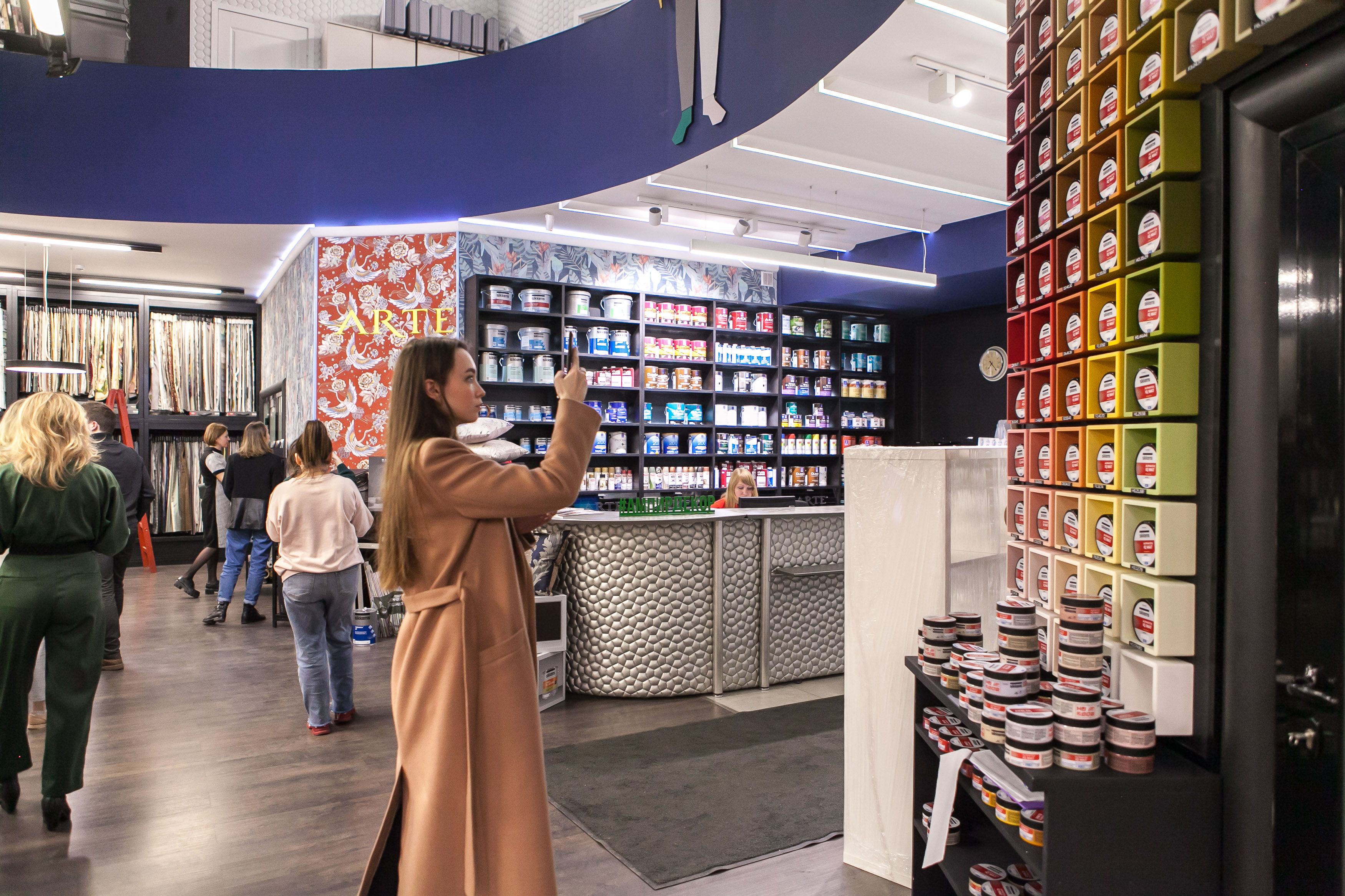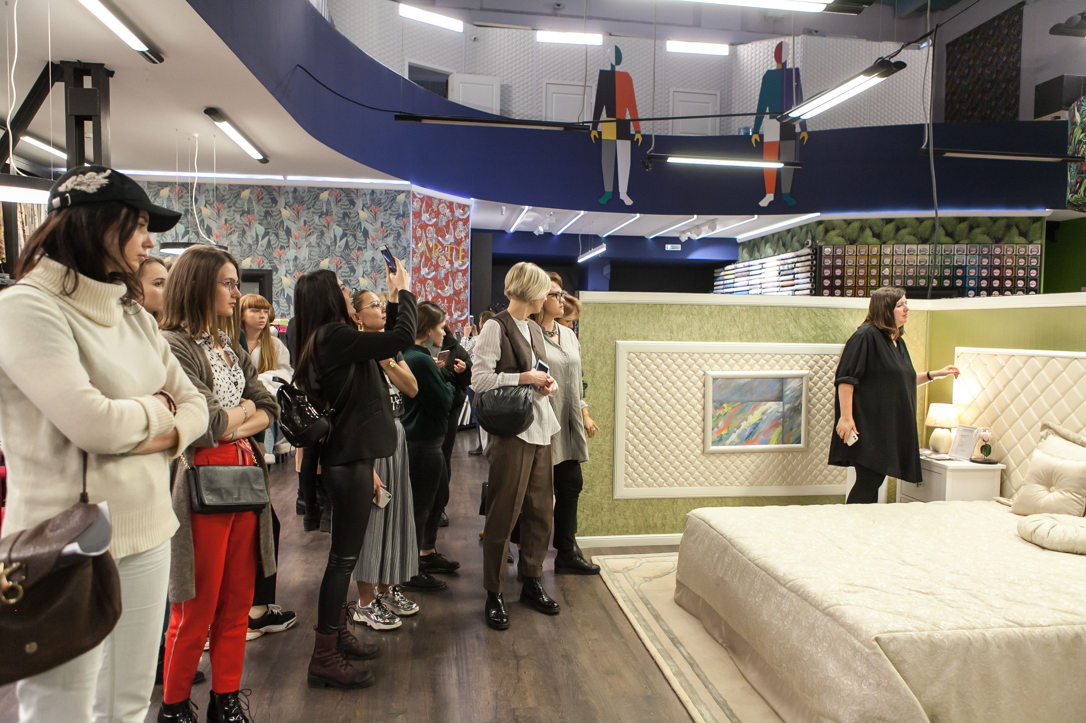 После лекции студенты Skillbox прошлись по Центру Дизайна Мануфактура 5 вместе с «гидом» и узнали о брендах обоев, красок и лепнины.