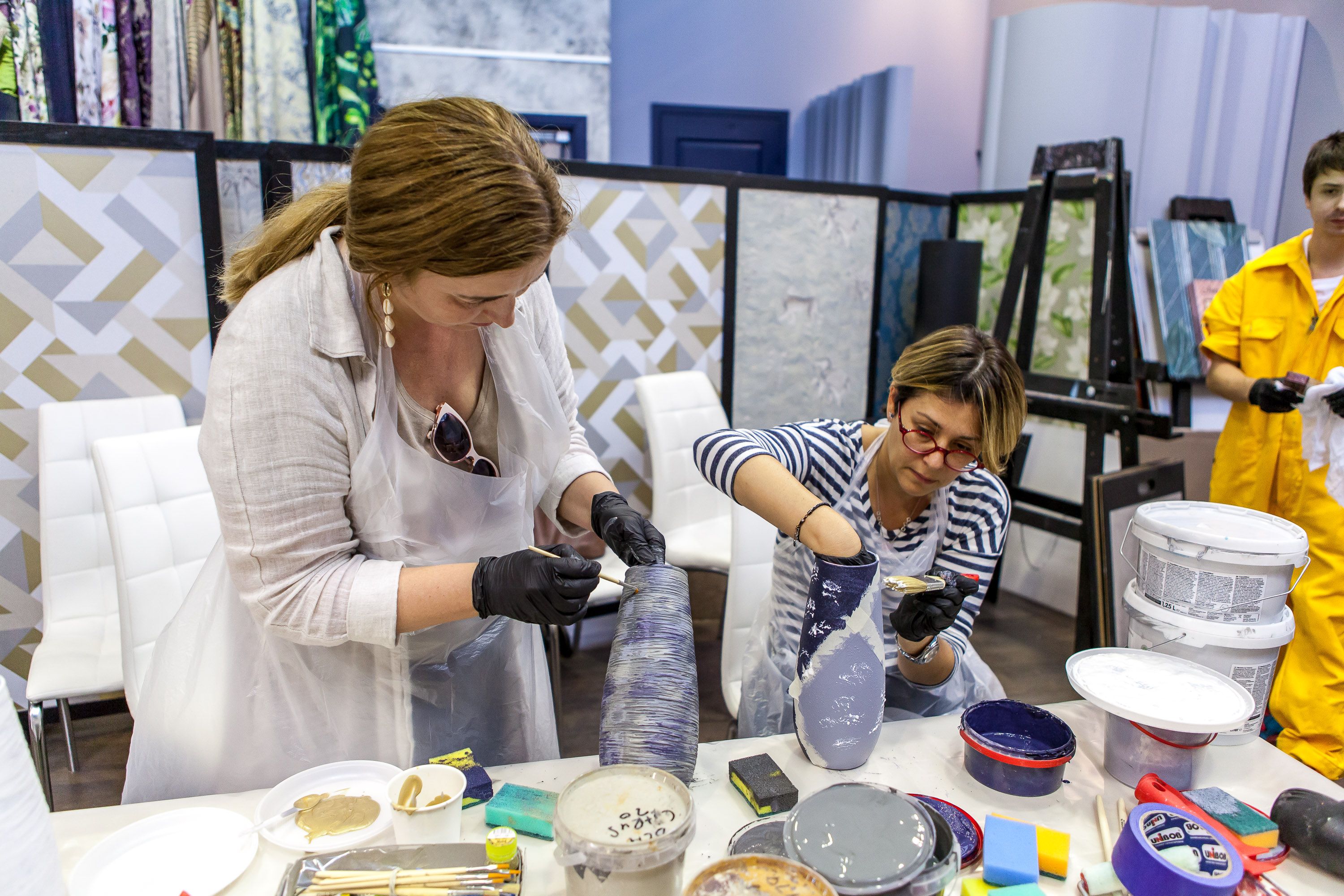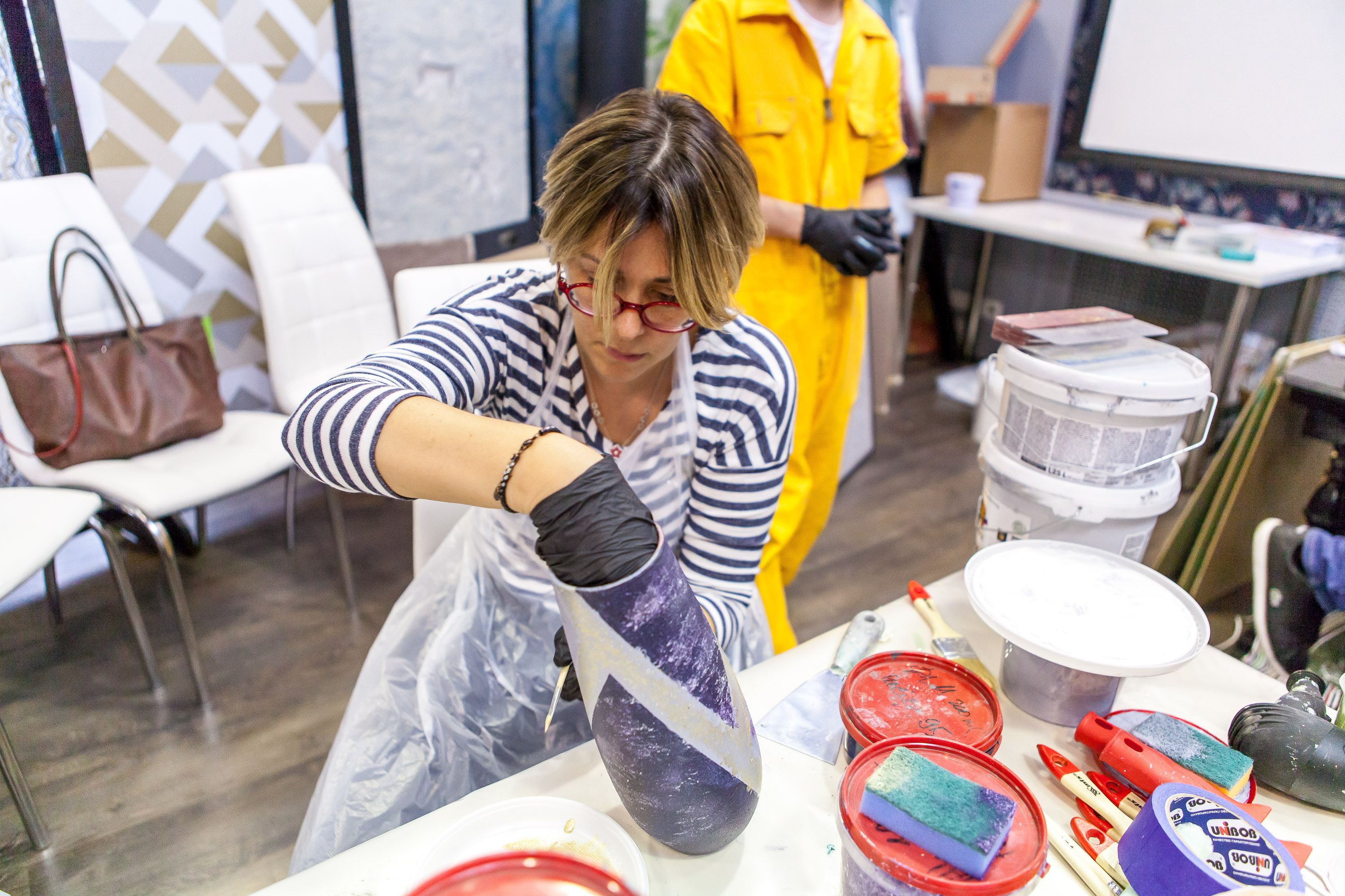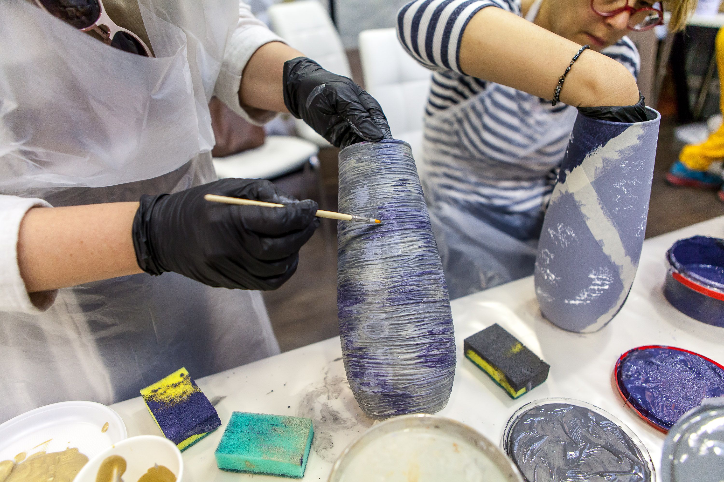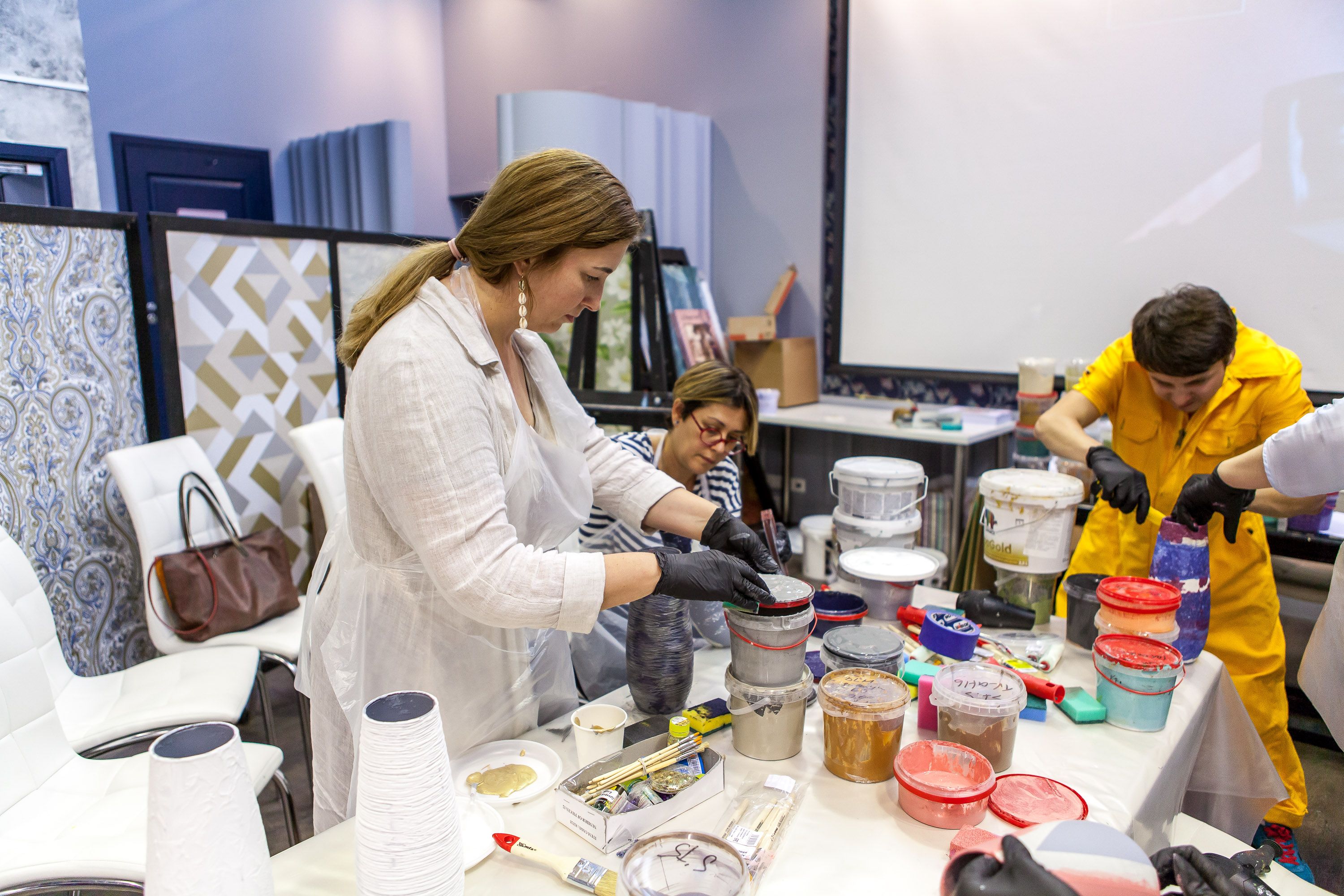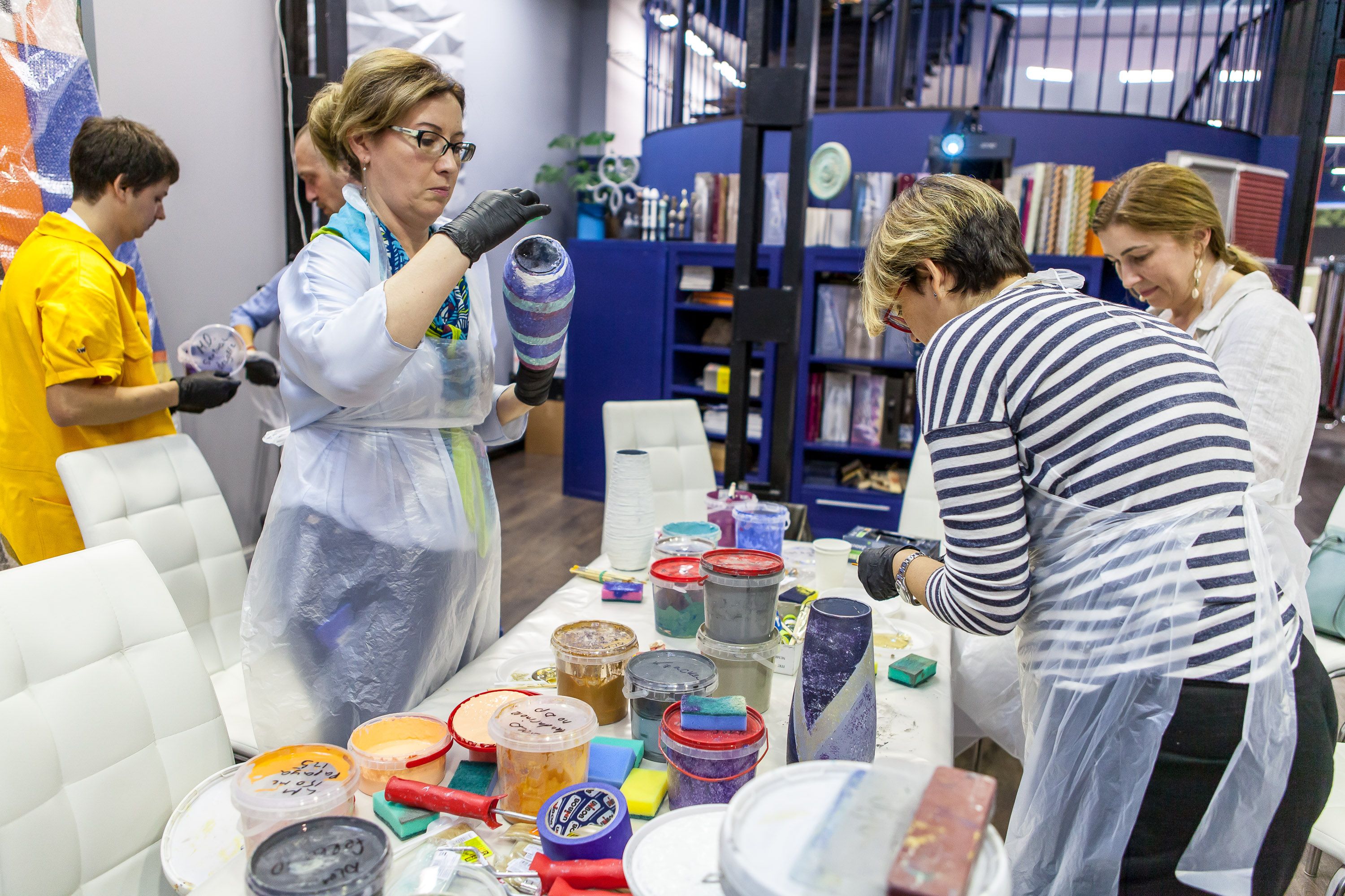 На творческом мастер-классе в Центре Дизайна Мануфактура 5 гости познакомились с возможностями декоративных штукатурок и украсили ими вазы.