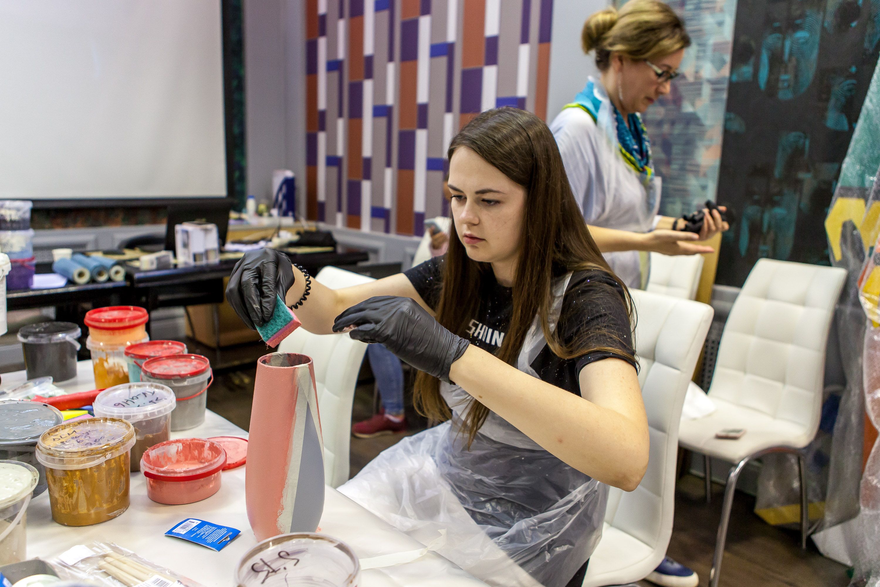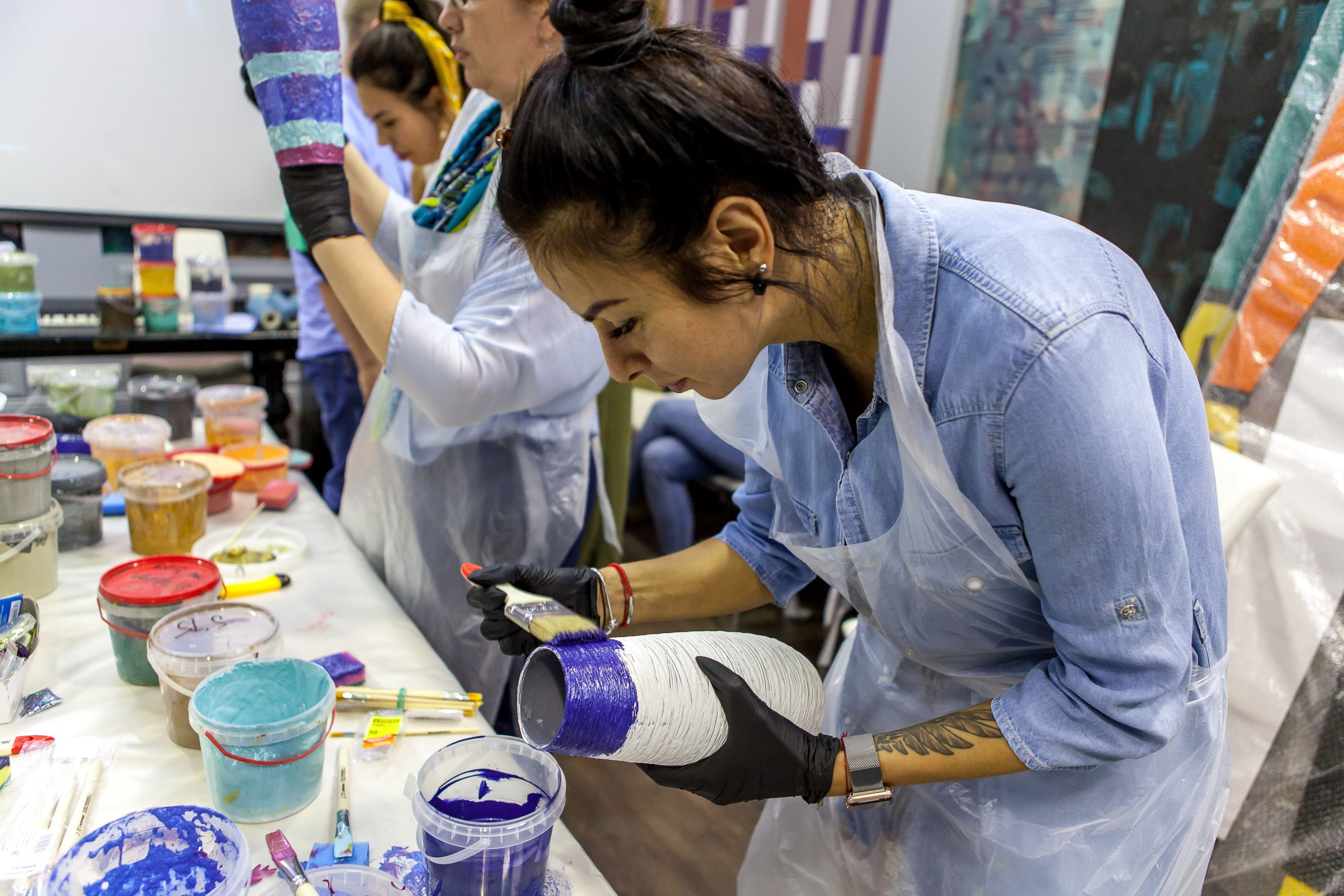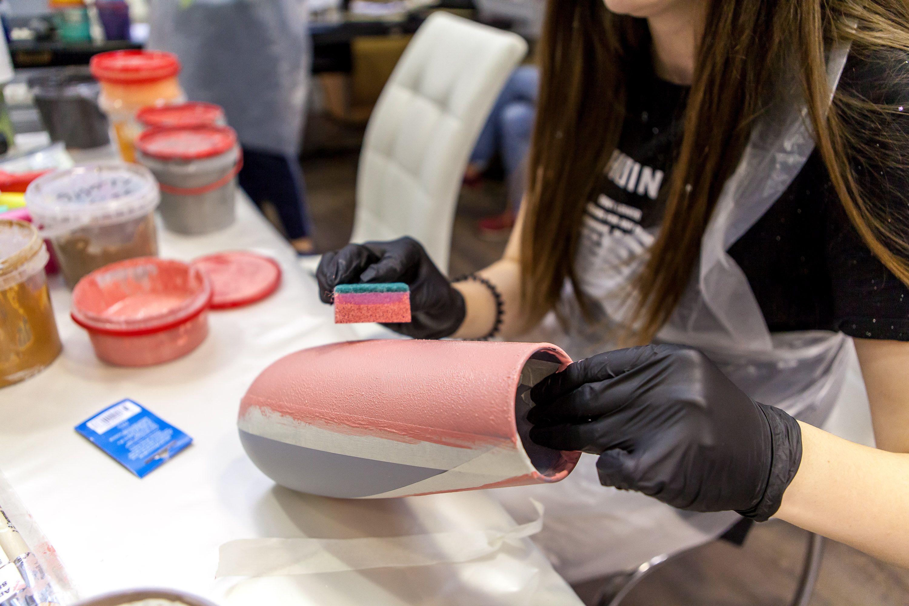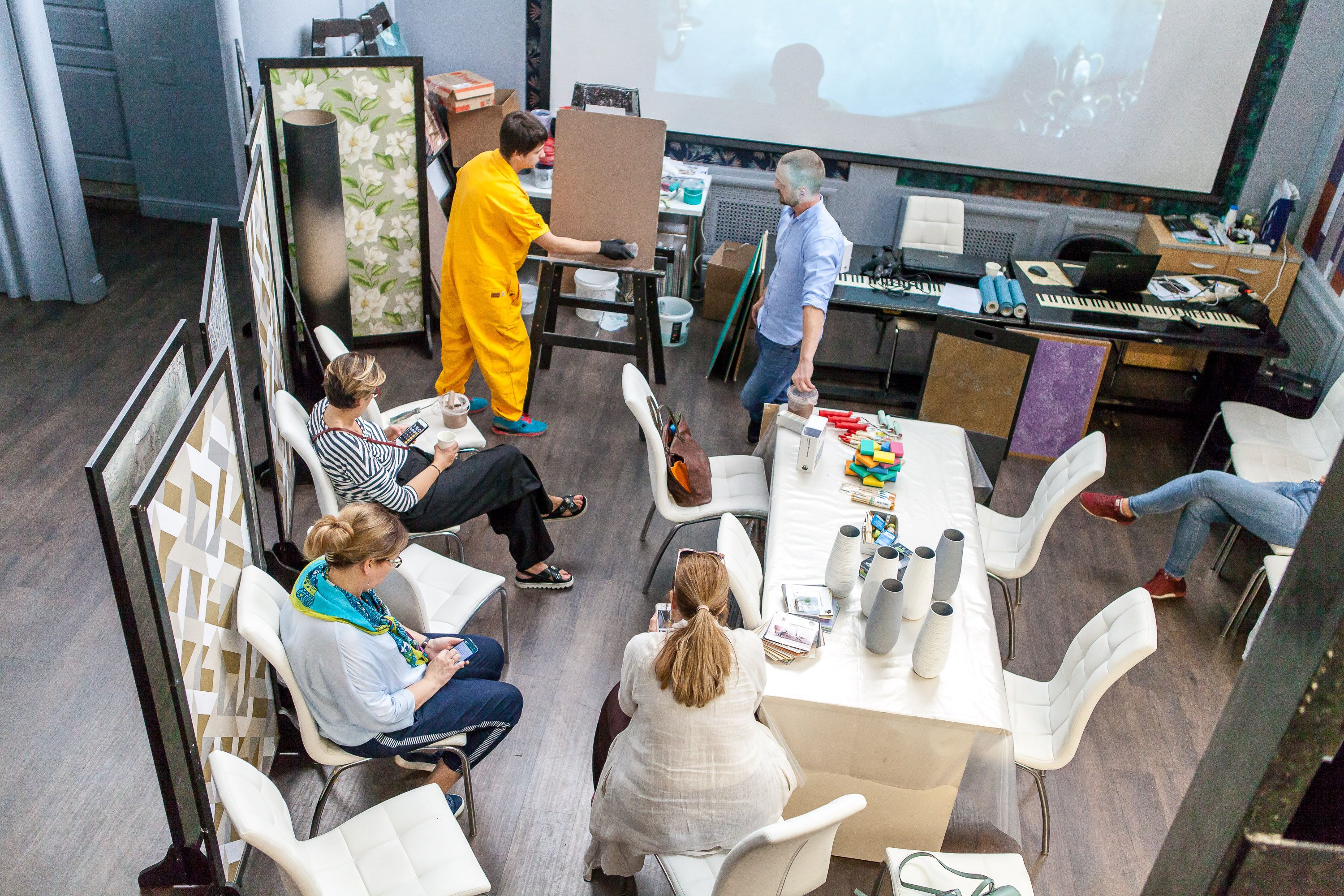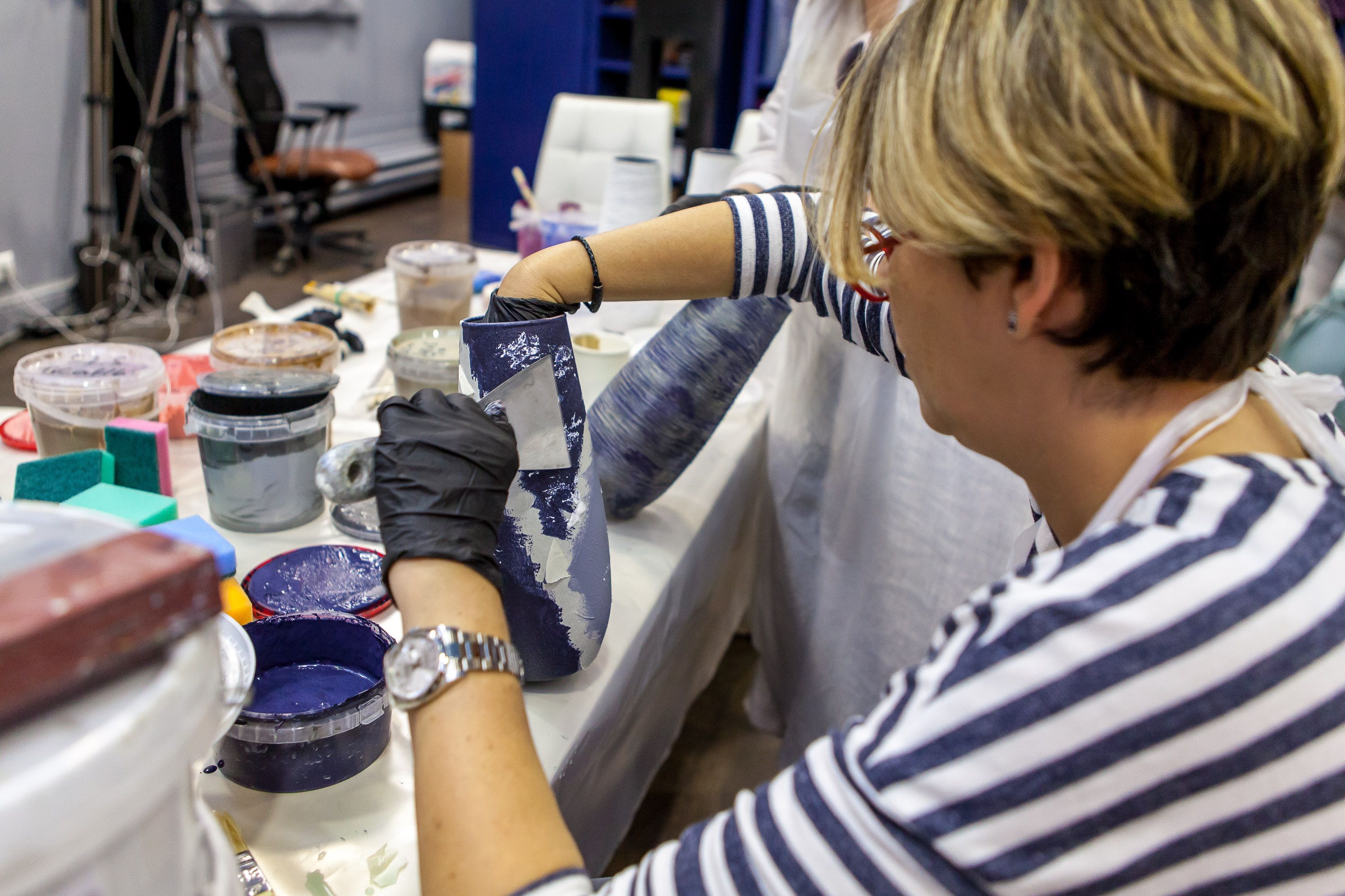 На творческом мастер-классе в Центре Дизайна Мануфактура 5 гости познакомились с возможностями декоративных штукатурок и украсили ими вазы.