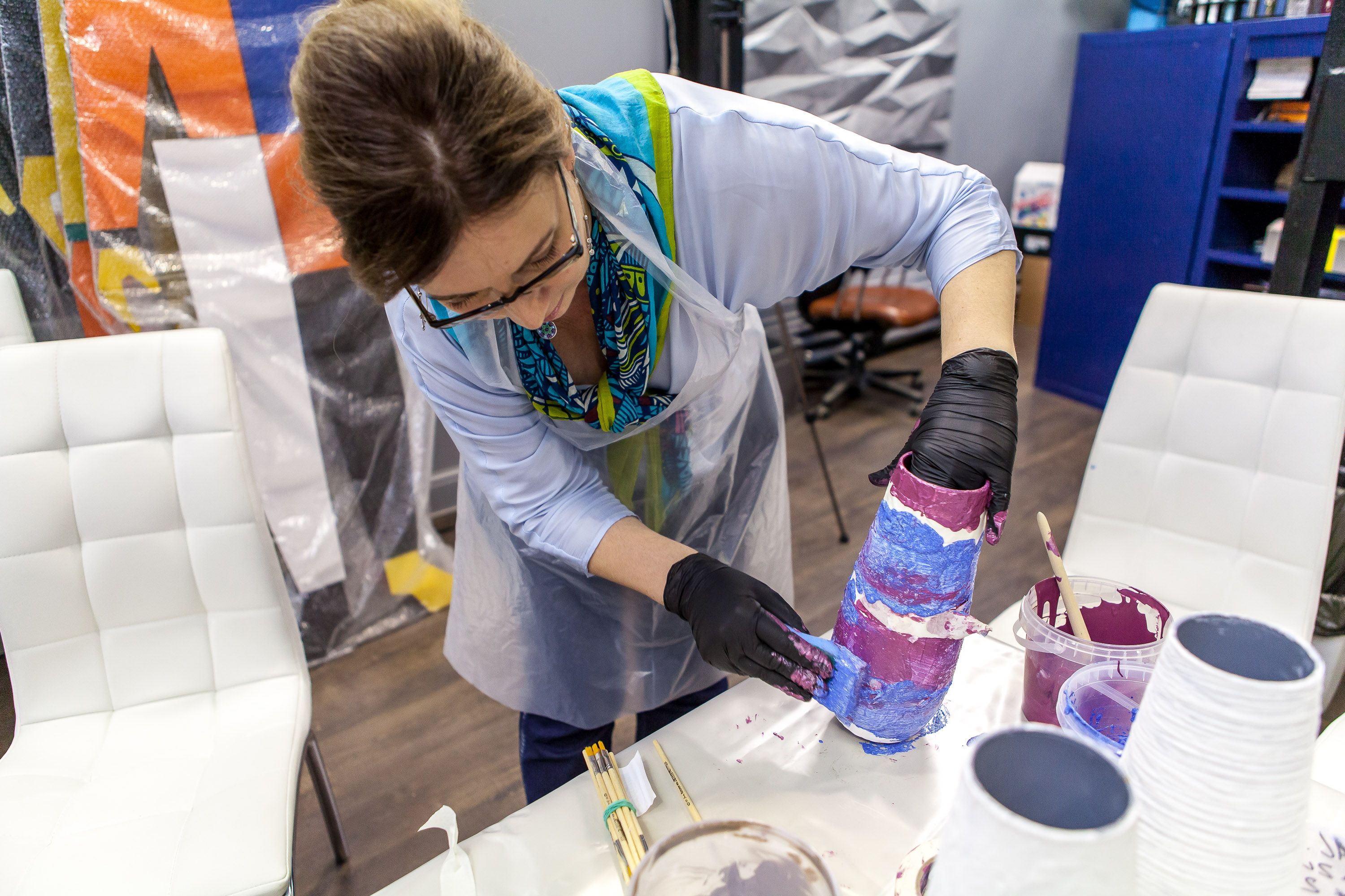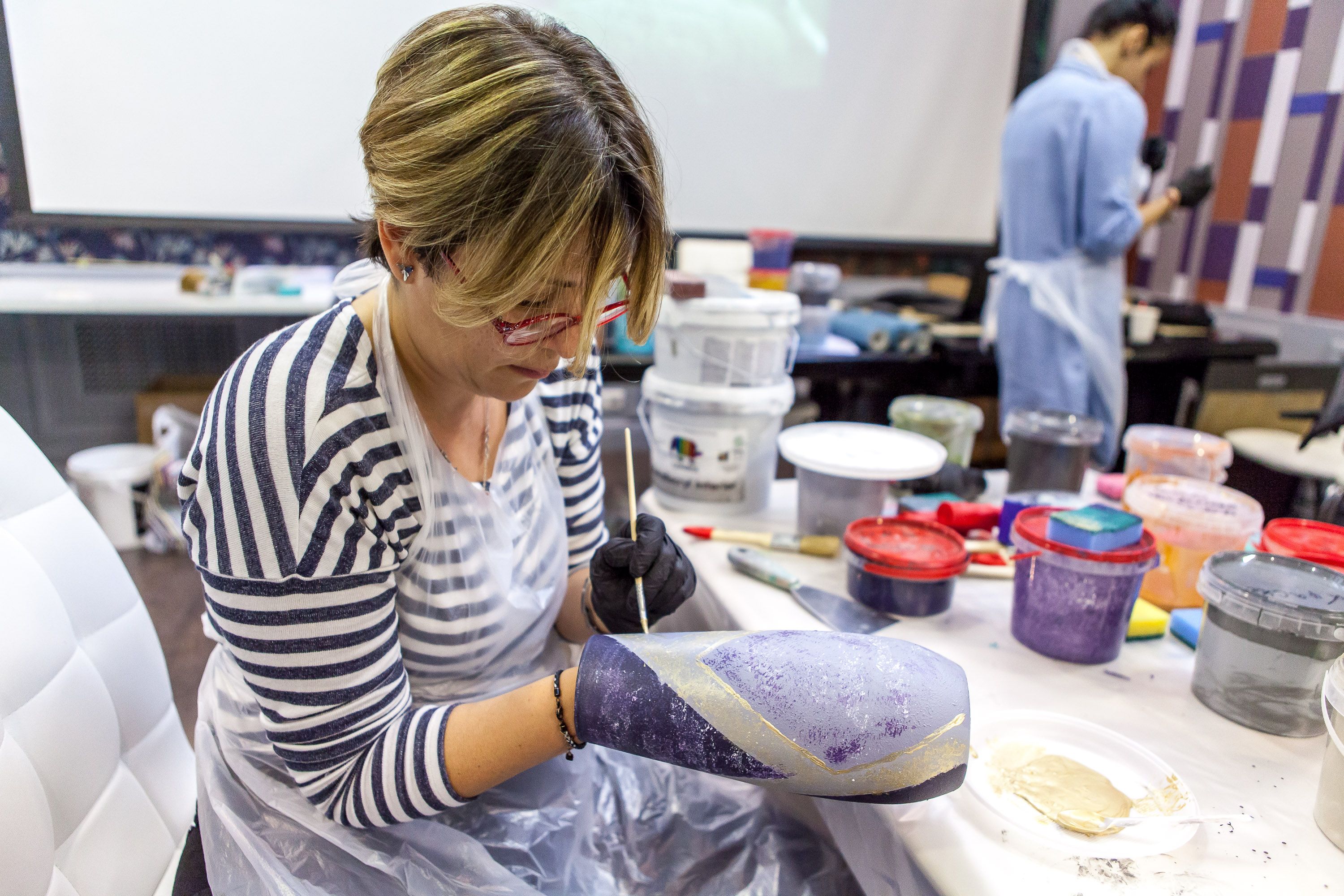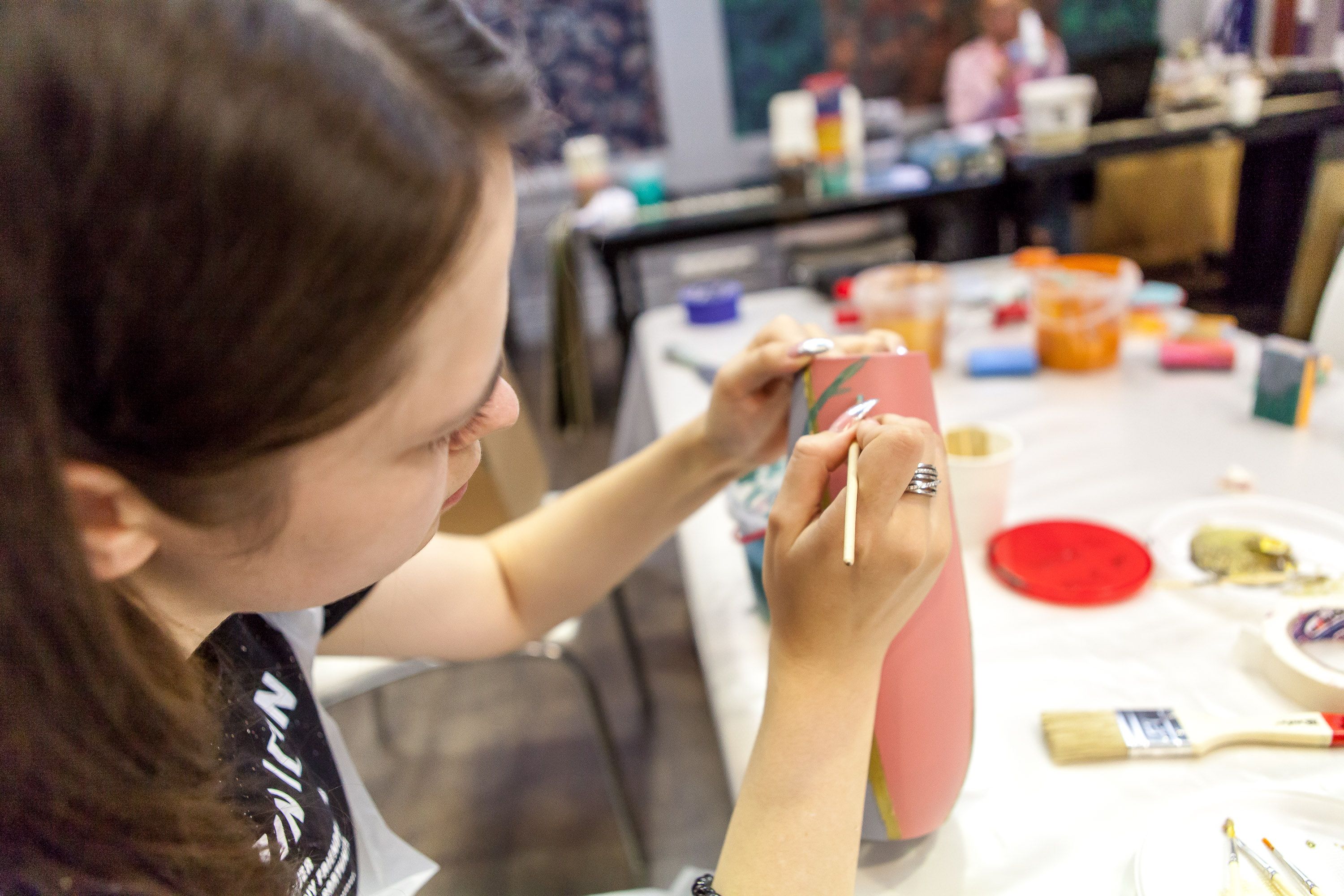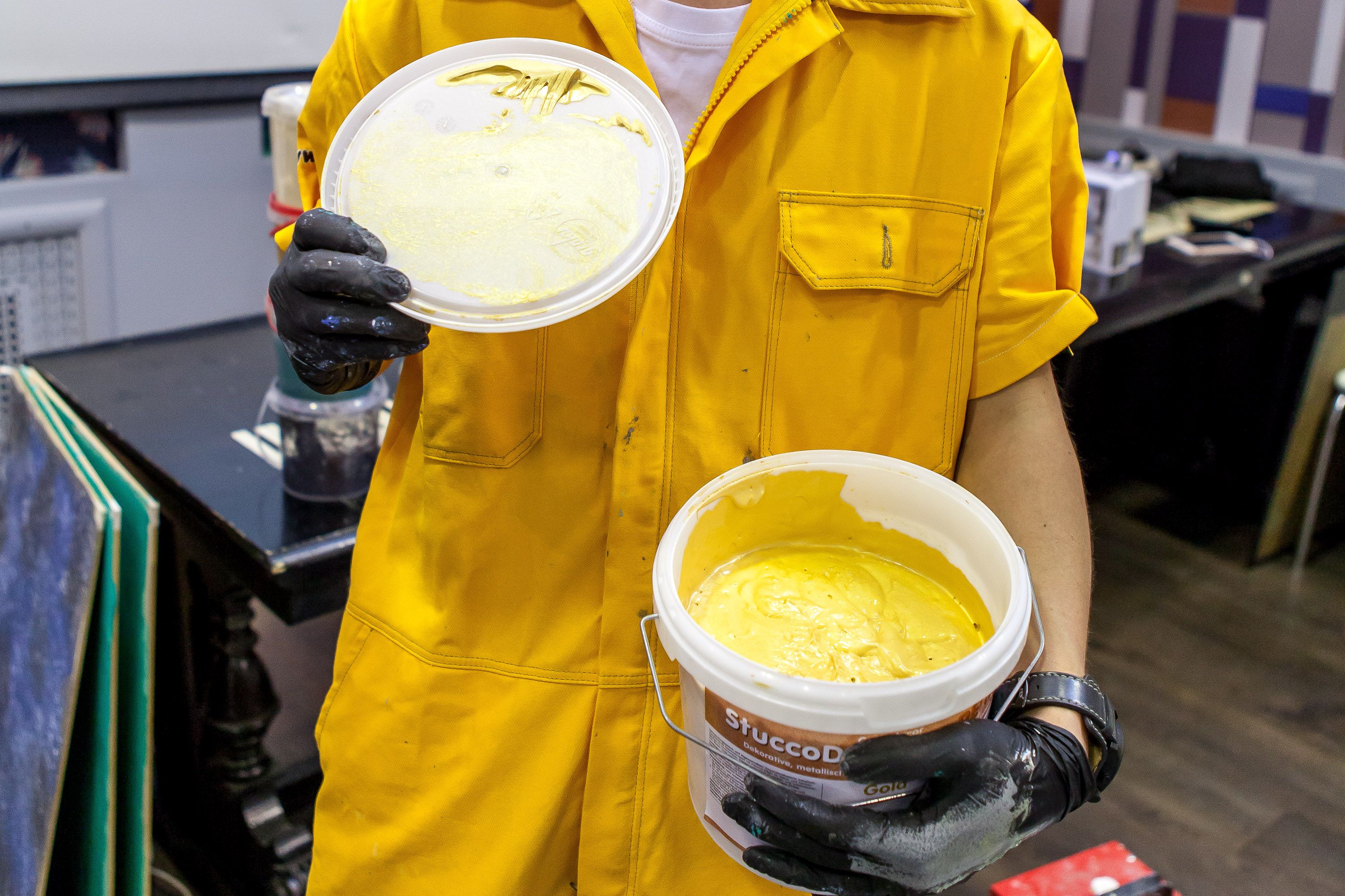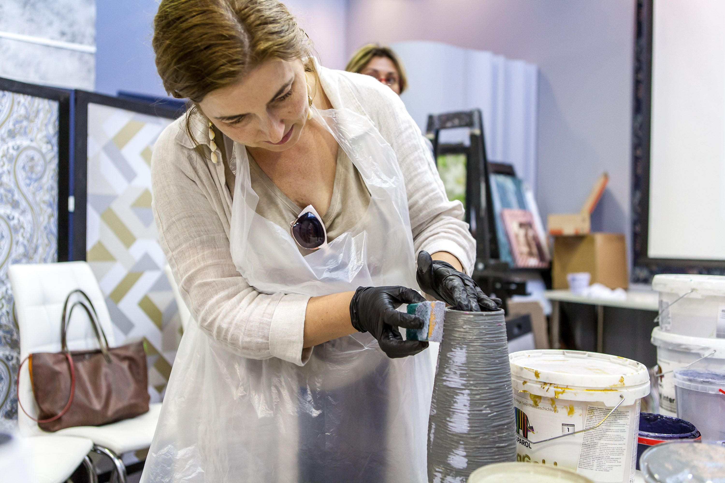 На творческом мастер-классе в Центре Дизайна Мануфактура 5 гости познакомились с возможностями декоративных штукатурок и украсили ими вазы.
