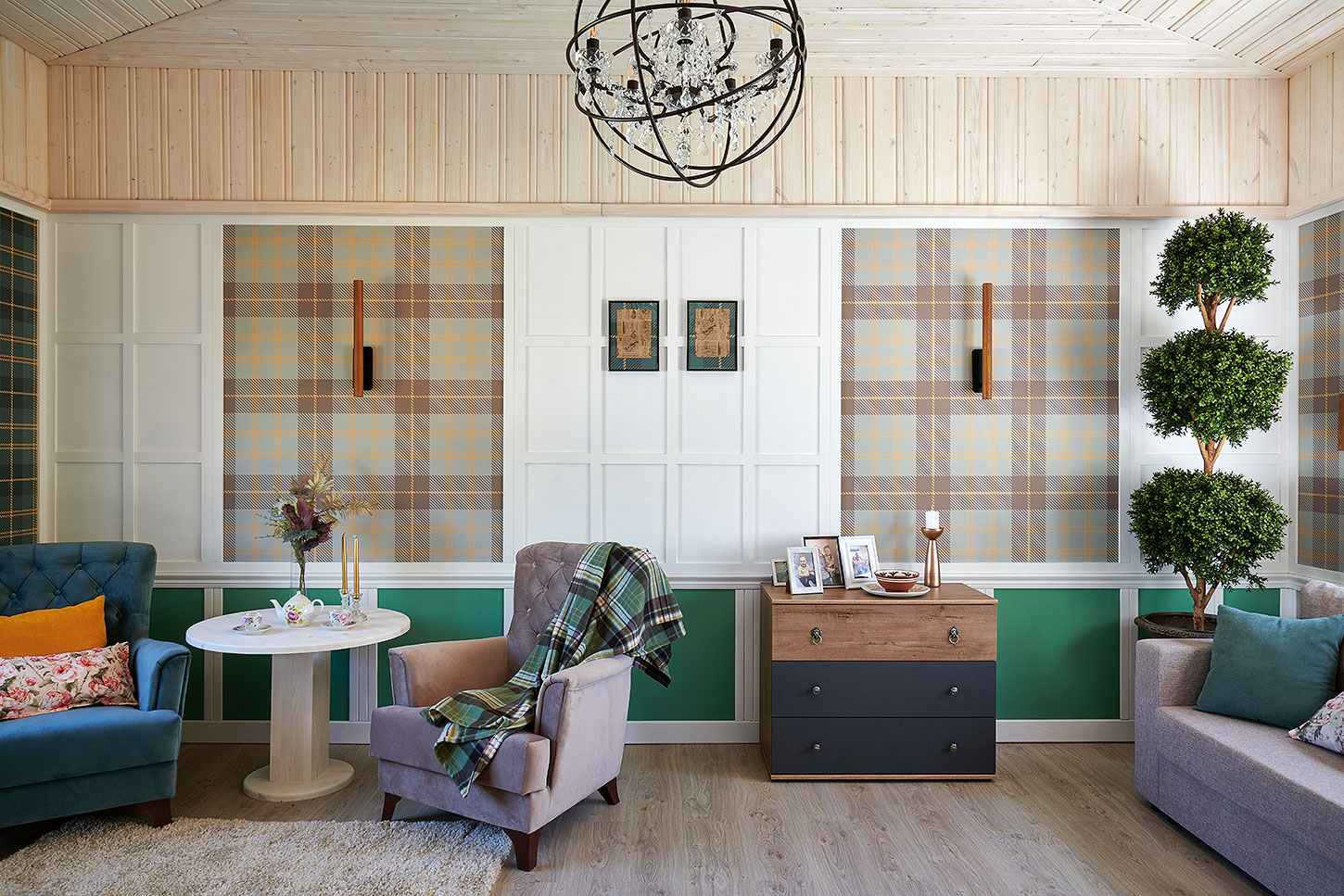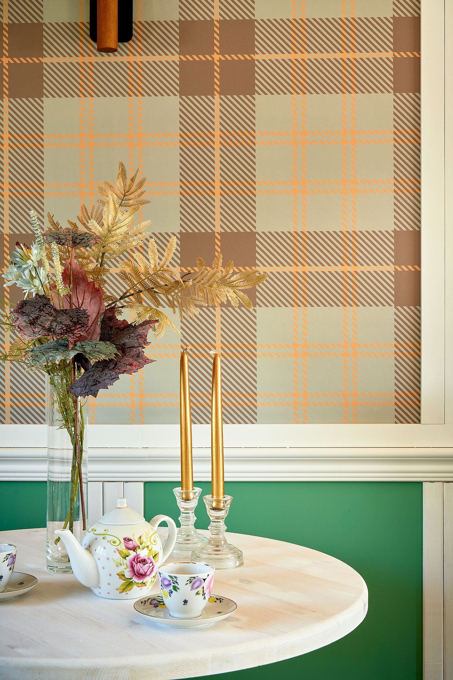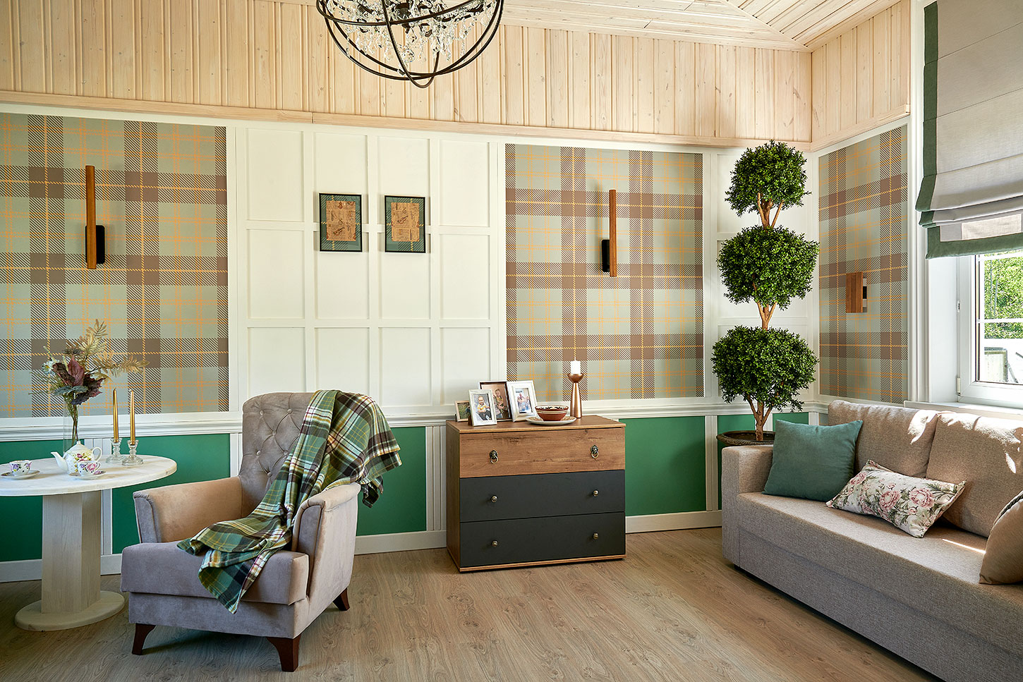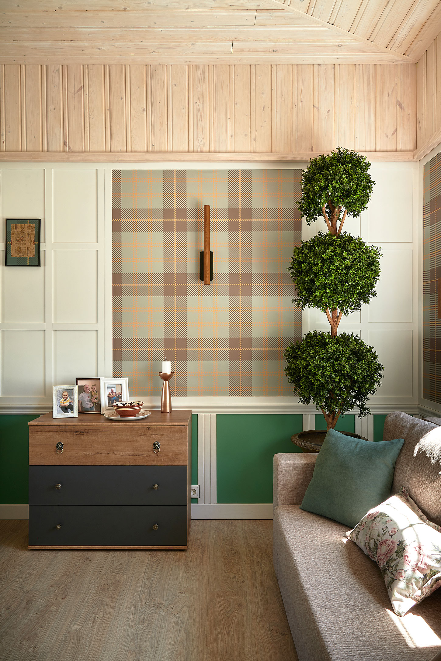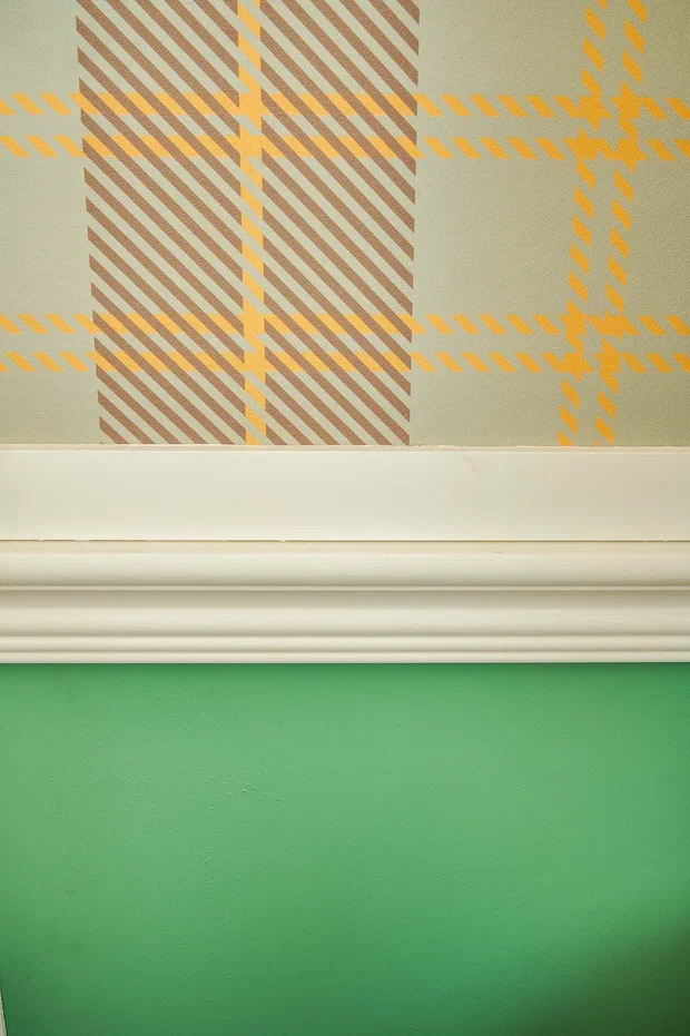 Стены симметрично декорированы молдингами, внутри которых обои «в клеточку». Часть стен внутри молдингов выкрашена белой краской Mallers Ultra Matte. В нижней части — зеленый цвет, освежающий интерьер.