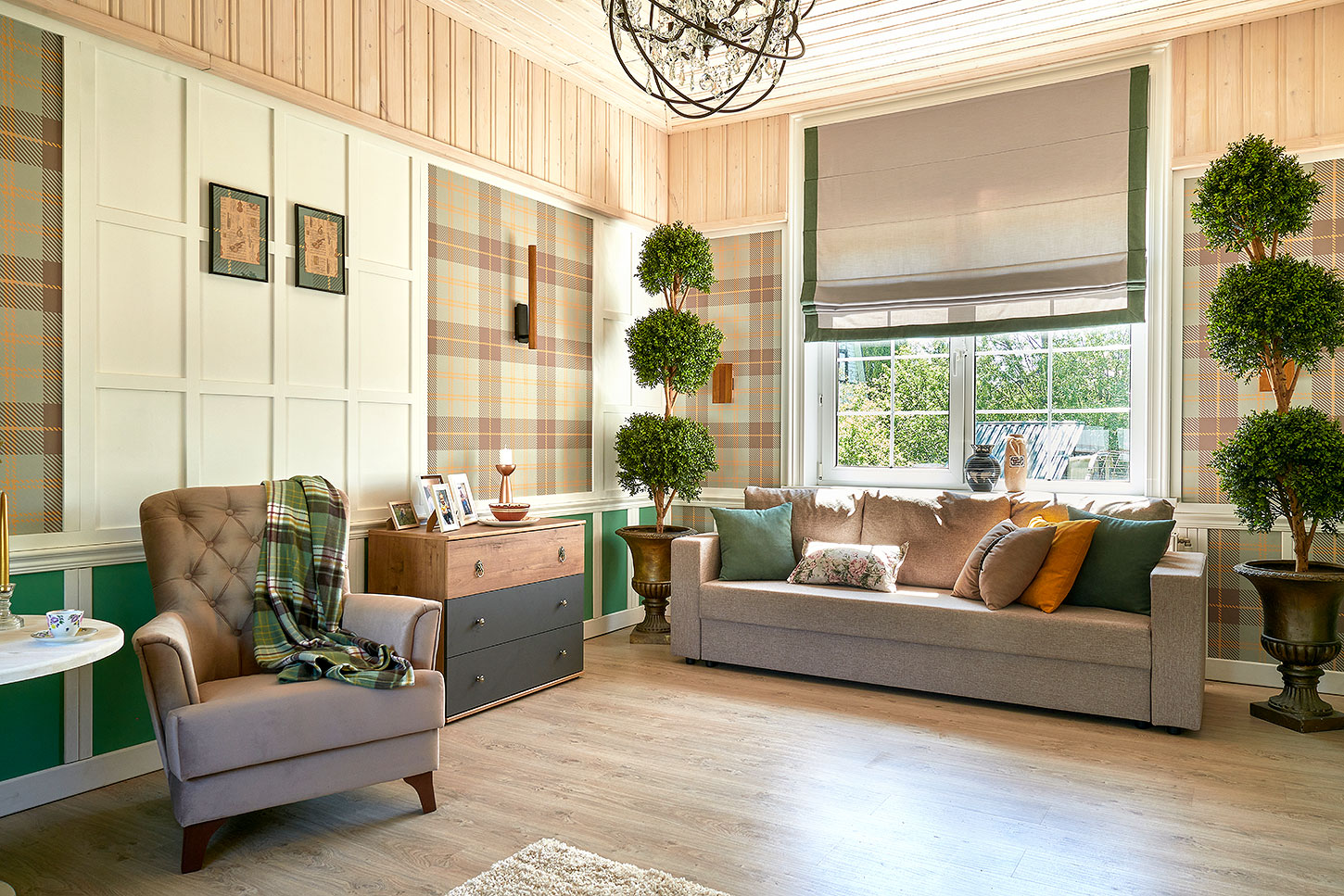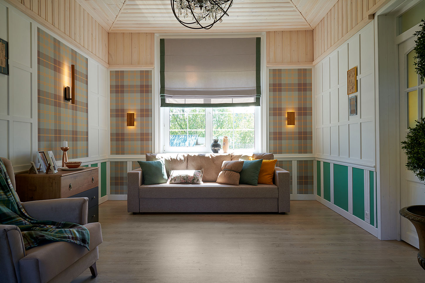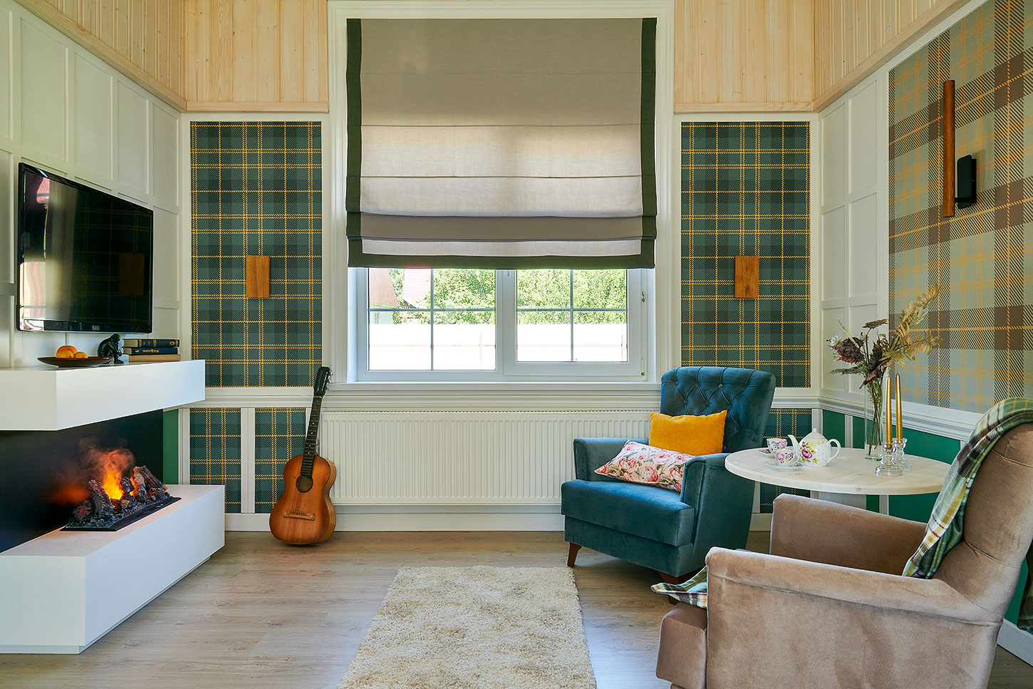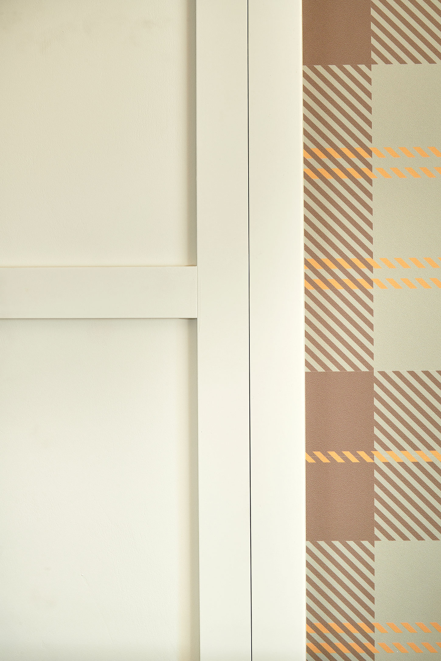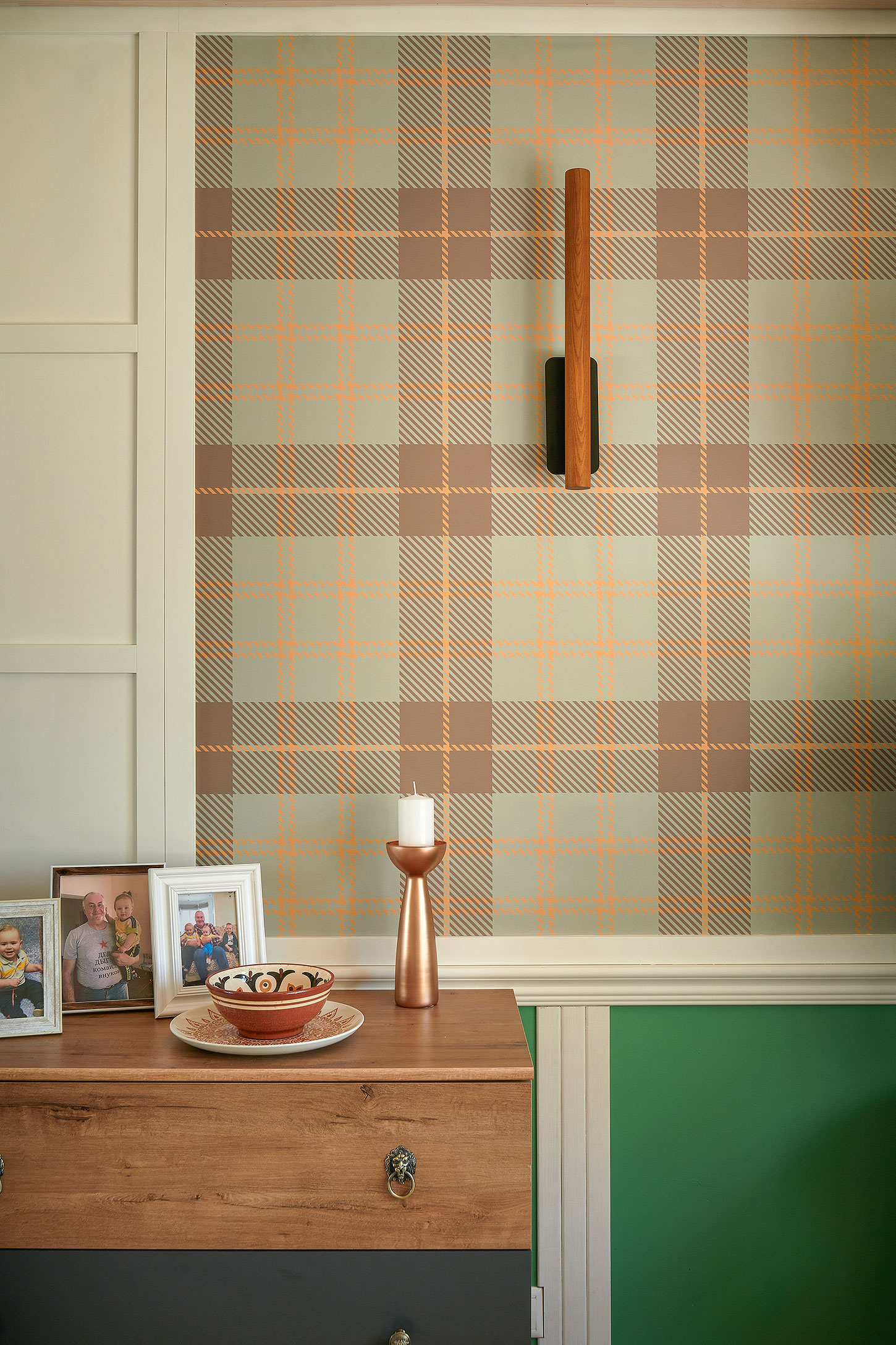 Стены симметрично декорированы молдингами, внутри которых обои «в клеточку». Часть стен внутри молдингов выкрашена белой краской Mallers Ultra Matte. В нижней части — зеленый цвет, освежающий интерьер.