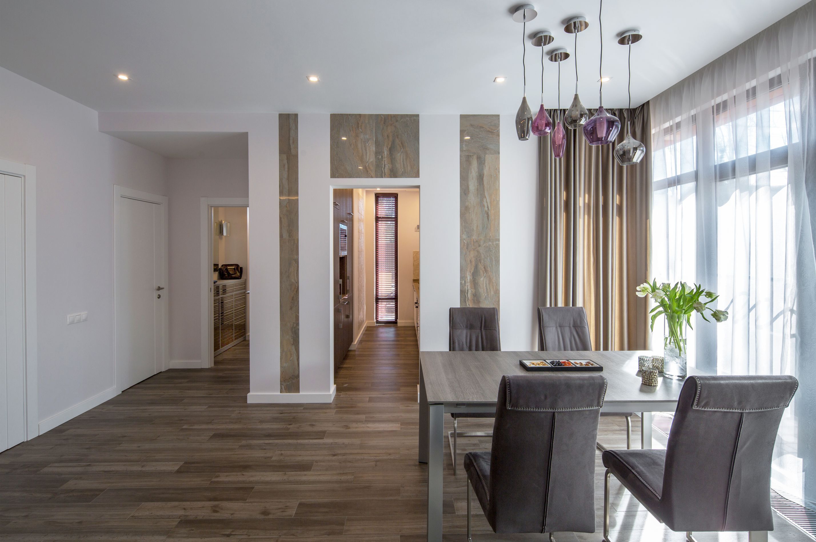 -Первый этаж мы сделали достаточно открытым: общая гостиная для встреч с друзьями, общая столовая и кухня, которую мы даже не стали закрывать дверью. Стены здесь покрашены в белый цвет, который разбавлен контрастной мебелью. Акцент было решено сделать на фактуре натурального камня. Поэтому на стенах представлены панно из натурального камня.