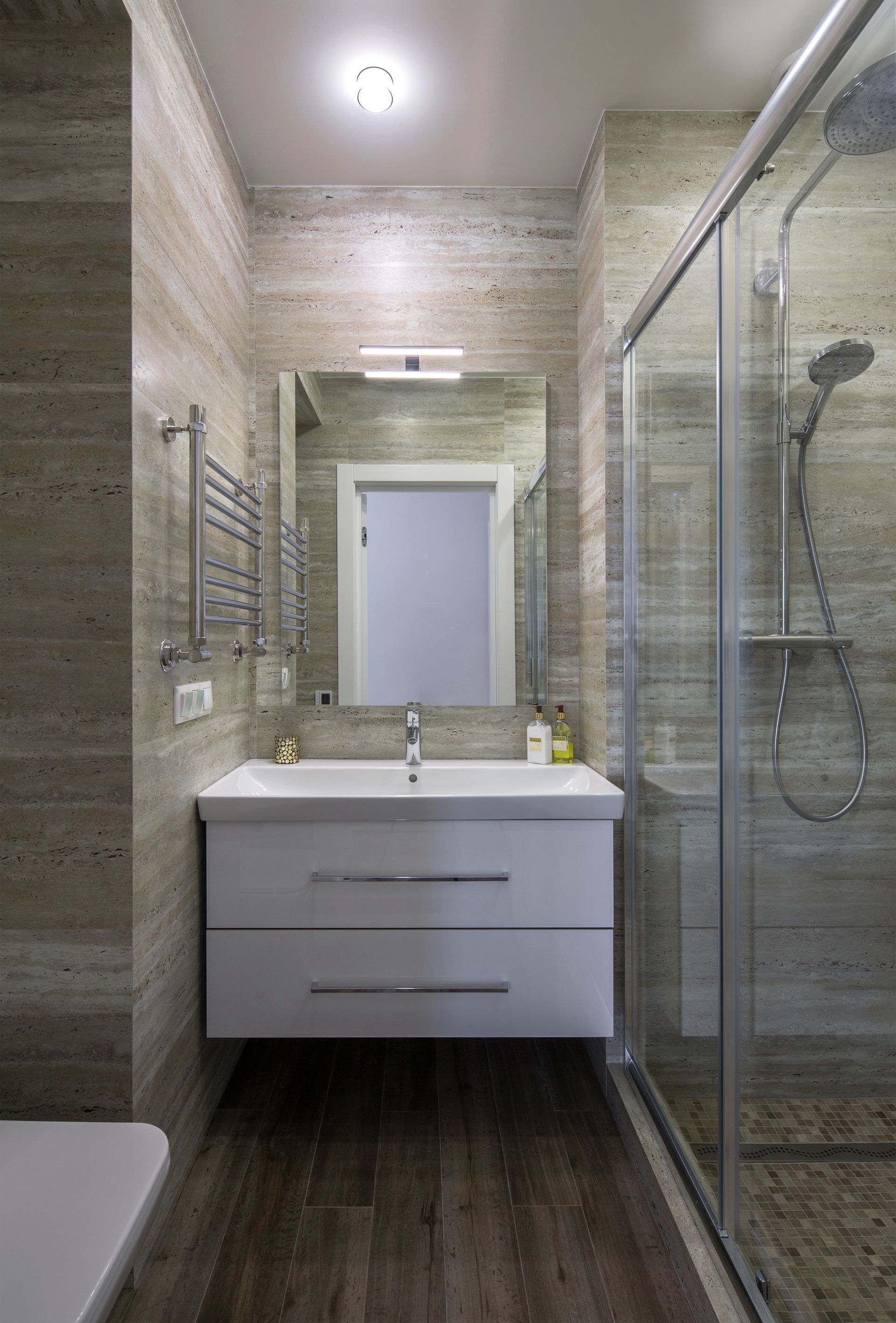 Фишкой стало оформление потолка: для него мы использовали паркетную доску, совпадающую по цвету с керамической плиткой на полу.